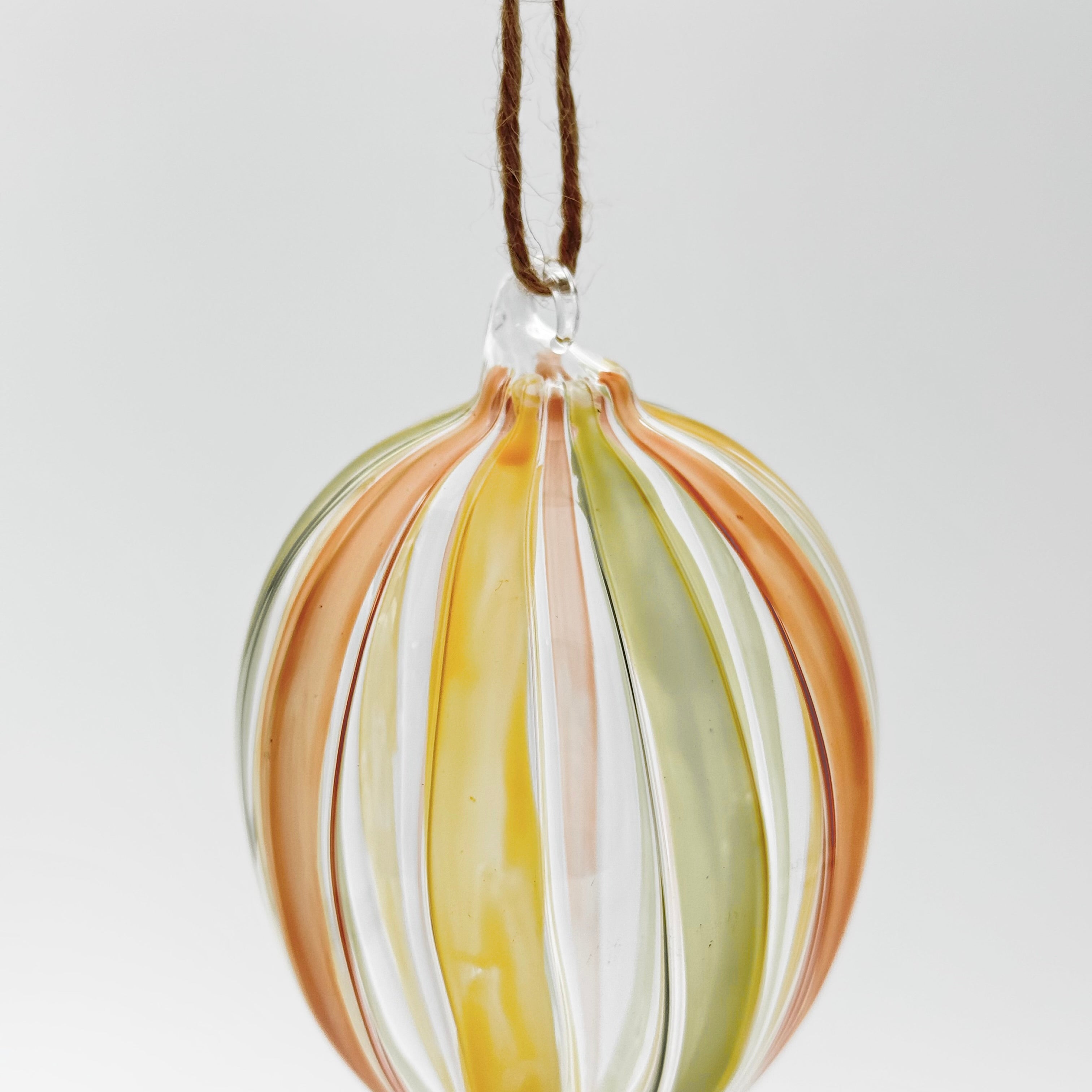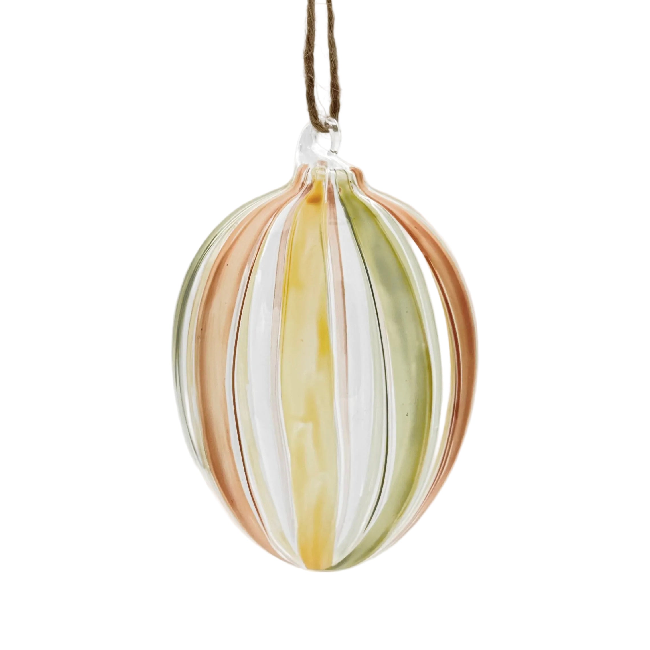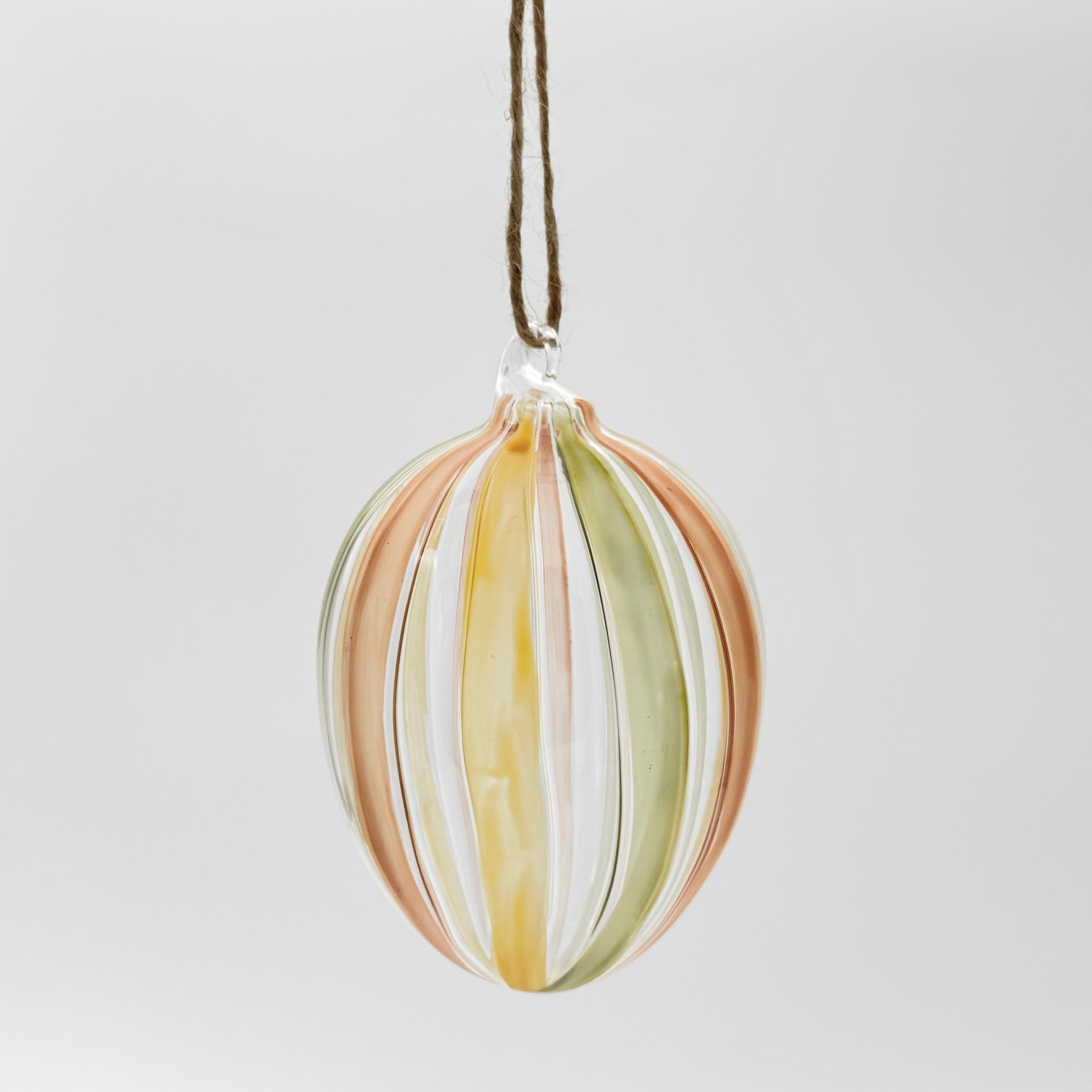Ett dekorativt, handmålat påskägg i glas som ger påskriset en levande och personlig känsla. De mjuka ränderna i grönt, gult och rosa löper över det klara glaset och skapar ett lekfullt men harmoniskt uttryck där färgerna fångar ljuset och ger dekorationen fint djup.