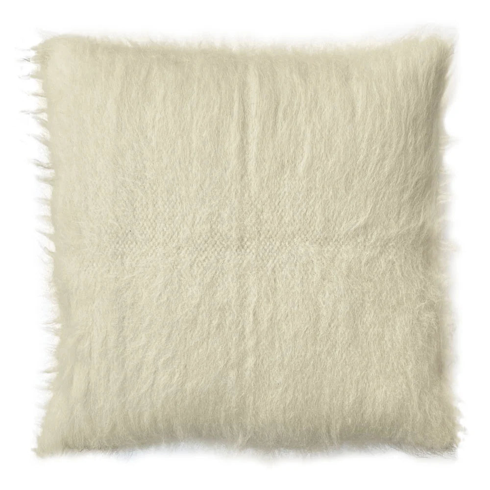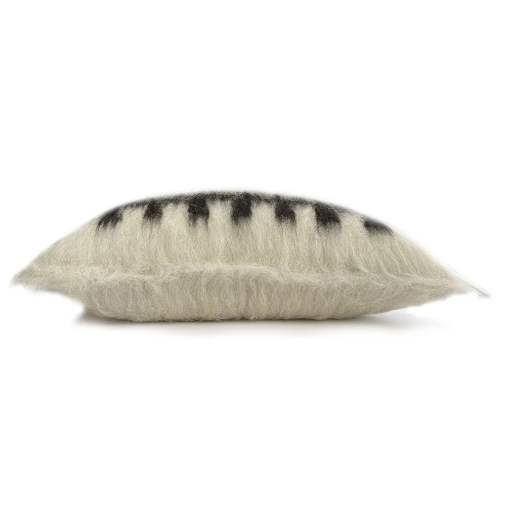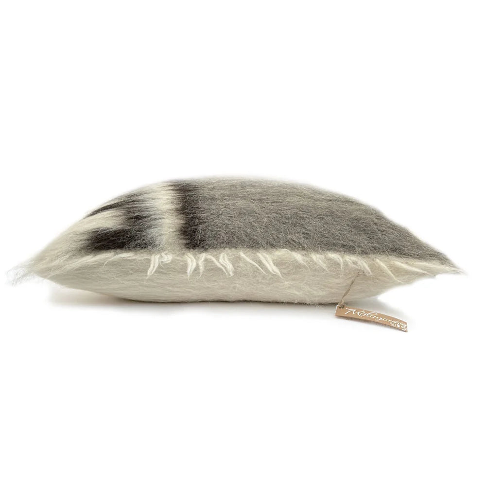 En stor fluffig handvävd golvkudde i ren ull med grafiskt mönster i grått och brunt. Den är mjuk men stadig och fungerar både som extra sittplats och som dekorativ inredningsdetalj i vardagsrum, läshörna eller lounge-miljö.