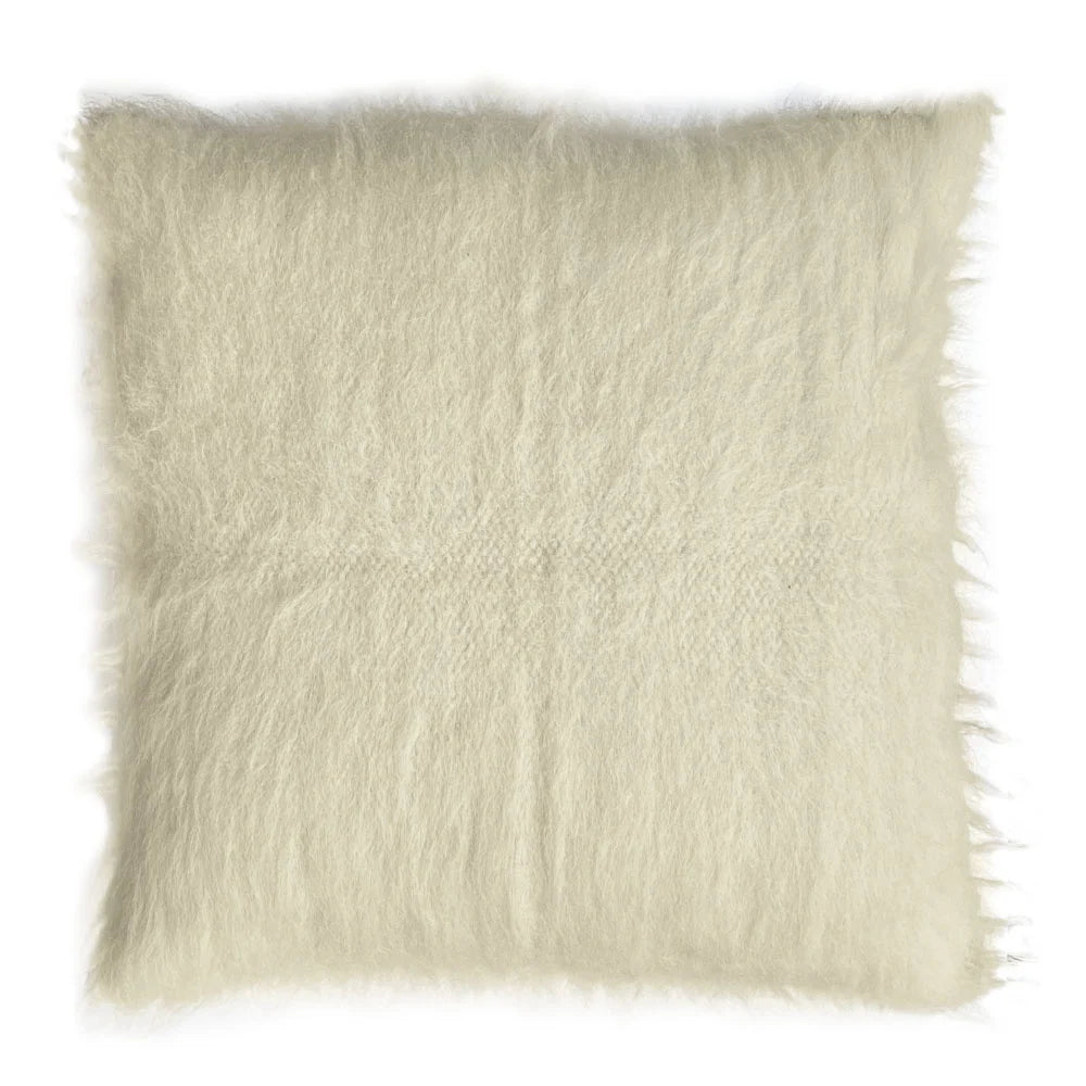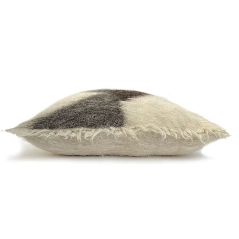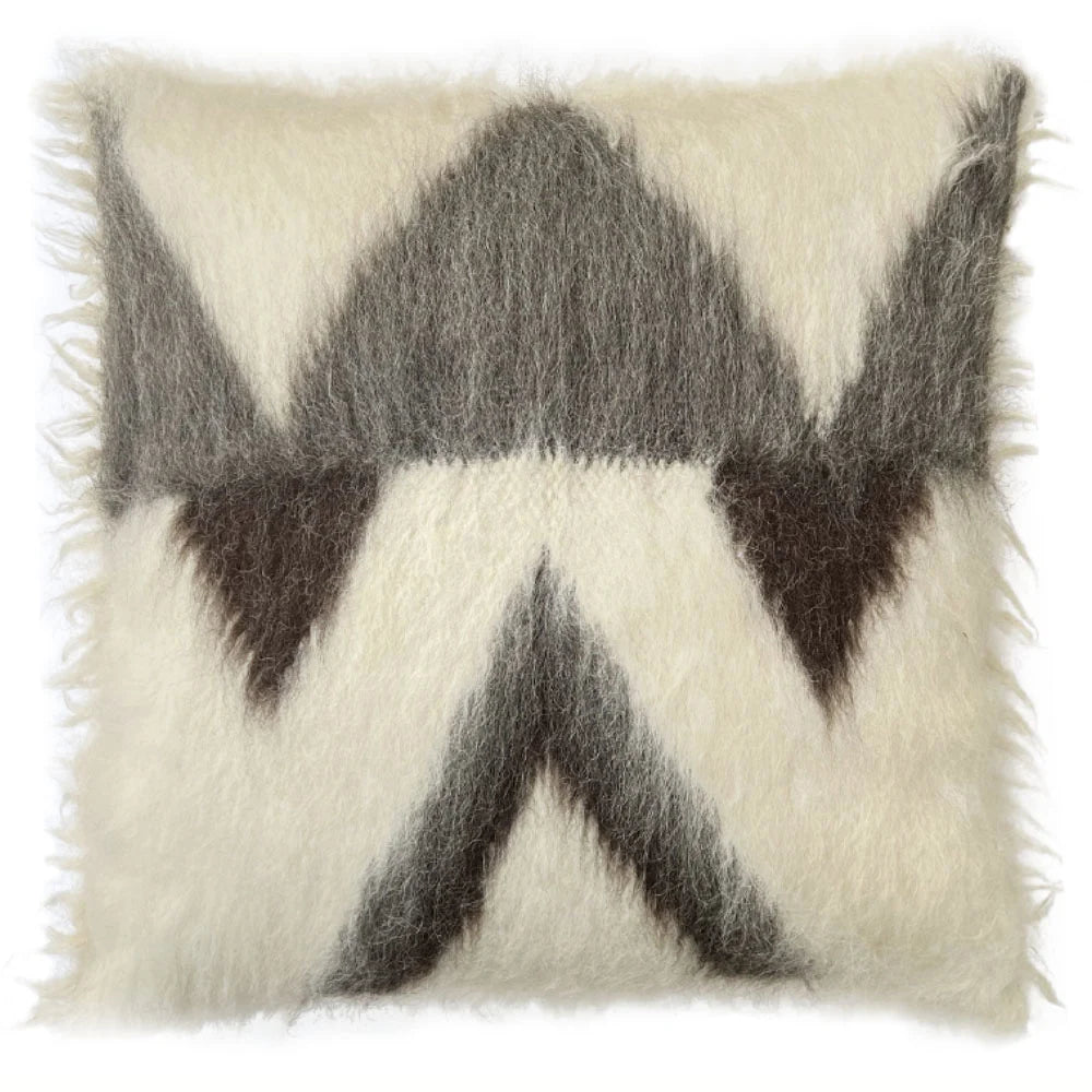 En stor fluffig handvävd golvkudde i ren ull med grafiskt mönster i grått och brunt. Den är mjuk men stadig och fungerar både som extra sittplats och som dekorativ inredningsdetalj i vardagsrum, läshörna eller lounge-miljö.
