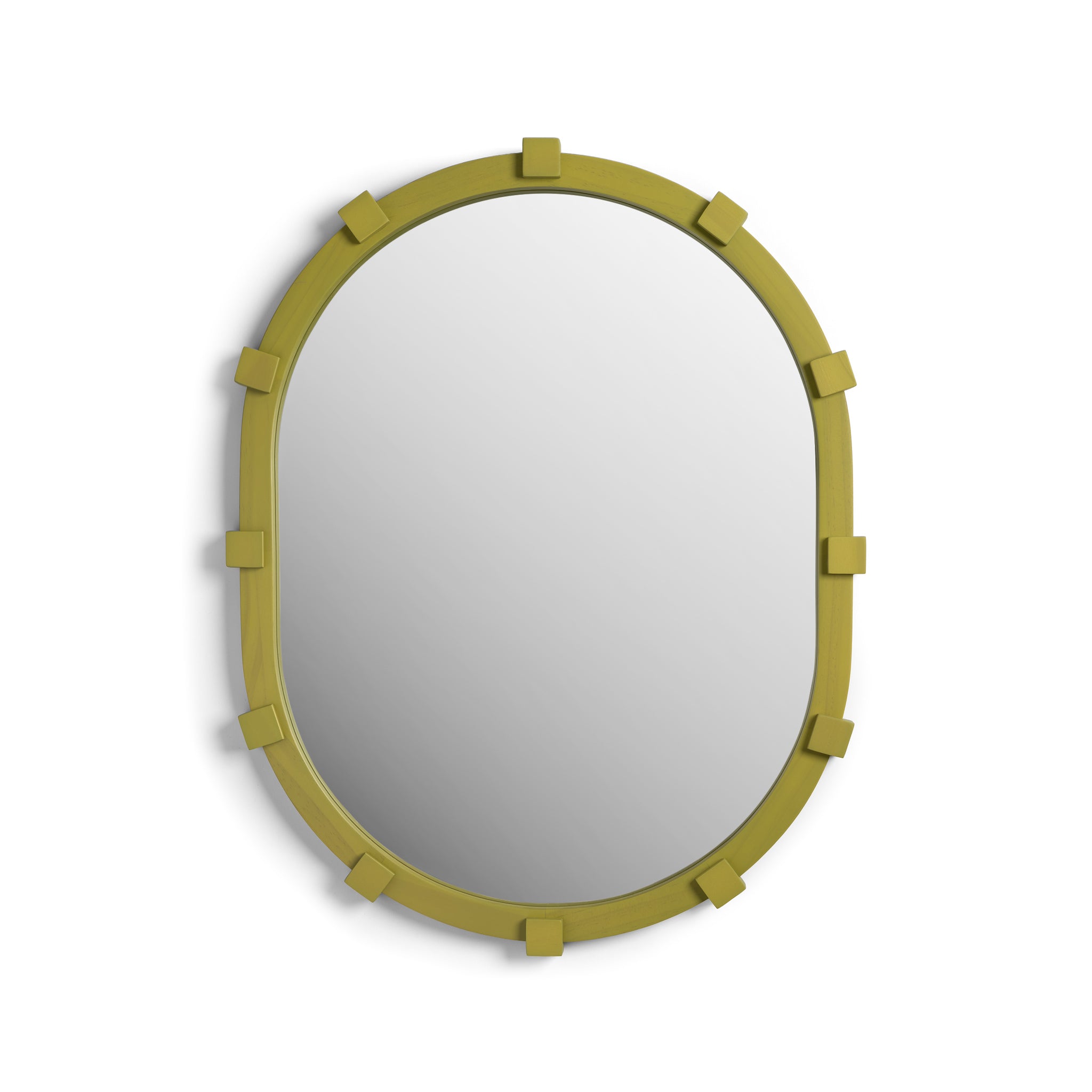 Mirror Chunk Oval Green från &Klevering är en dekorativ spegel inspirerad av folklig möbeldesign där upprepade dekorativa former skapar ett karakteristiskt uttryck. Med en subtil blinkning till kubismen kombinerar spegeln lekfull formgivning med ett tidlöst utseende. Den gröna ramen i furu ger värme och karaktär och gör spegeln till ett dekorativt inslag i hall, sovrum eller vardagsrum.