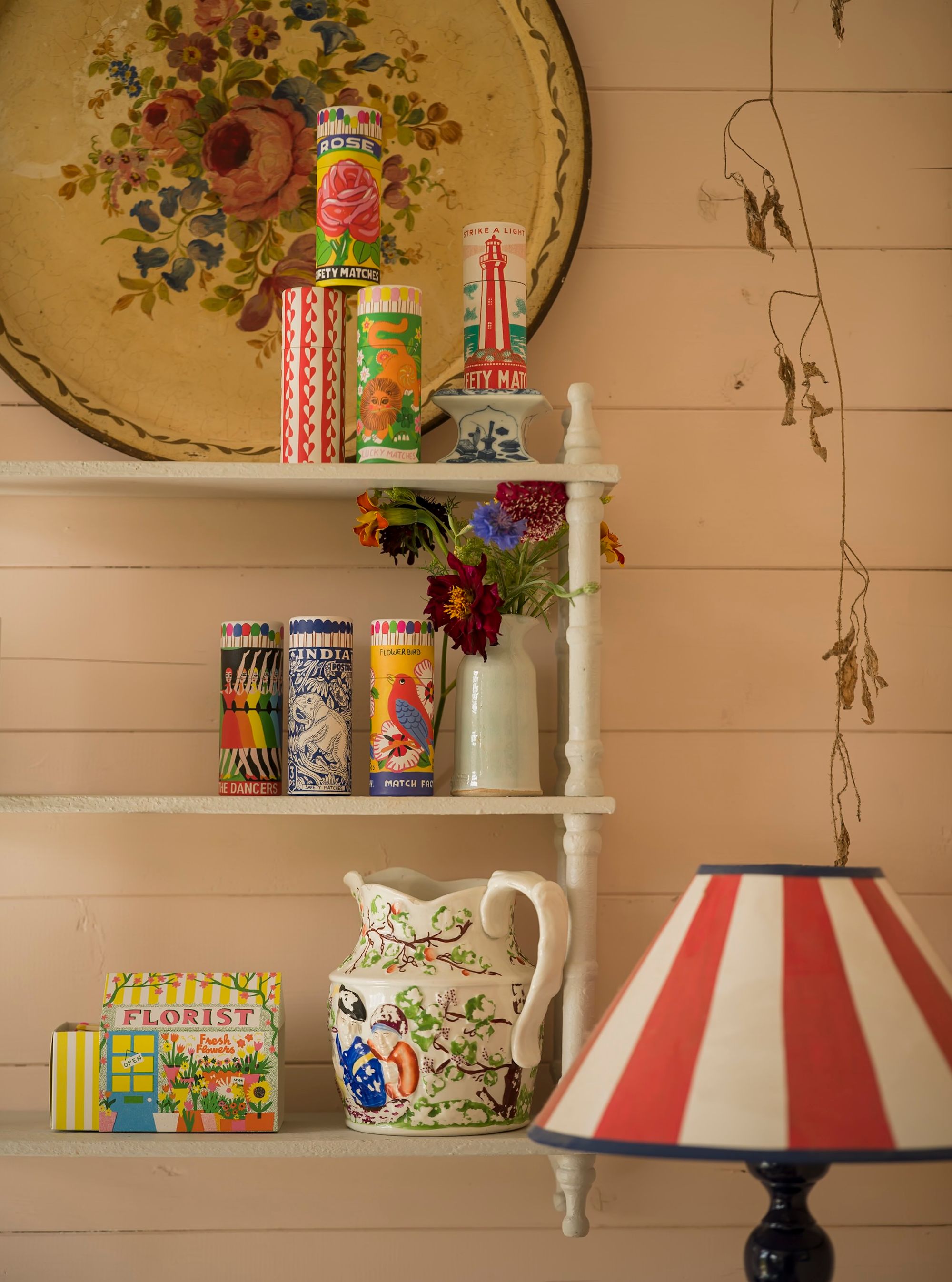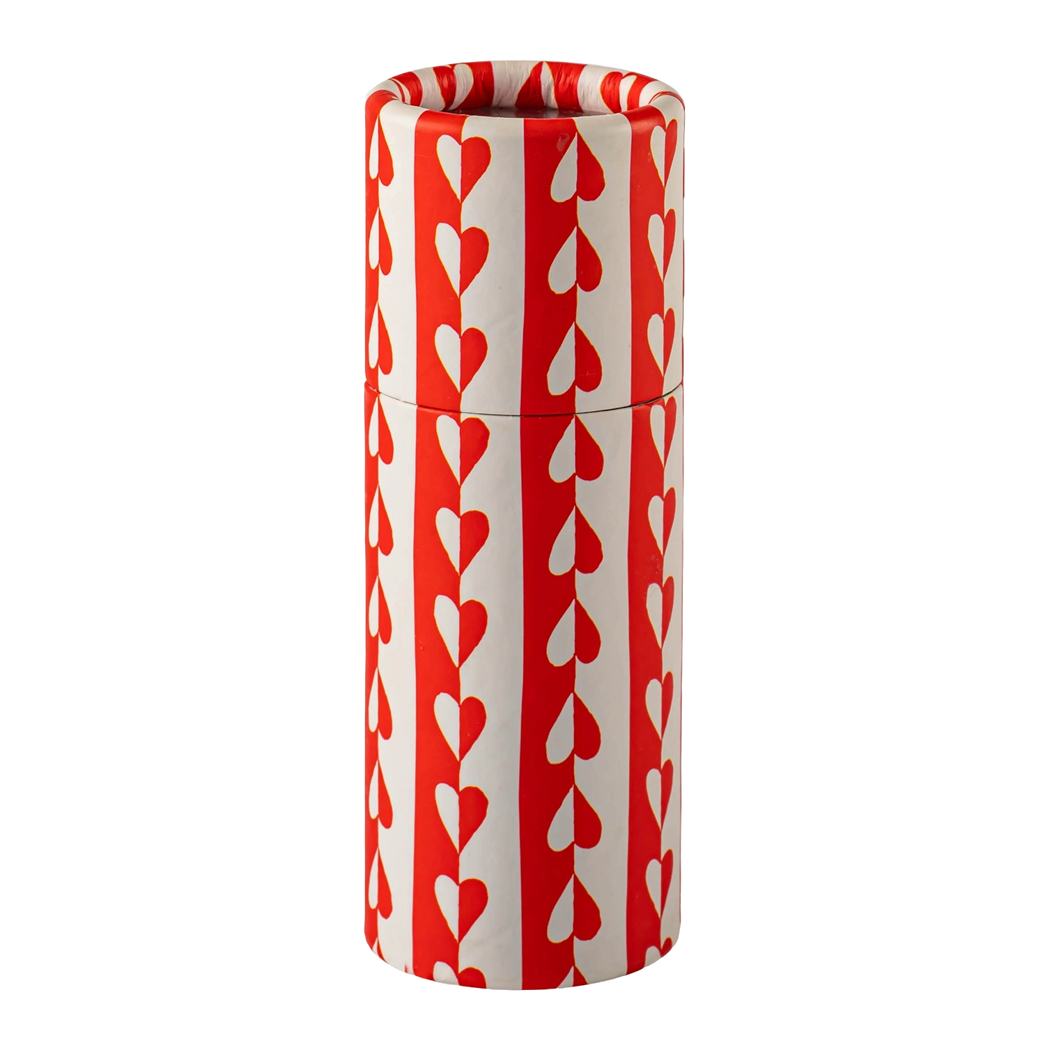Lyxtändstickor från brittiska Archivist – cylinderformad ask med rader av röda hjärtan mot vit botten. Ett dekorativt och fyndigt tillbehör för tändning vid ljus, som gå‑bort‑present eller elegant detalj hemma.