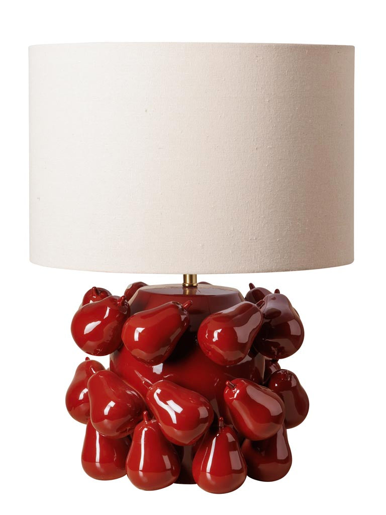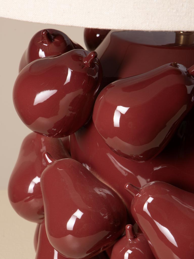 Denna bordslampa är ett sant blickfång med humor och sofistikation. Den djupröda nyansen ger lampan ett lyxigt uttryck, medan den skulpturala foten—rikligt täckt av päron—skapar ett taktilt, dekorativt djup. Som tänd bjuder lampan på ett behagligt, atmosfäriskt sken som passar lika fint på sideboardet i vardagsrummet som på sängbordet eller i hallen. Den är lätt att kombinera med såväl moderna som klassiska möbler och fungerar utmärkt som accent som binder ihop färger och material i inredningen.