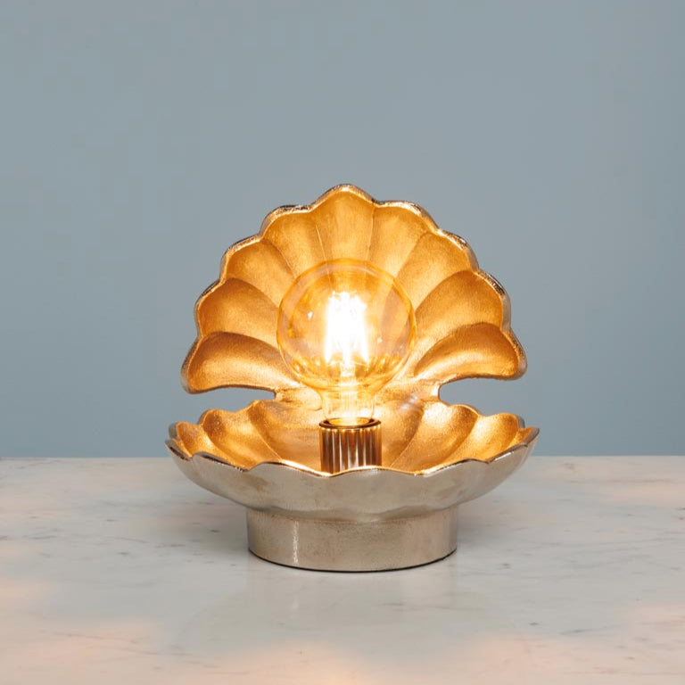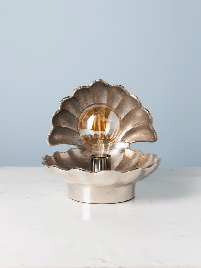 Bordslampa formad som en öppen snäcka i glänsande silverfinish.
