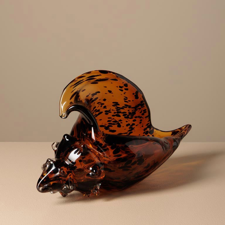Det här dekorationsobjektet kombinerar havets organiska former med ett djuriskt leopardmönster i glas – en oväntad mix som både känns elegant och lekfull. Placera snäckan solo som ett starkt statement eller låt den ingå i en kurerad grupp med böcker, ljus och konstföremål. Mönstret skapar liv och djup när ljuset rör sig över ytan, vilket gör den lika effektfull i dagsljus som i kvällsbelysning. Modellen finns i två storlekar (den här är den större), så att du enkelt kan skapa balans eller ett blickfång i par.