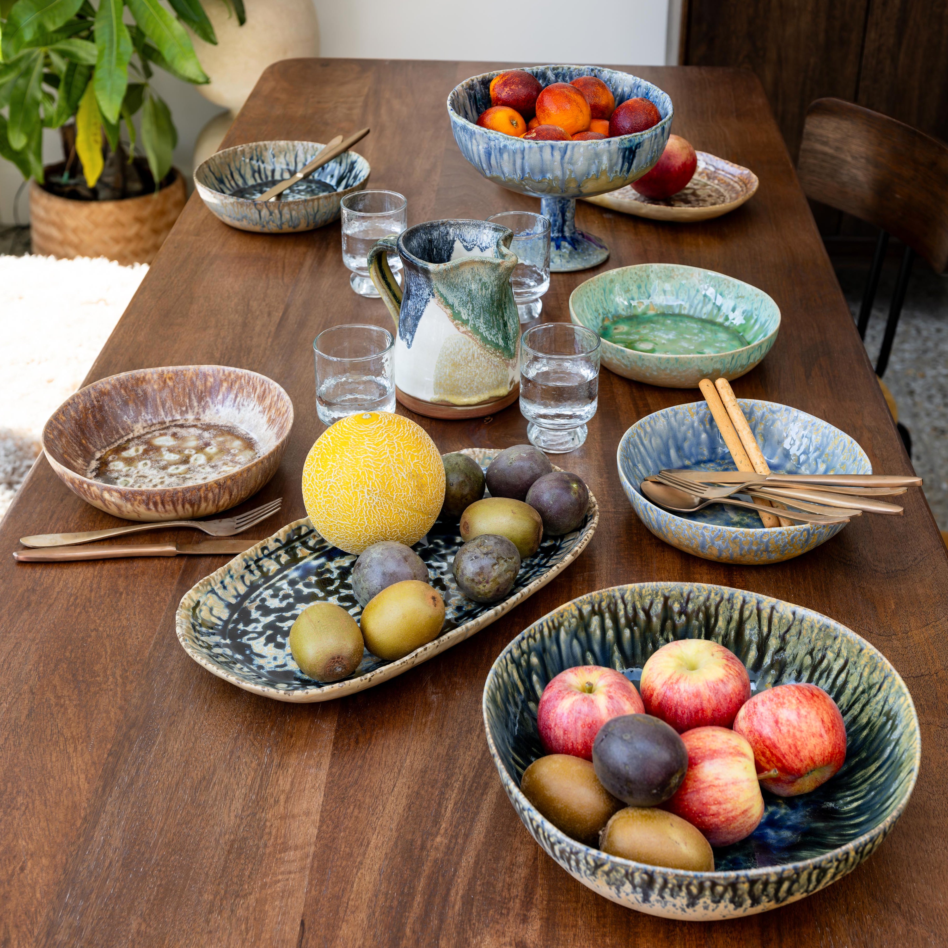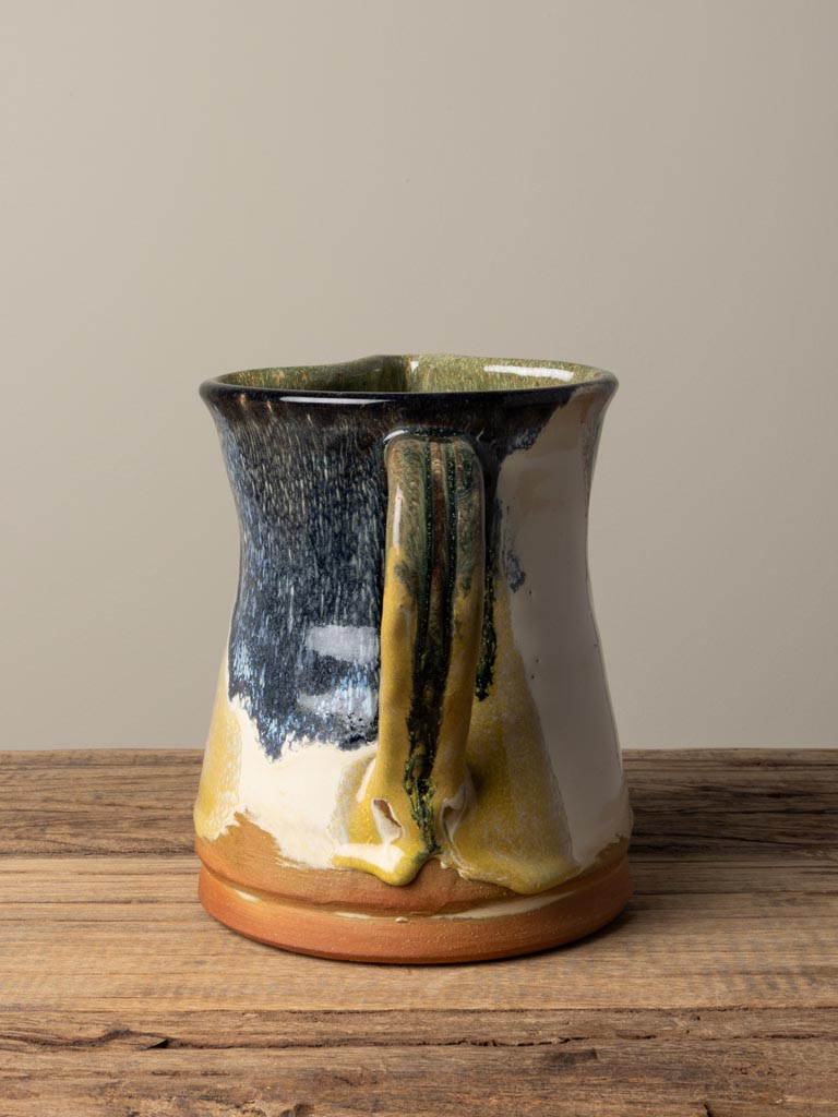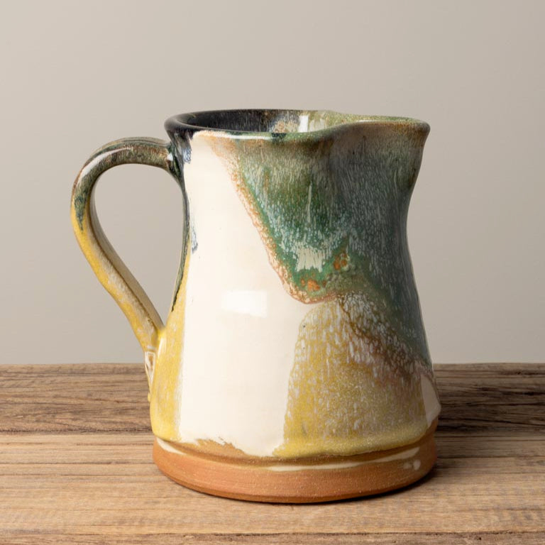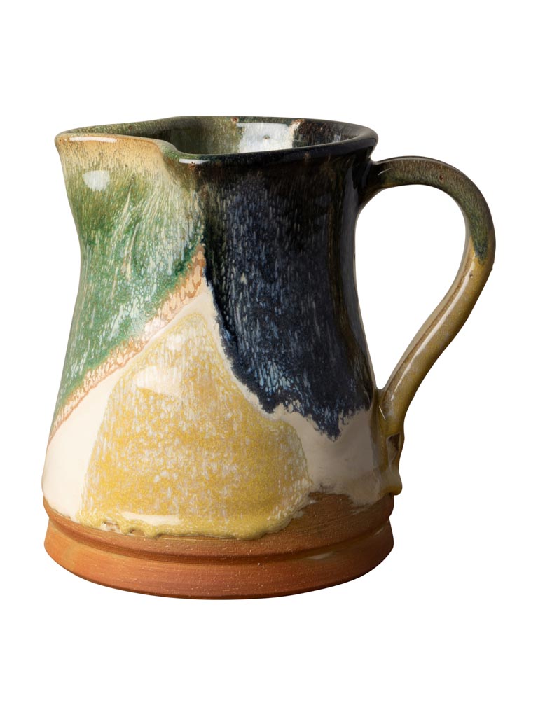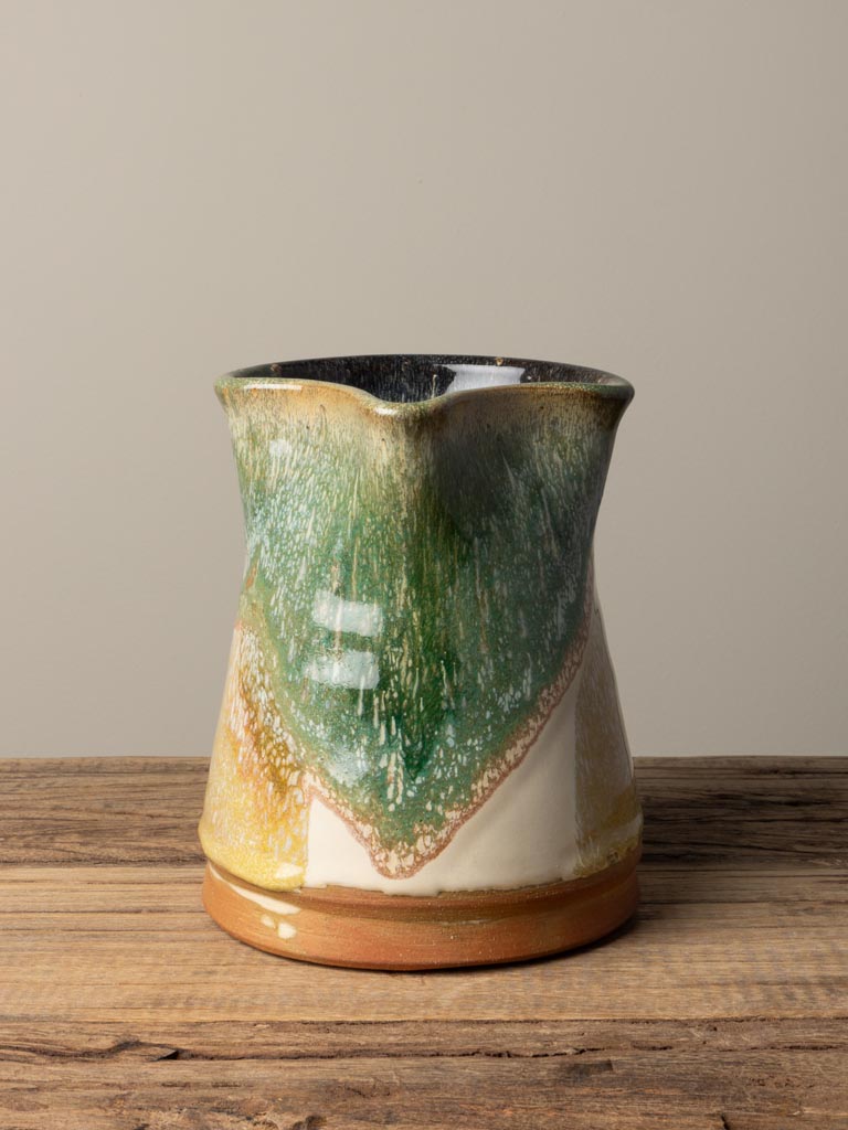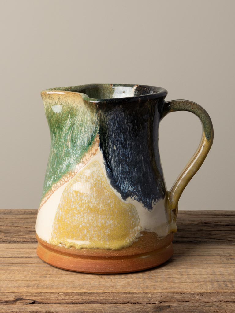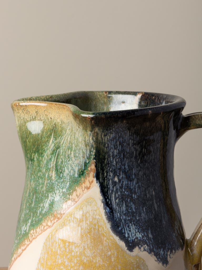 En handgjord keramik-kanna med levande färgspel i grönt, blått, gult och naturlig terrakotta. Den rustika känslan kombinerad med de intensiva glasyrerna gör den till en dekorativ och funktionell detalj på bordet – perfekt för vatten, saft eller som vas för blommor.