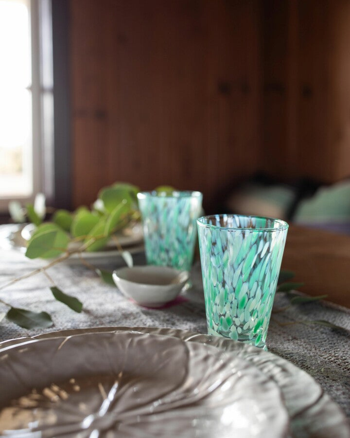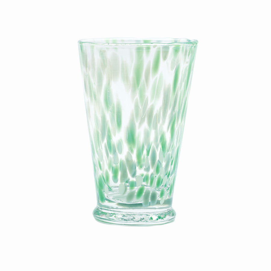 Ett tidlöst glas med en modern twist. Dessa glas, med sin traditionella venetianska design och festliga konfettistänk, tillverkas i ett litet familjeägt glashantverk som gått i arv i generationer.