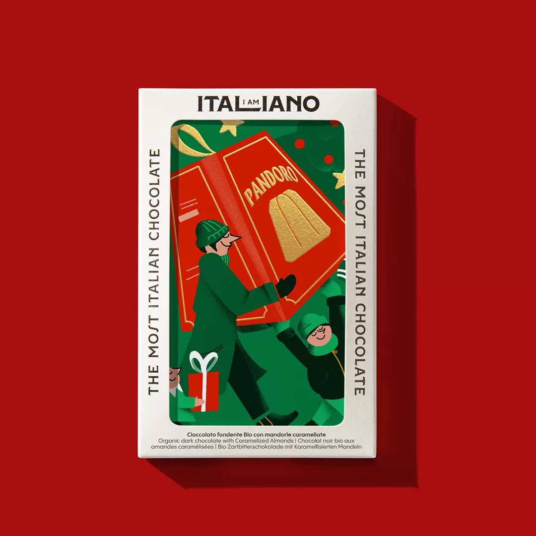 Förpackningen är lika ikonisk som smaken: ett vackert illustrerat vykort som hyllar ett av de mest älskade symbolerna för den italienska julen – Pandoro. Illustrationen ansluter till den italienska visuella traditionen där gester, symboler och högtidsmotiv är en självklar del av kulturen, och fungerar som en samlarvärd julhälsning. Vykortet kan skickas som det är eller användas som en personlig gåvohälsning, vilket gör produkten både dekorativ och meningsfull.