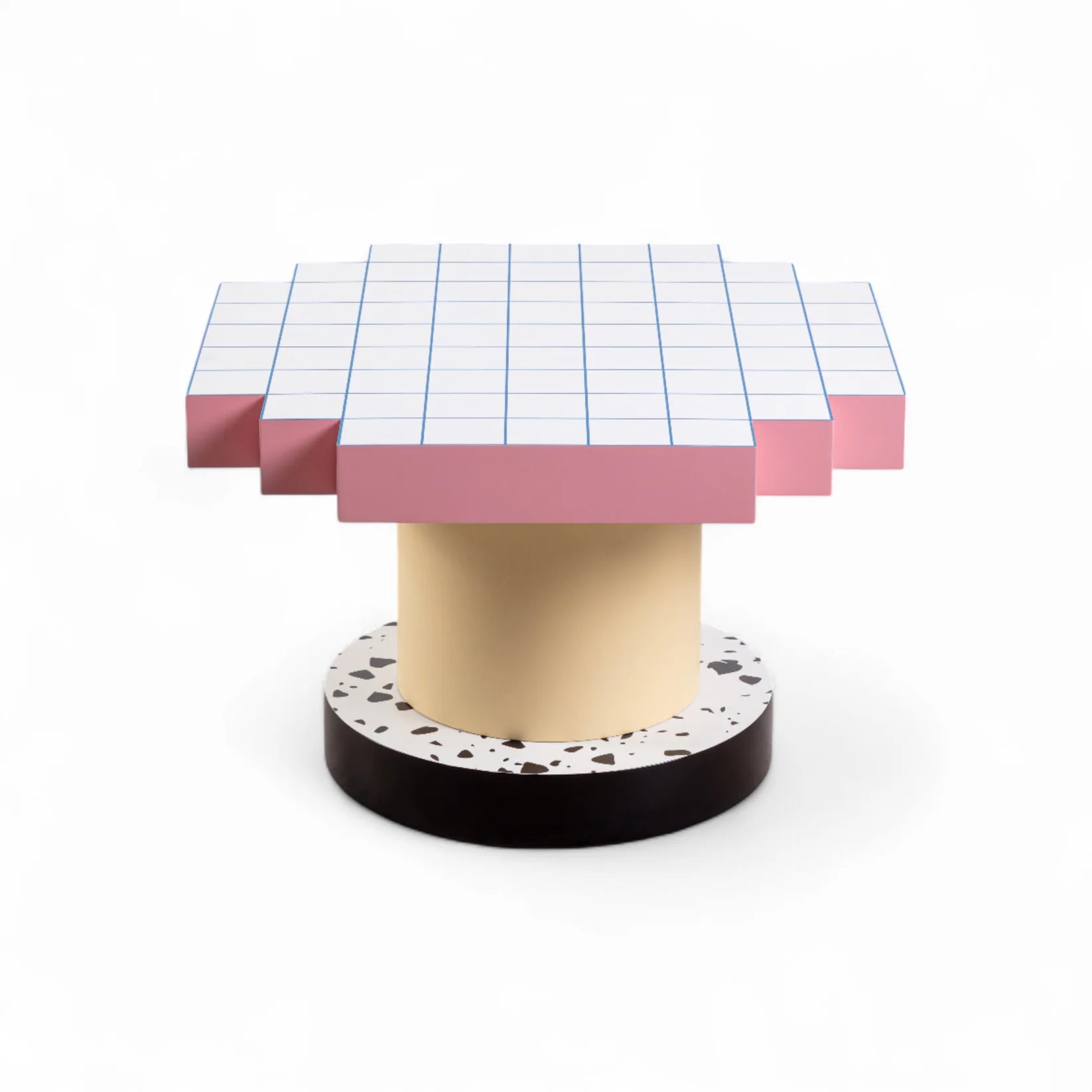 Bordet “Supercoffee Table Blue Grid” från Seletti är ett lekfullt och grafiskt starkt designobjekt som är en tydlig flört med Memphis-gruppens färgstarka och postmodernistiska formspråk. Bordet kombinerar 60-70-talsinspirerad geometri med en modern tolkning av 1980-talets radikala designuttryck, vilket gör det till ett visuellt statement i vilket rum som helst. Den rutmönstrade skivan ger bordet en distinkt, nästan illustrativ karaktär som både överraskar och harmoniserar i samtida miljöer.