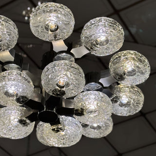 Parallellt med Nasons glaskreationer bidrog Gaetano Sciolari till Space Age-estetiken med sina ikoniska metallampor. Sciolari experimenterade med krom, mässing och aluminium för att skapa futuristiska taklampor och vägglampor där ljuset reflekterades och spreds på nya, dramatiska sätt. Hans design kompletterade Murano-glasets lekfulla former och färger och blev ett kännetecken för Space Age-lampornas glamour och innovation.