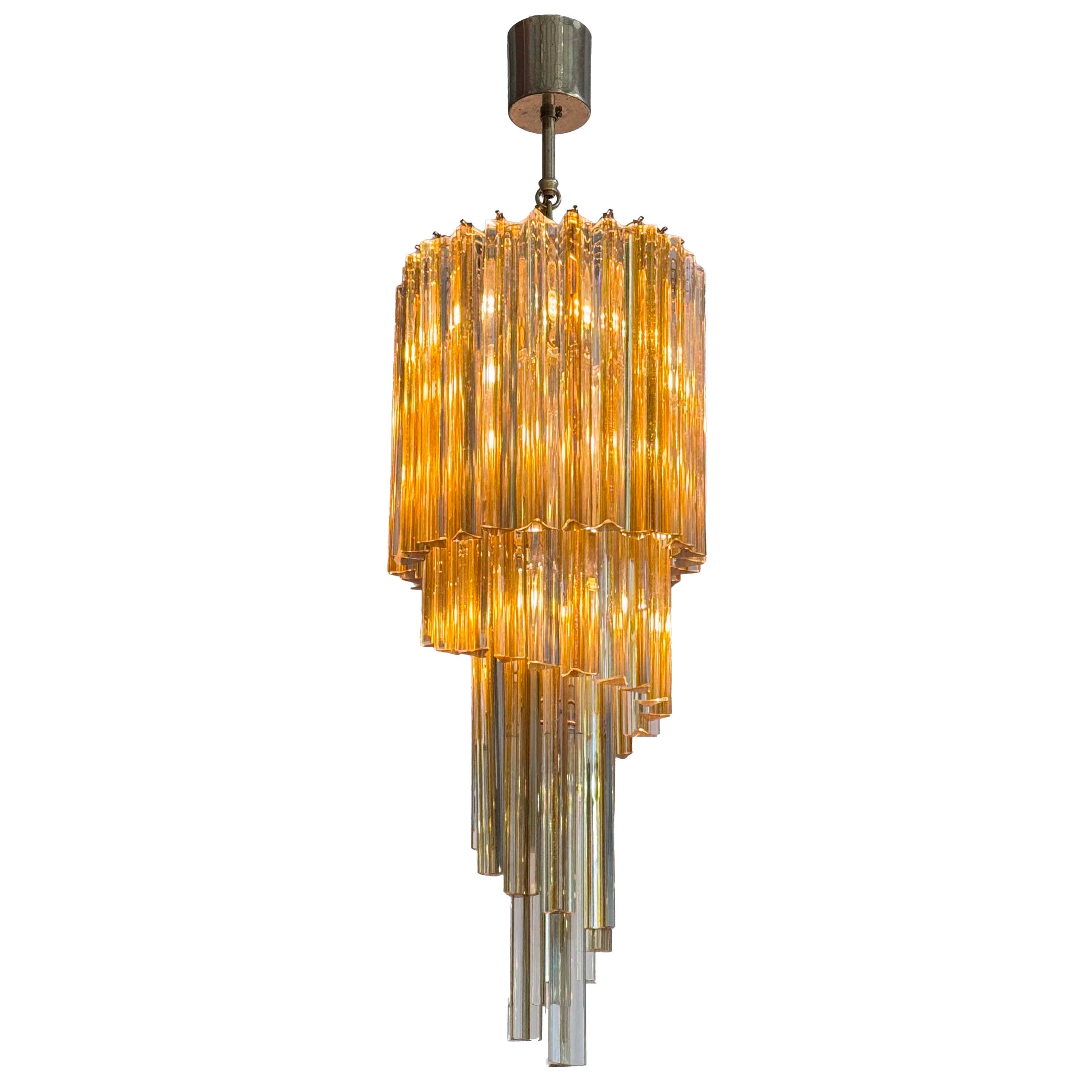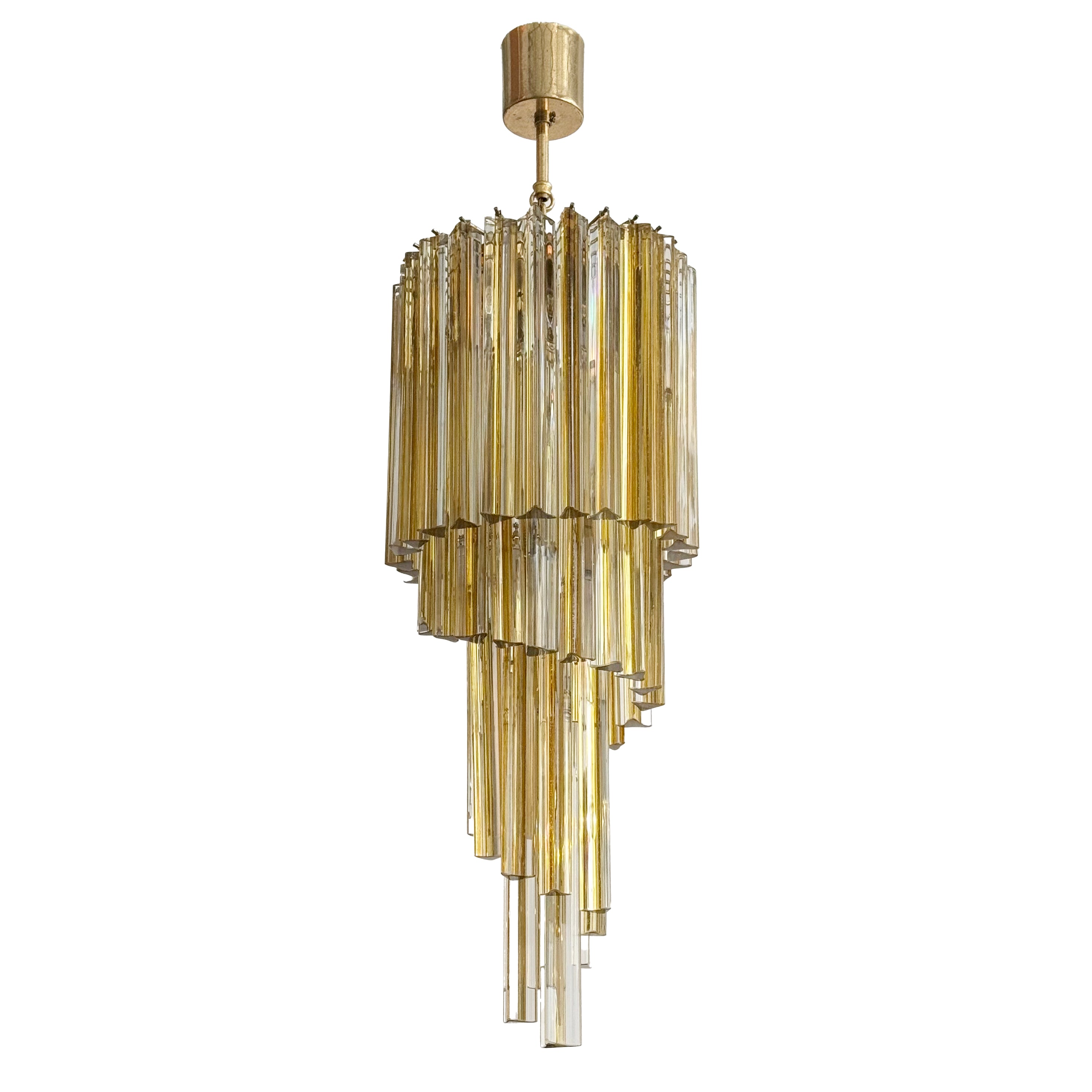 En magnifik takkrona från Venini, bestående av flera nivåer av triedri-prismor i handblåst Murano-glas. Prismorna, med sin bärnstensfärgade kärna, reflekterar ljuset på ett sätt som skapar en vacker och varm atmosfär. Den karakteristiska spiralformen ger takkronan en skulptural närvaro och gör den till ett statement-piece i varje interiör.