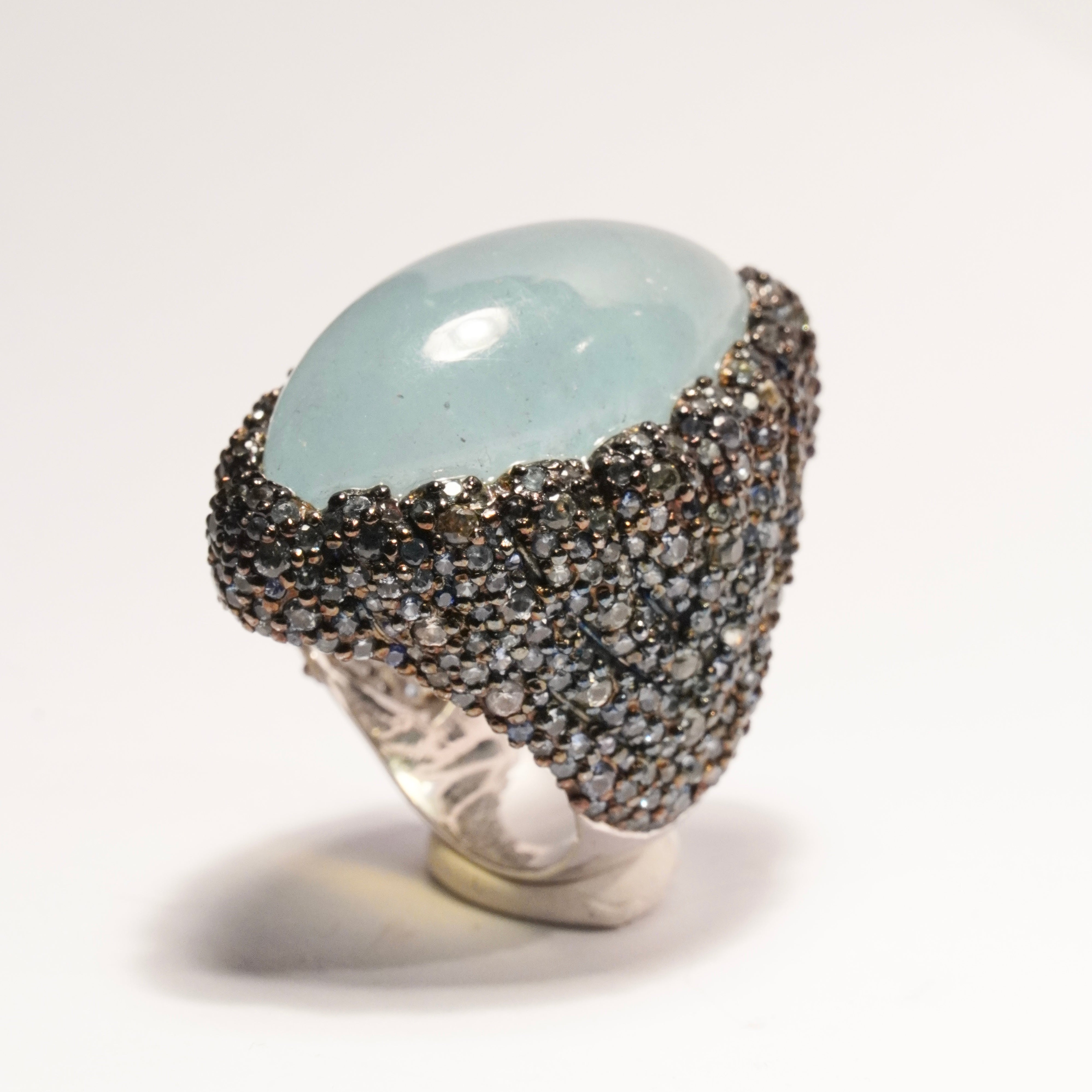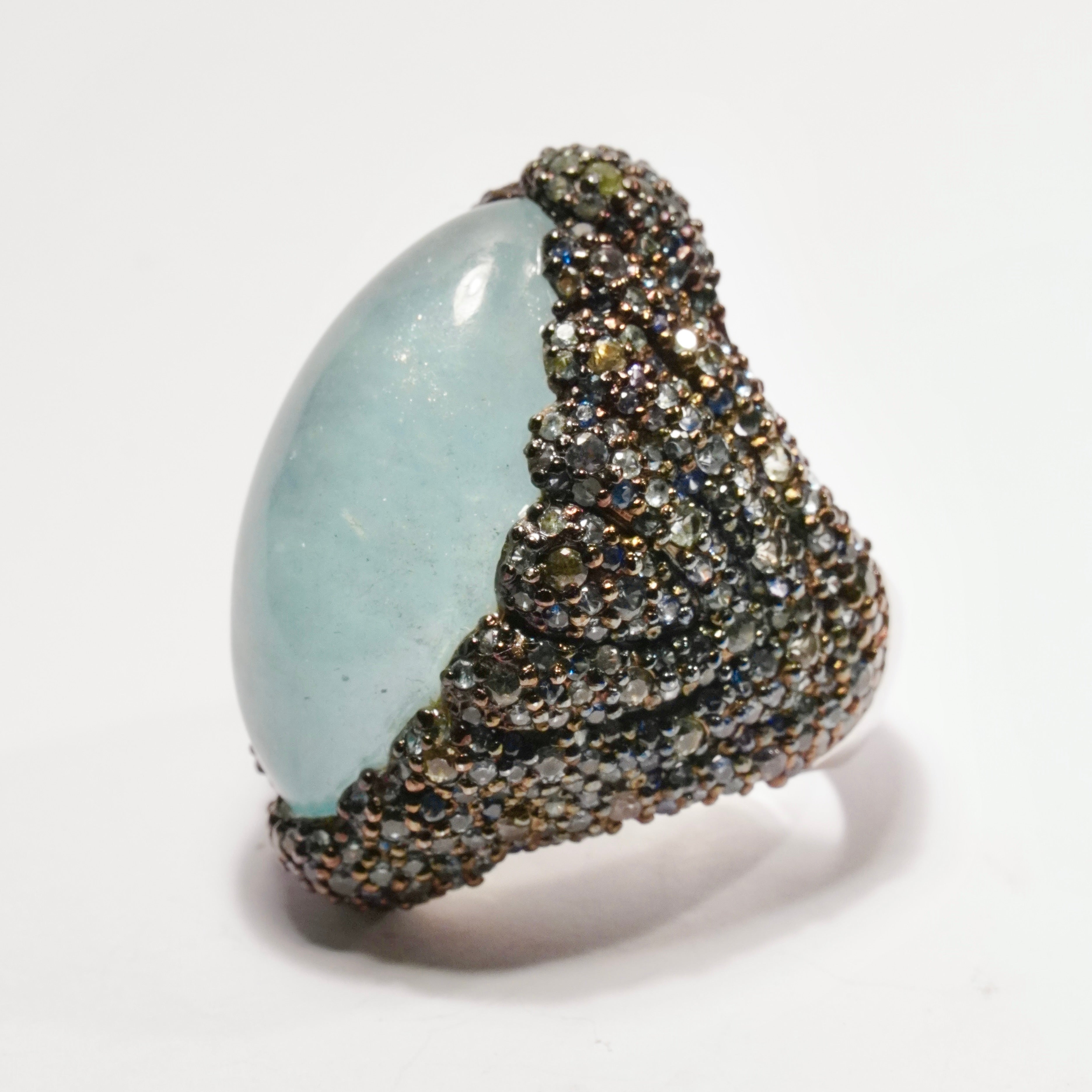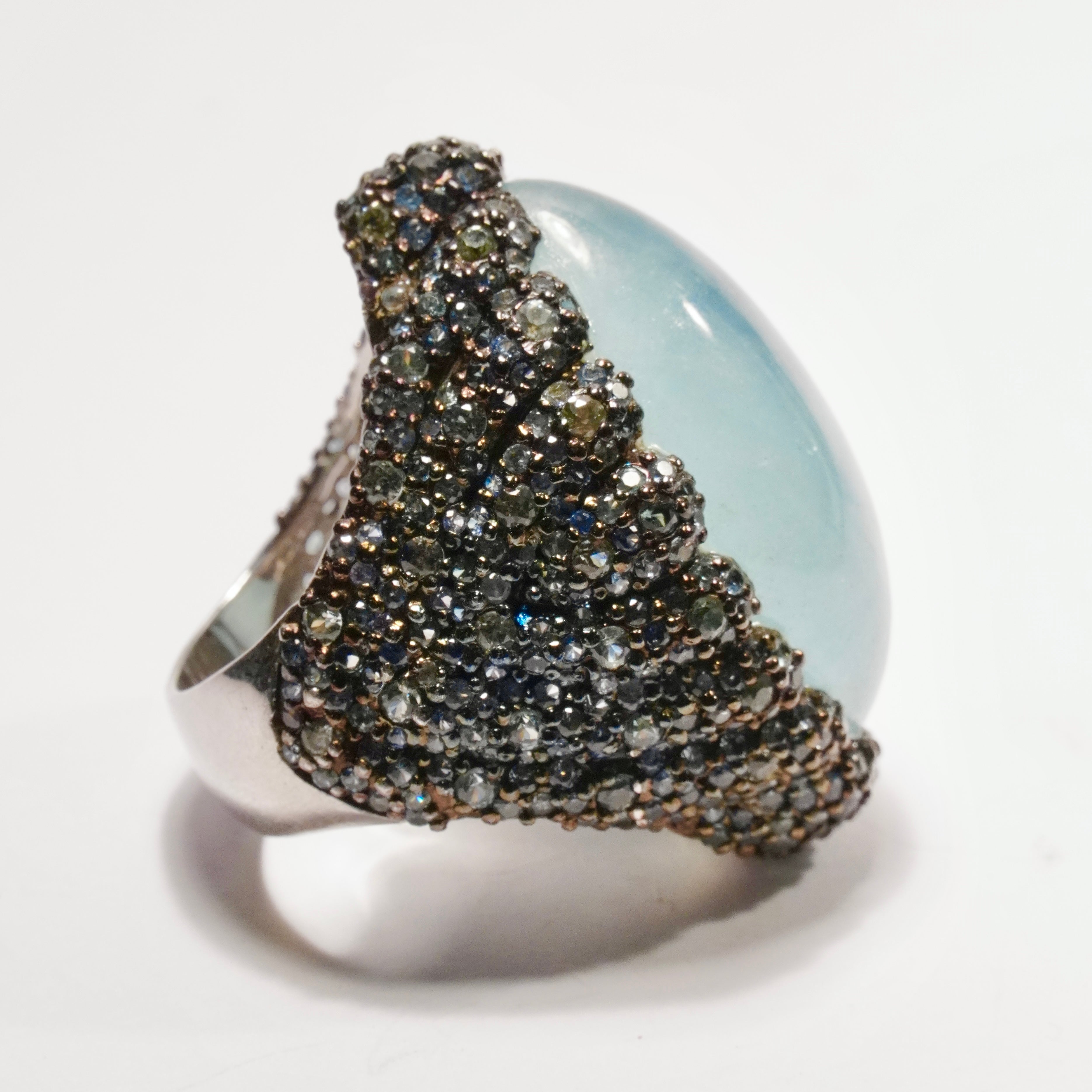 Underbar Cocktailring i 925 silver klädd med safirer kring en maffig cabochonslipad akvamarin.