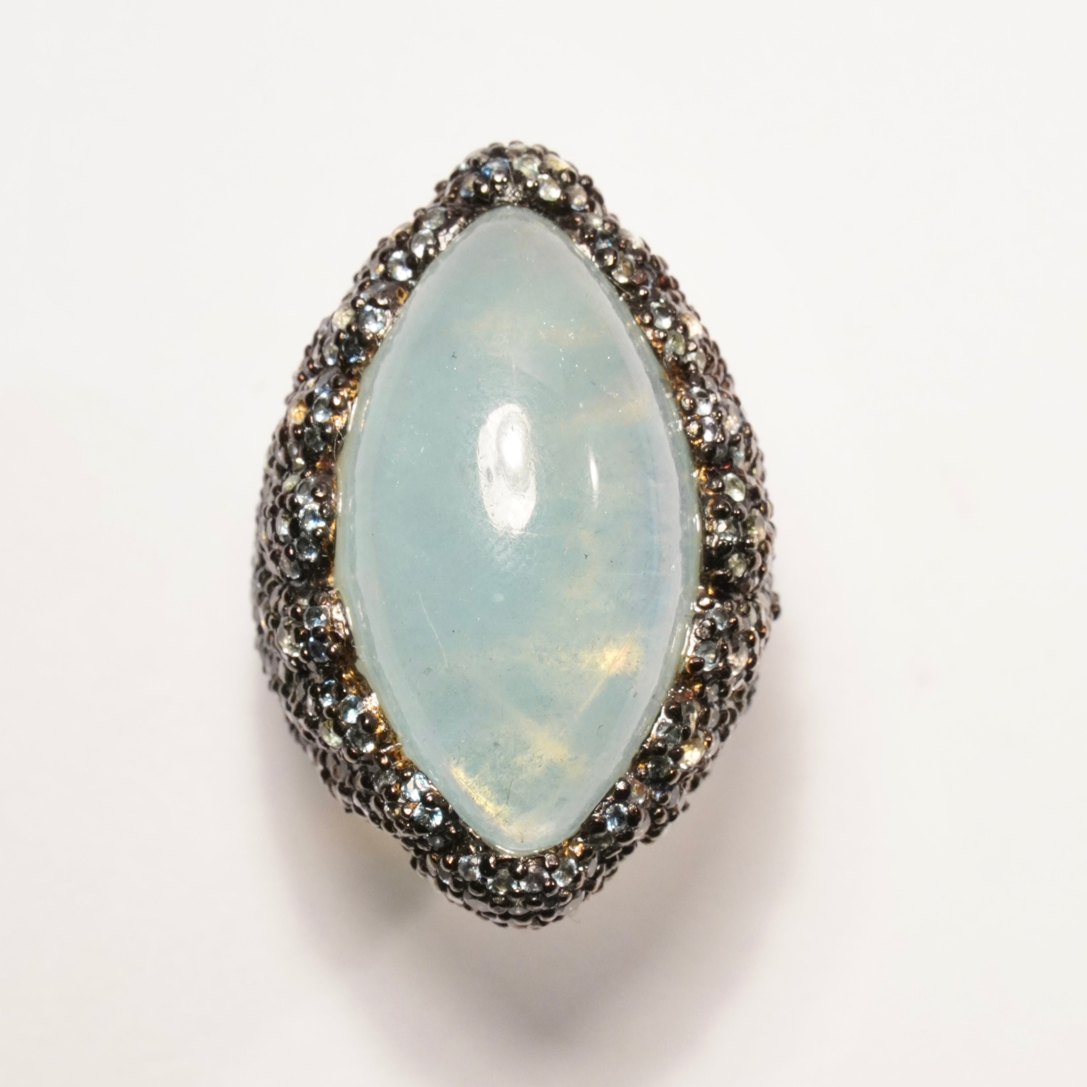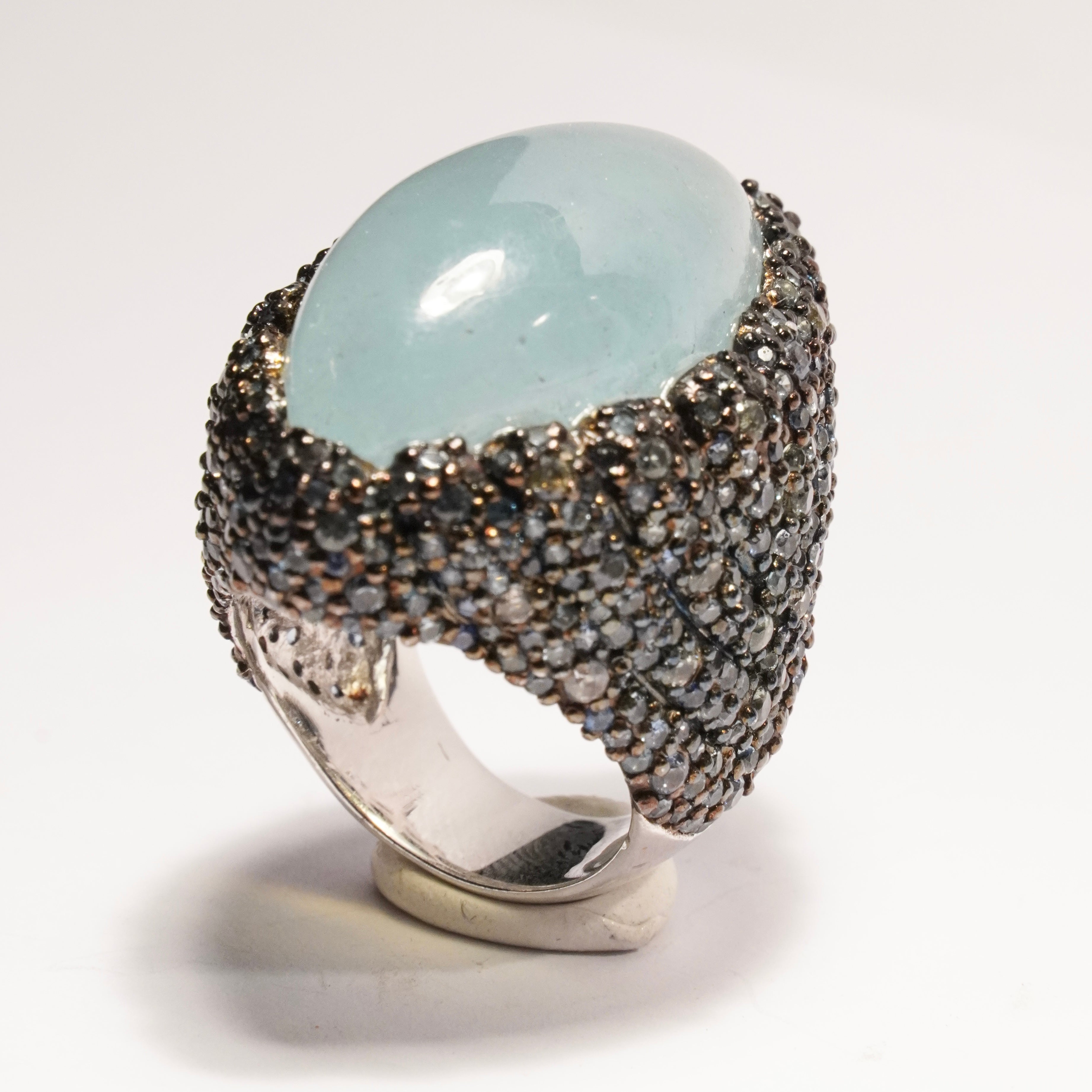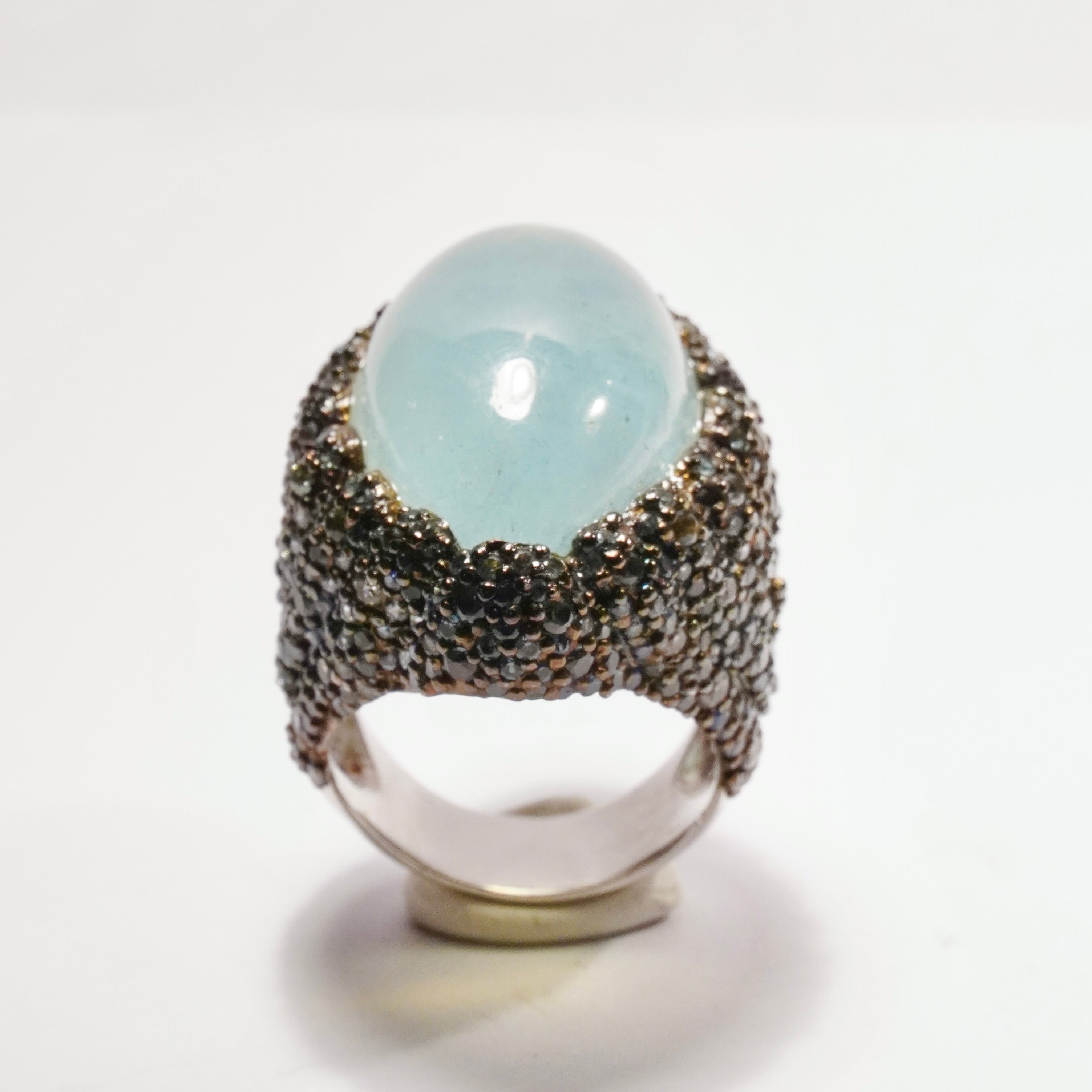 Underbar Cocktailring i 925 silver klädd med safirer kring en maffig cabochonslipad akvamarin.