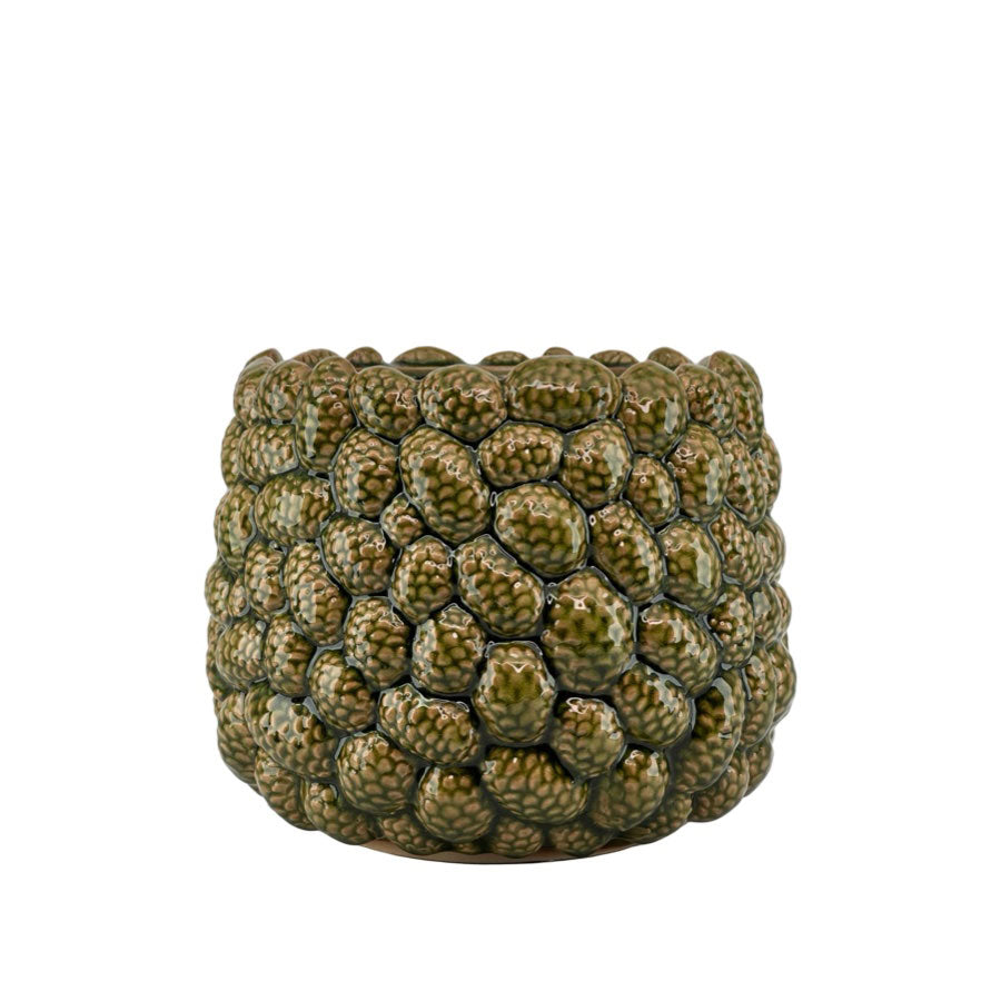 Dekorativ kruka i stengods med reliefmönster av kottar. Precis som kottar i naturen varierar färgerna i nyanser, vilket ger varje kruka ett unikt uttryck. Glaserad i grönt.