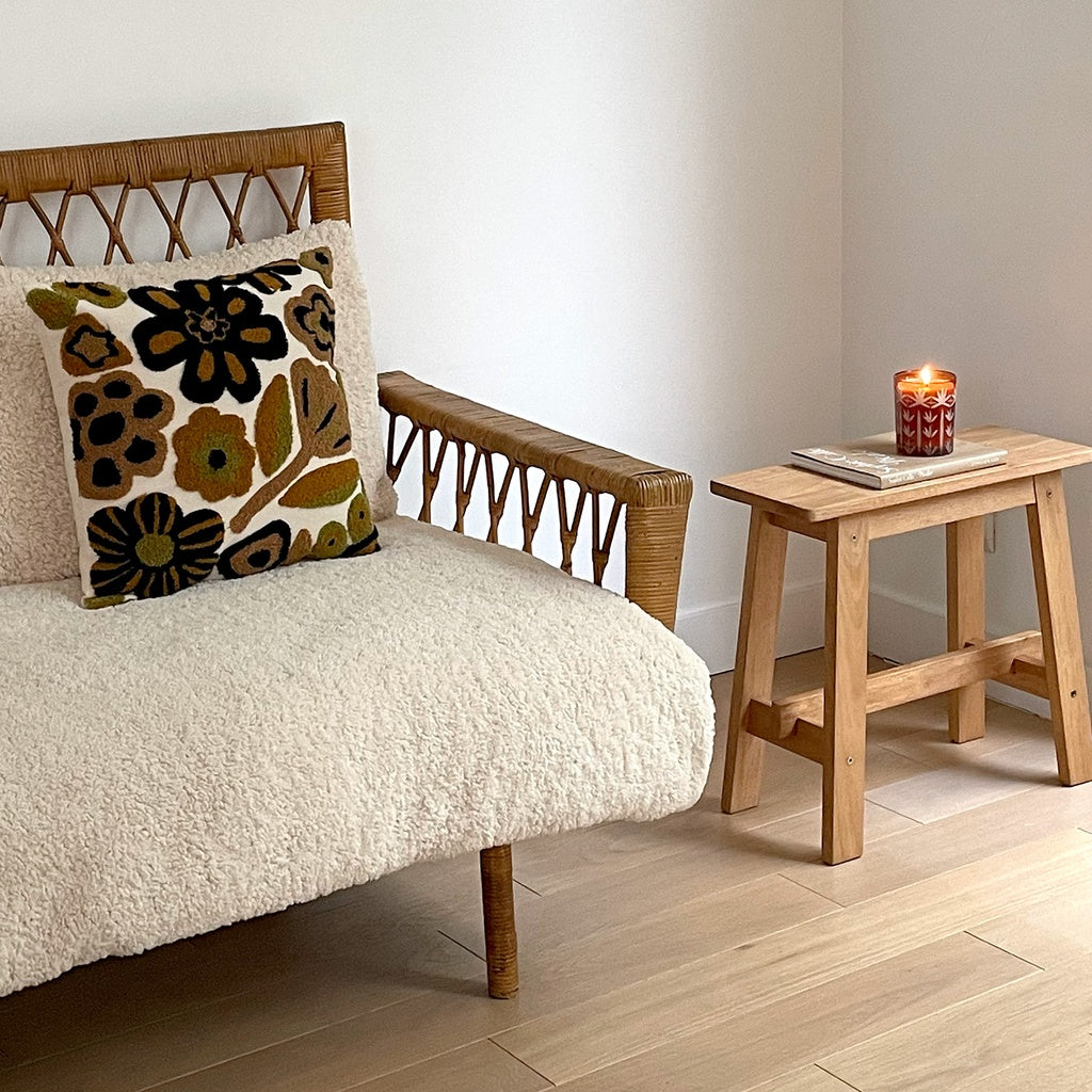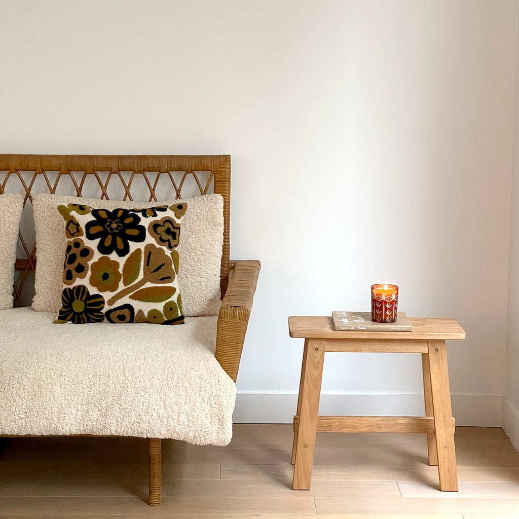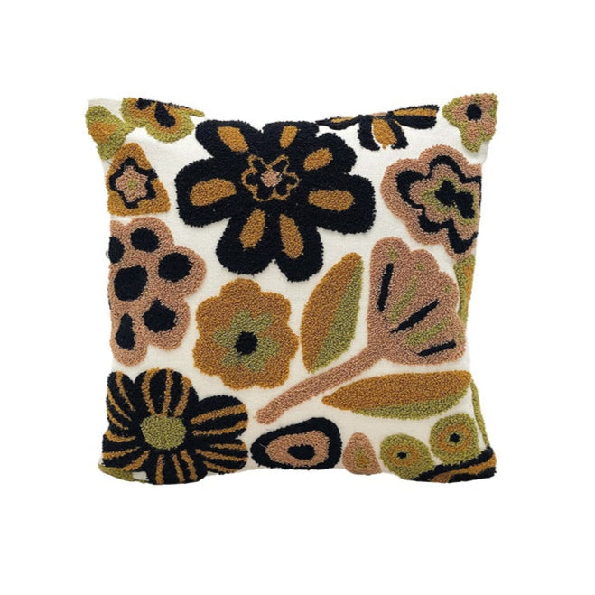 Kudde med dekorativt blommotiv. Baksida i canvas tyg.