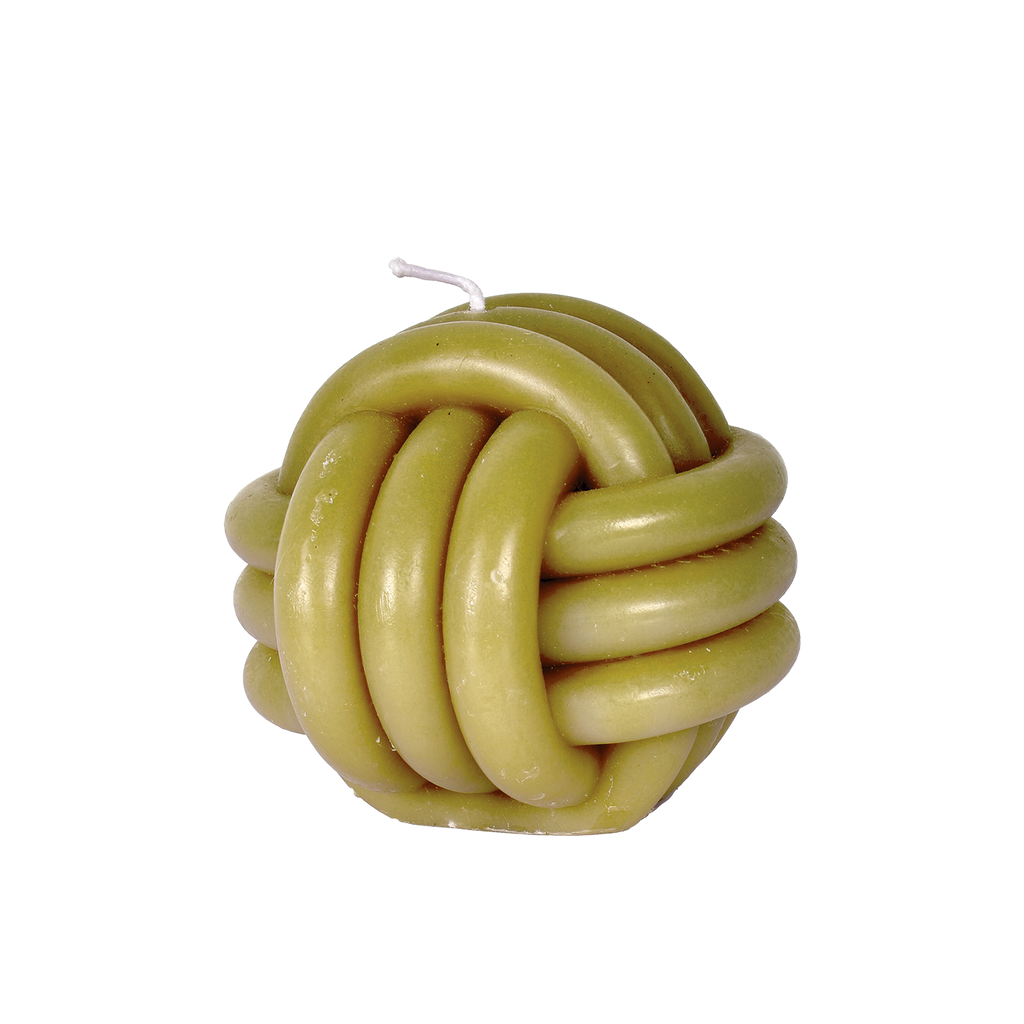 Ett skulpturalt ljus i form av en knut, tillverkat i naturligt vax med en mjuk kaki-ton.