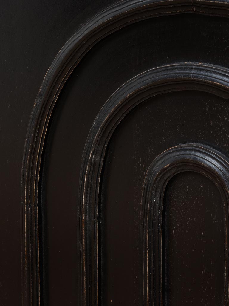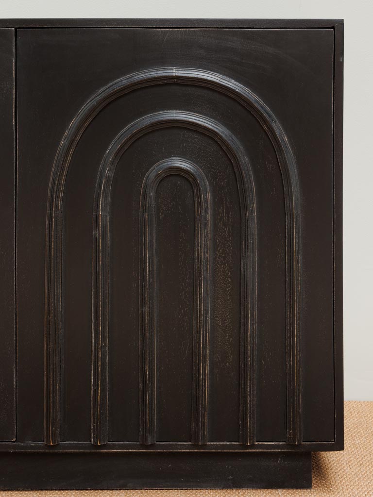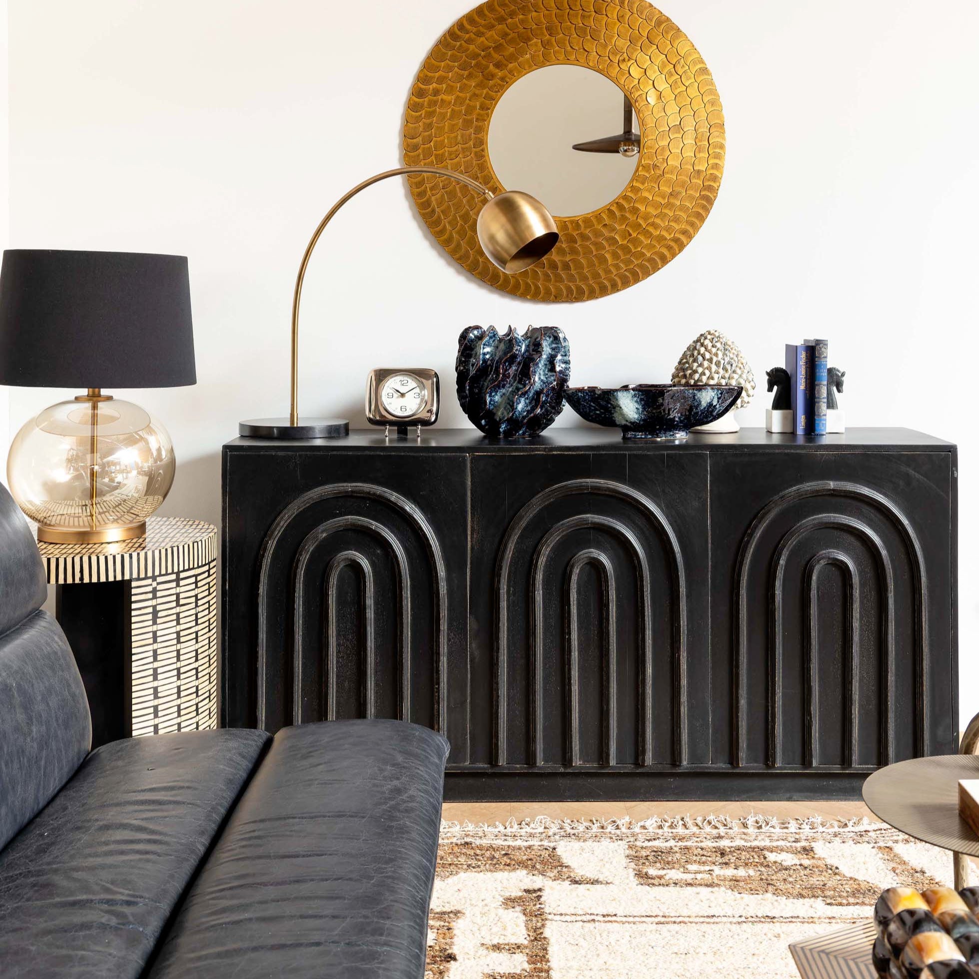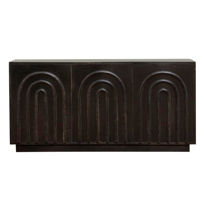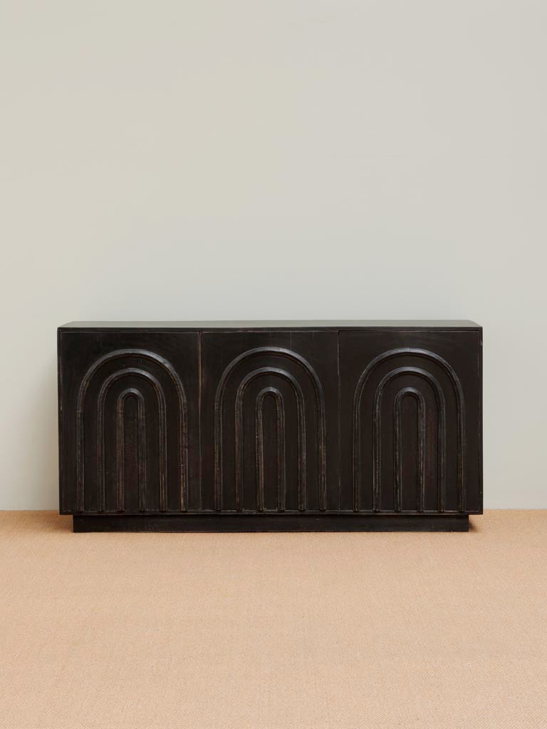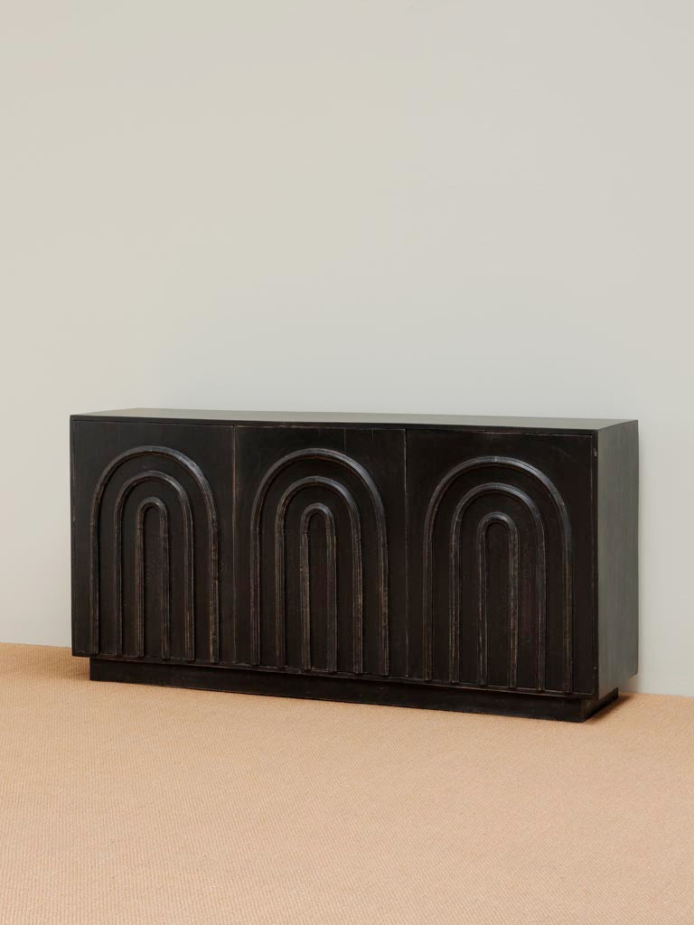 Tillverkat i mangoträ med mörkbetsad finish erbjuder Arch både estetik och funktion. Bakom de tre dörrarna döljer sig generöst förvaringsutrymme, perfekt för porslin, textilier eller andra vardagsföremål.