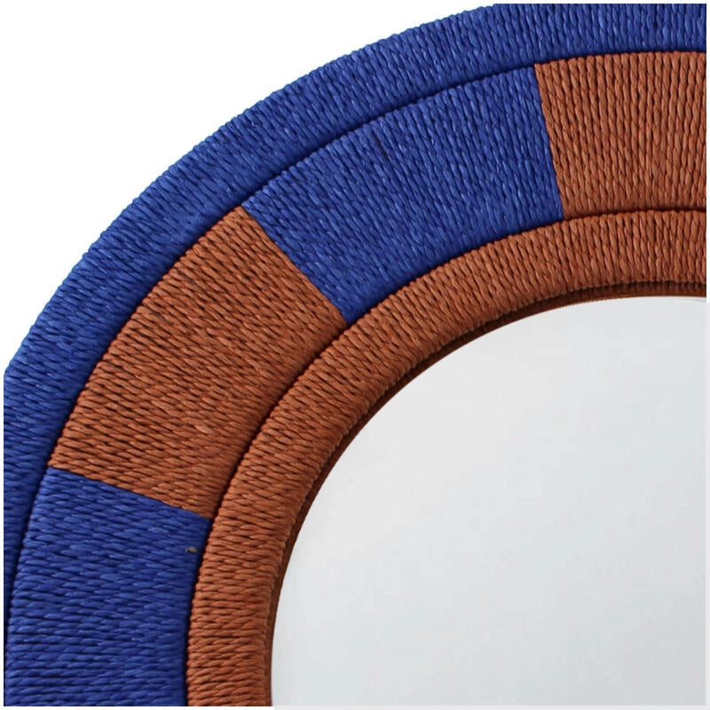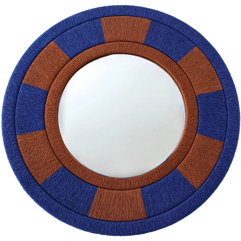 Som en visuell rytm mot väggen balanserar denna runda spegel det lekfulla och det lugna. Flätad randig ram i djupblått och rostbrunt.