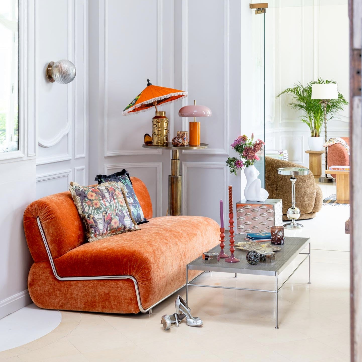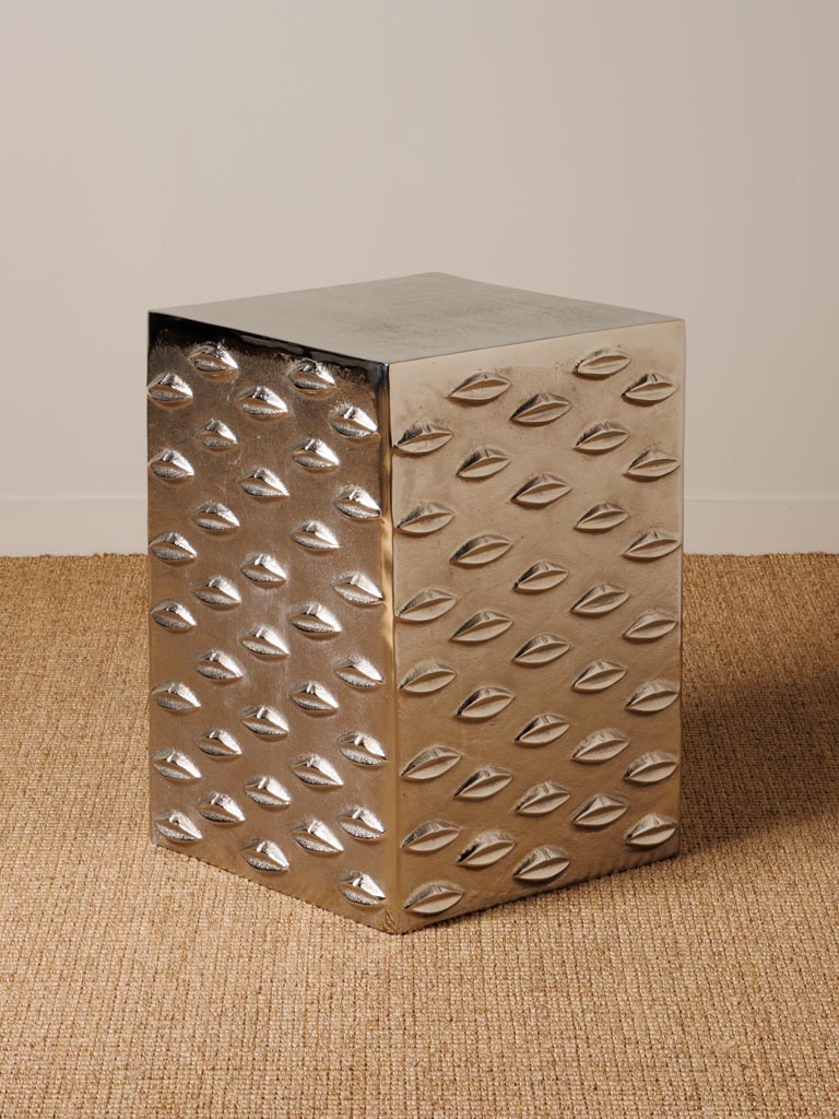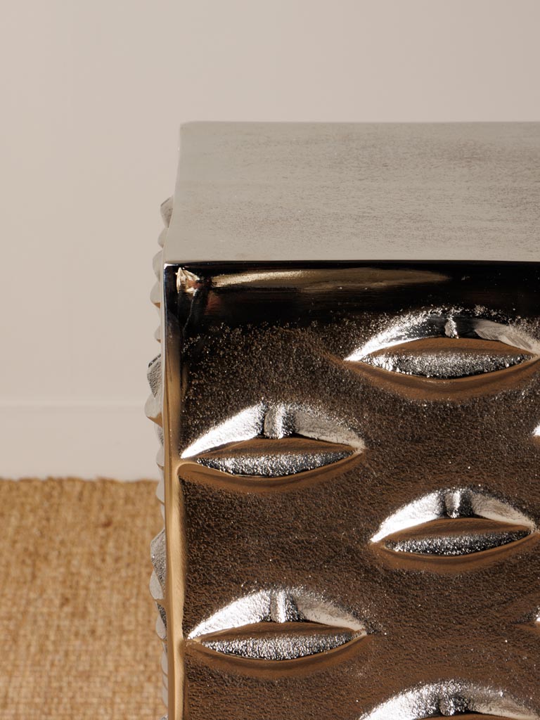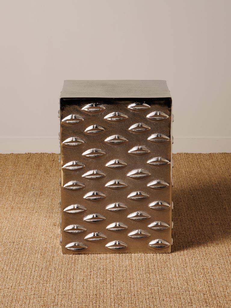 Salvador är ett iögonfallande sidobord i aluminium, med reliefer av abstrakta munnar som skapar ett lekfullt mönster. Den geometriska kubformen kontrasterar mot det mjuka formerna i mönstret, vilket ger ett skulpturalt inslag i rummet.