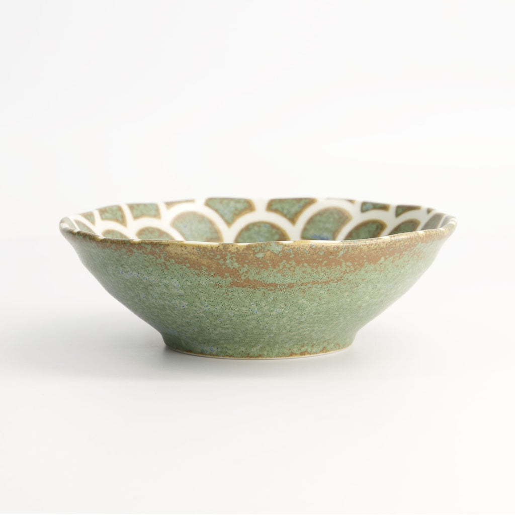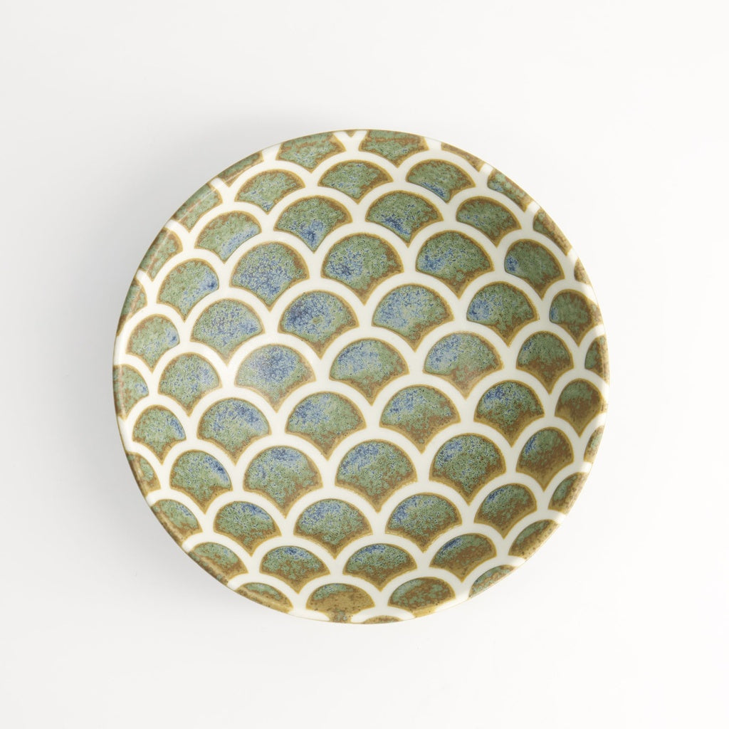 Inspirerad av havets mjuka rörelser: denna lilla skål från Mermaid-serien bär ett fint fiskfjällsmönster i den karakteristiska gröna glasyren. Den skapar en harmonisk och lekfull detalj på bordet – perfekt som liten skål till förrätt, dipsås eller dessert.