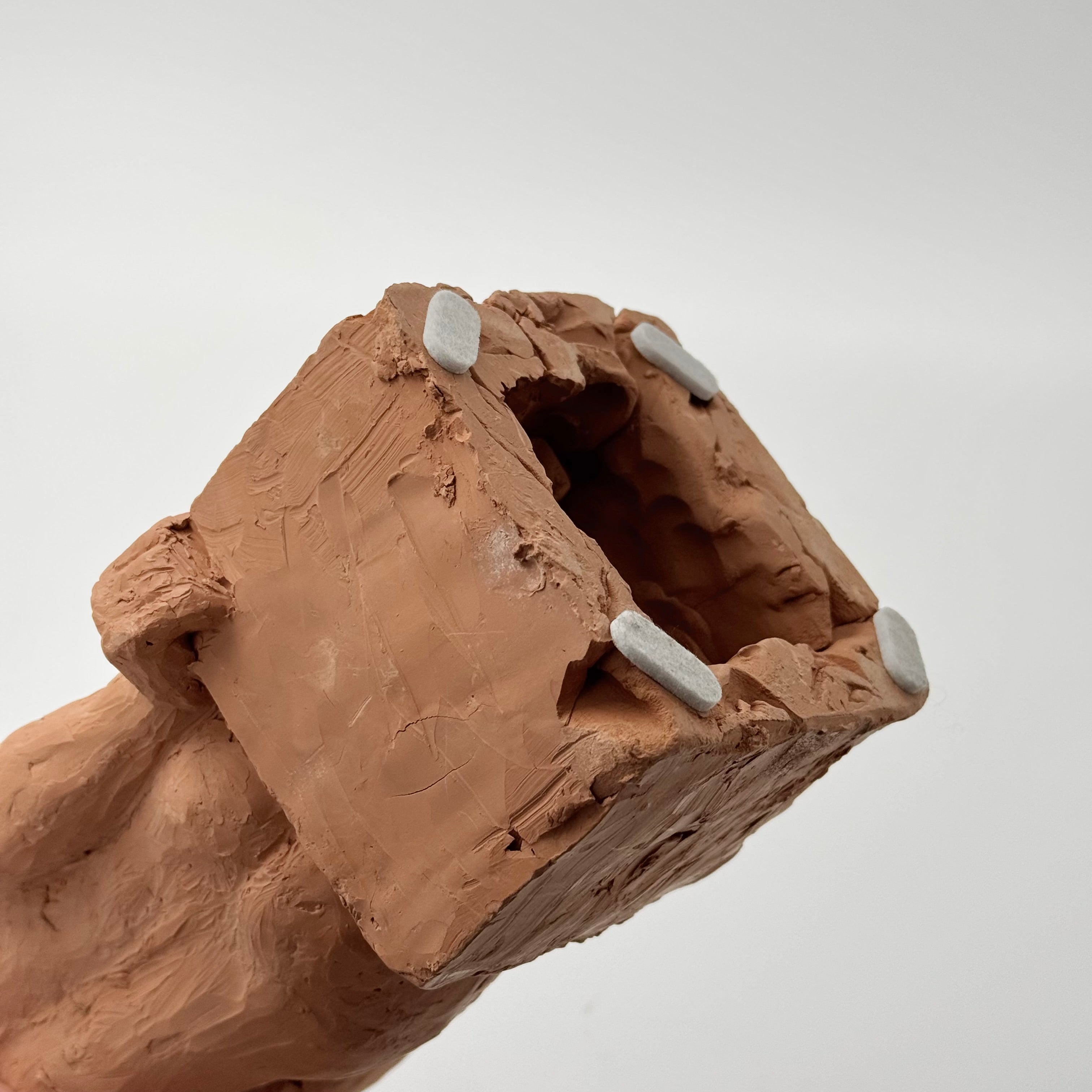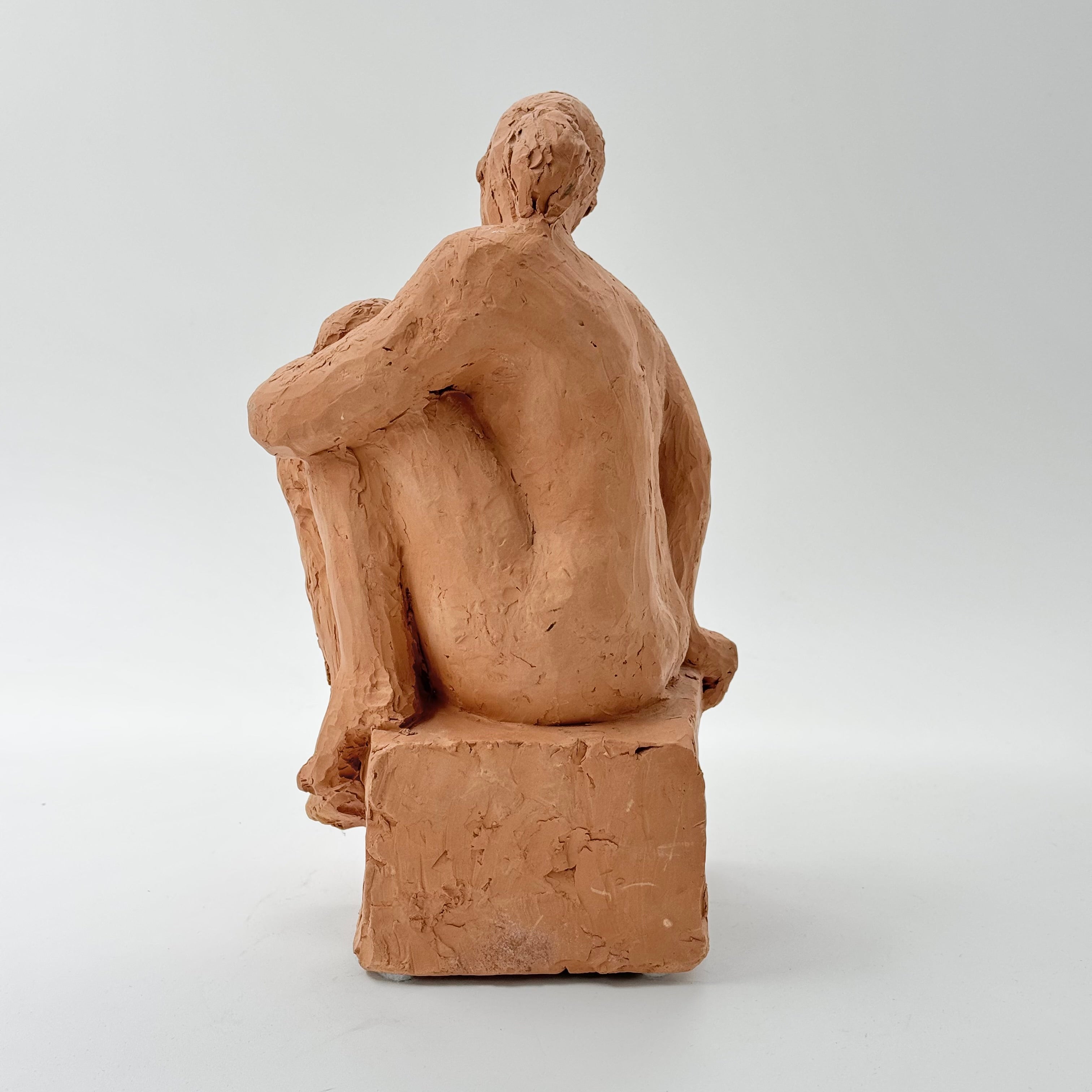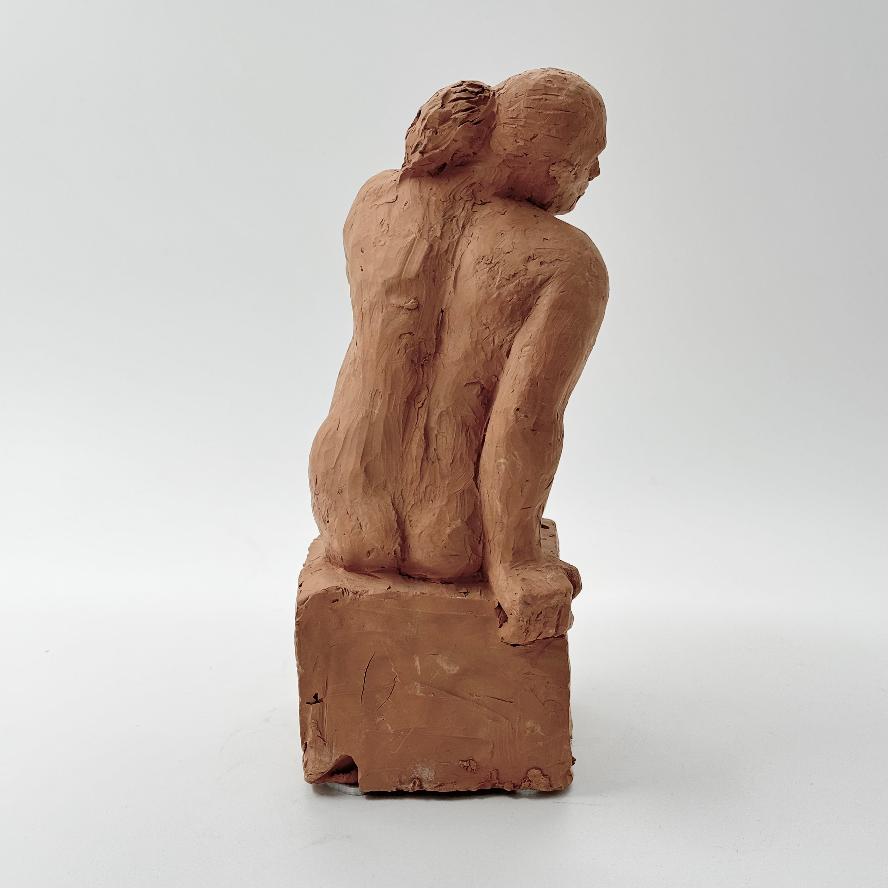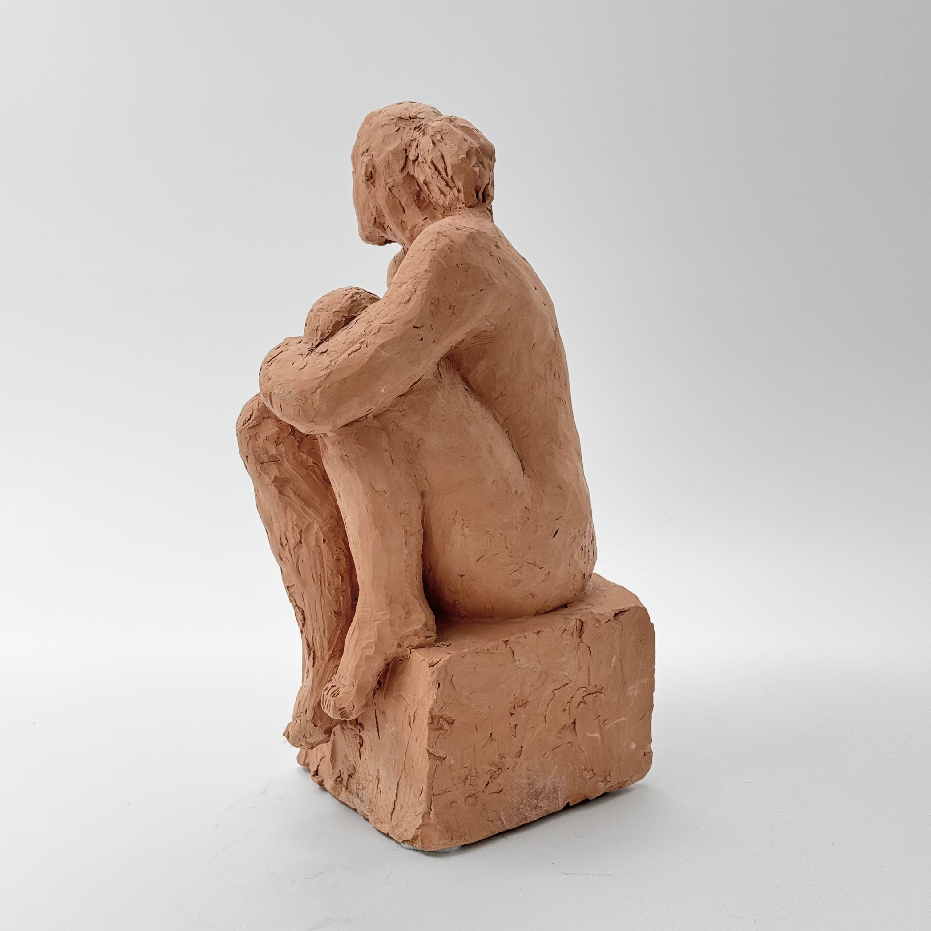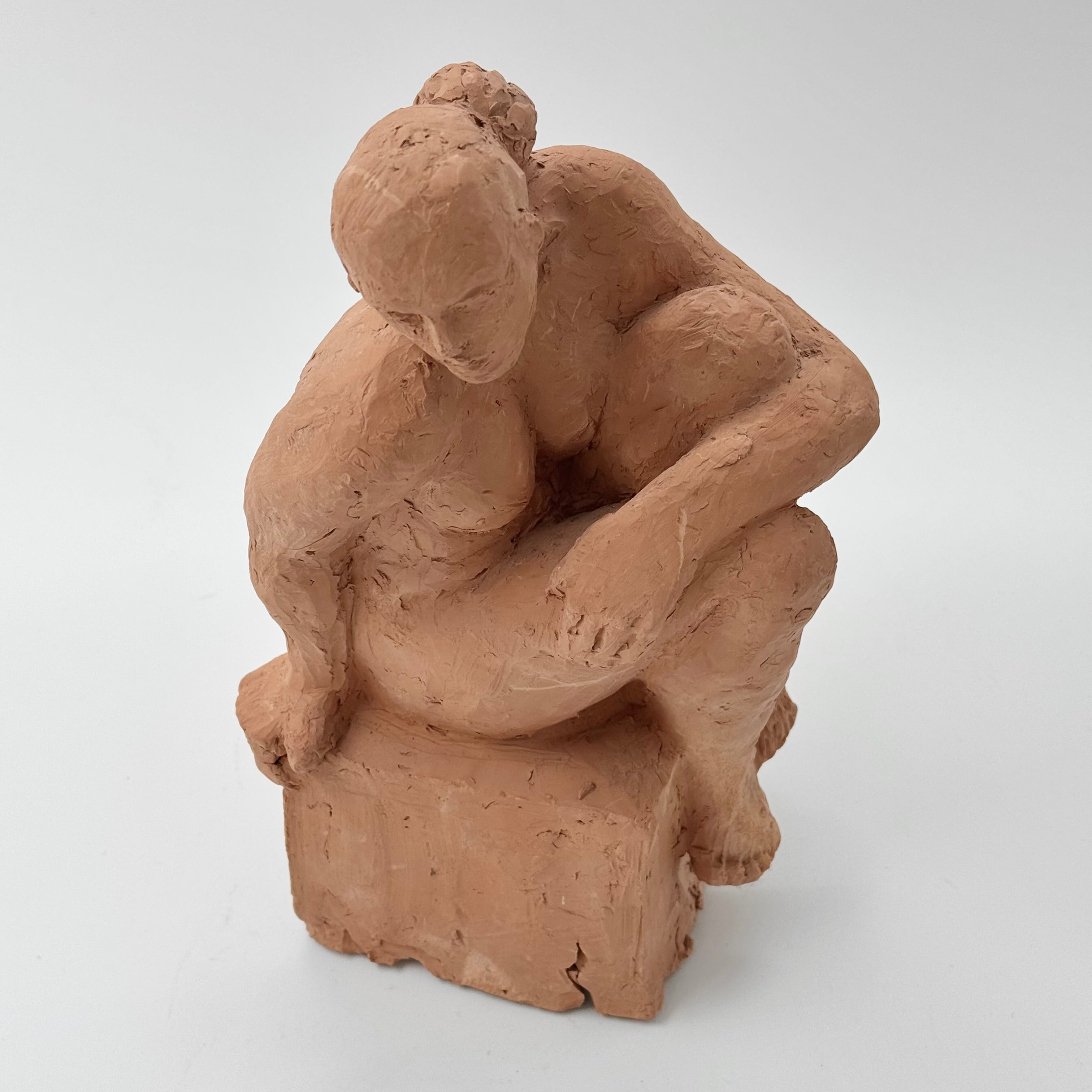En uttrycksfull och tidlös skulptur föreställande en sittande kvinna, formgiven med mjuka linjer och ett eftertänksamt uttryck. Den varma terrakottatonen och den handgjorda känslan ger ett levande och konstnärligt intryck som passar både moderna och klassiska miljöer.