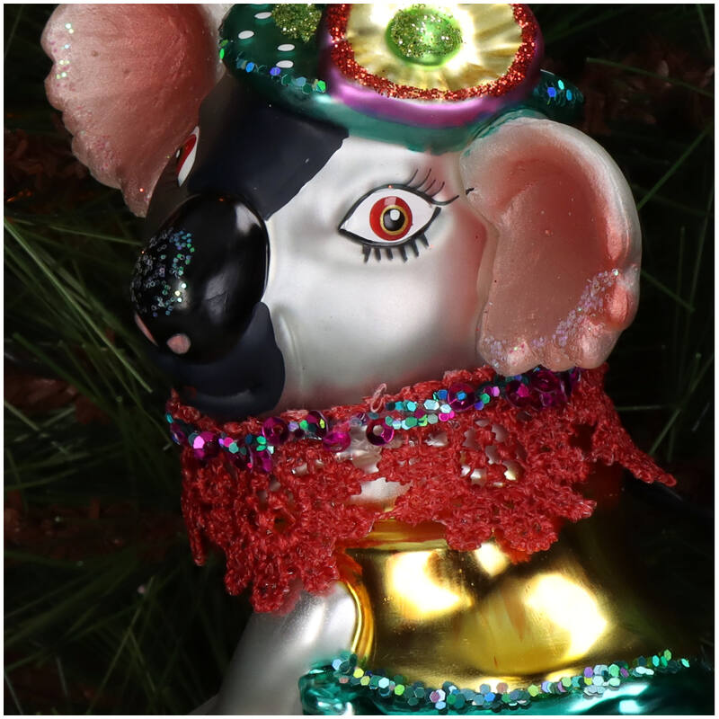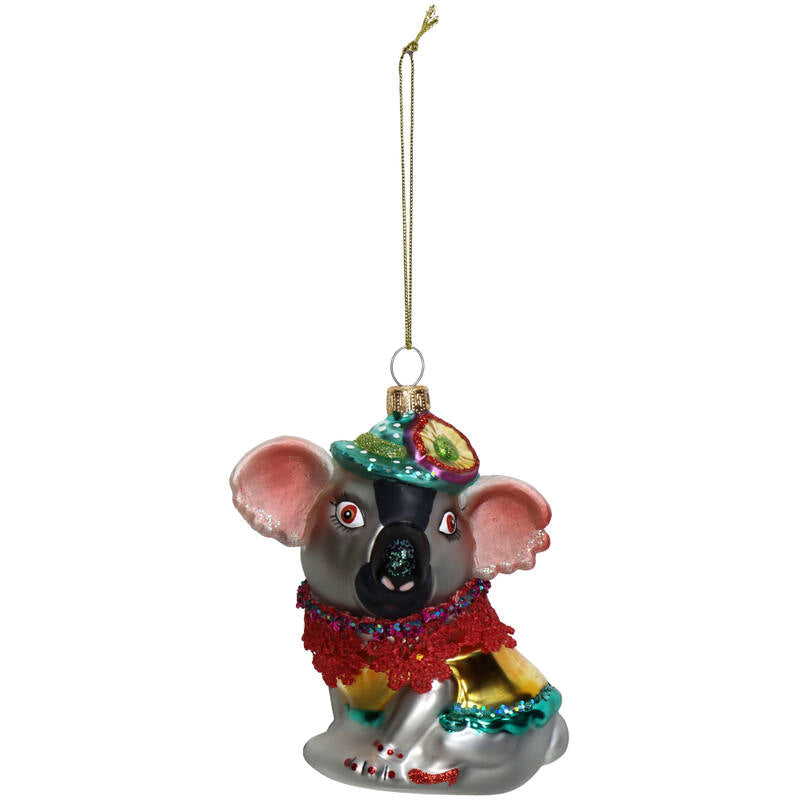 Denna glasdekoration föreställer en söt koalabjörn klädd i julig utstyrsel, komplett med detaljer som förstärker den festliga känslan. Med glittrande inslag och färgstark finish tillför den ett charmigt och humoristiskt uttryck till granen.