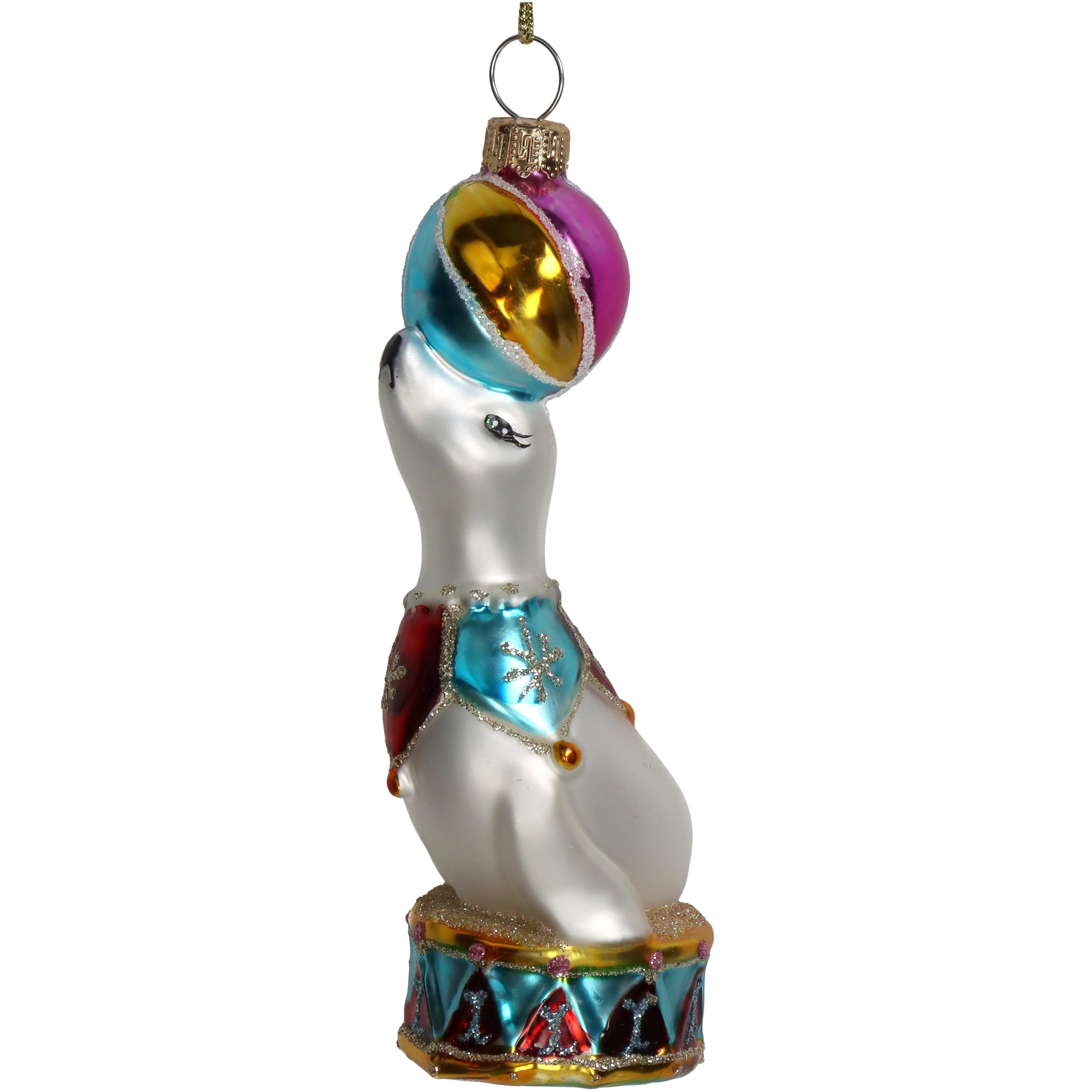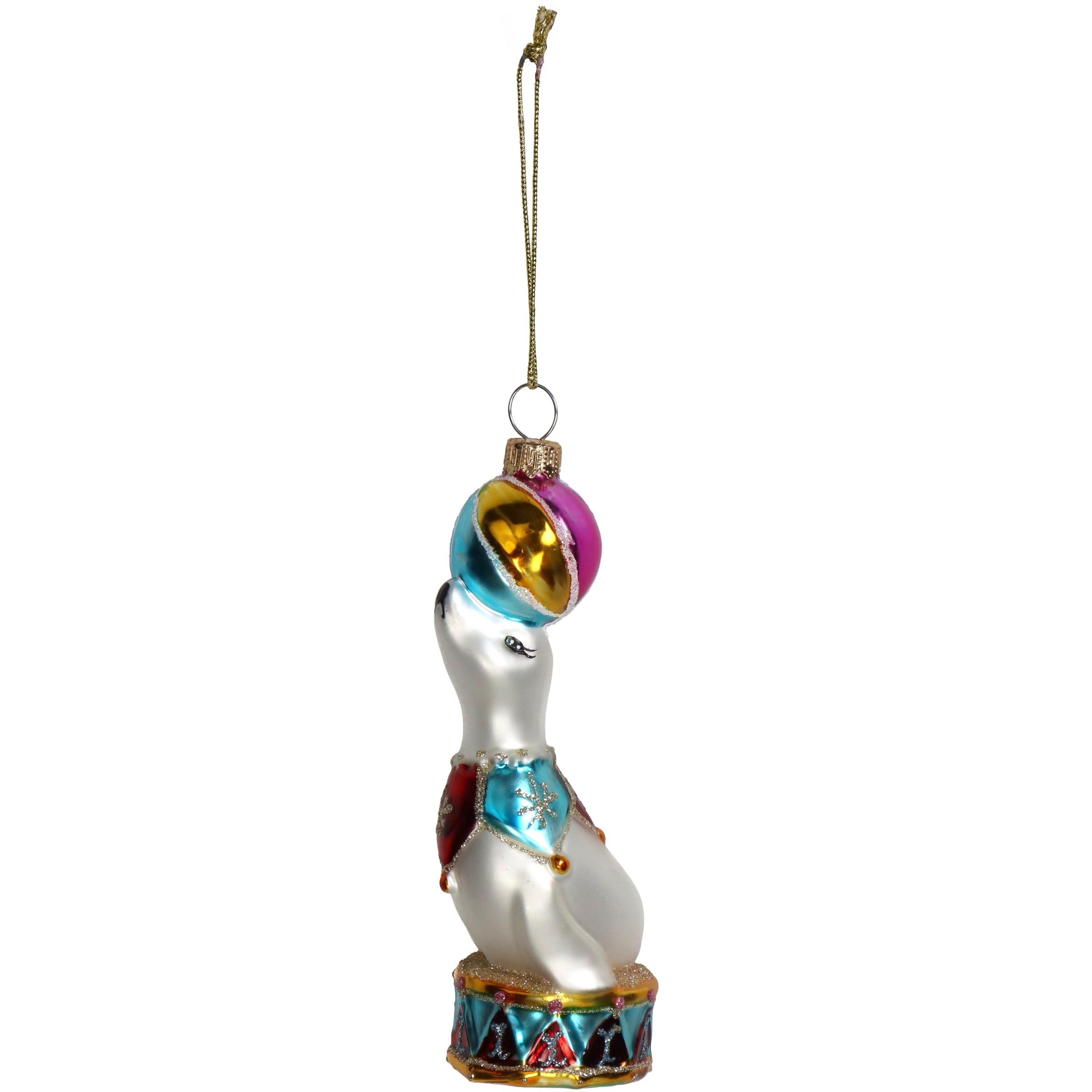 Dekorativ julprydnad i glas formad som en cirkussäl som balanserar en färgad boll. Utförd med starka färger och metalliska detaljer. Passar som accent i granen eller andra arrangemang där en lekfull cirkuston önskas.