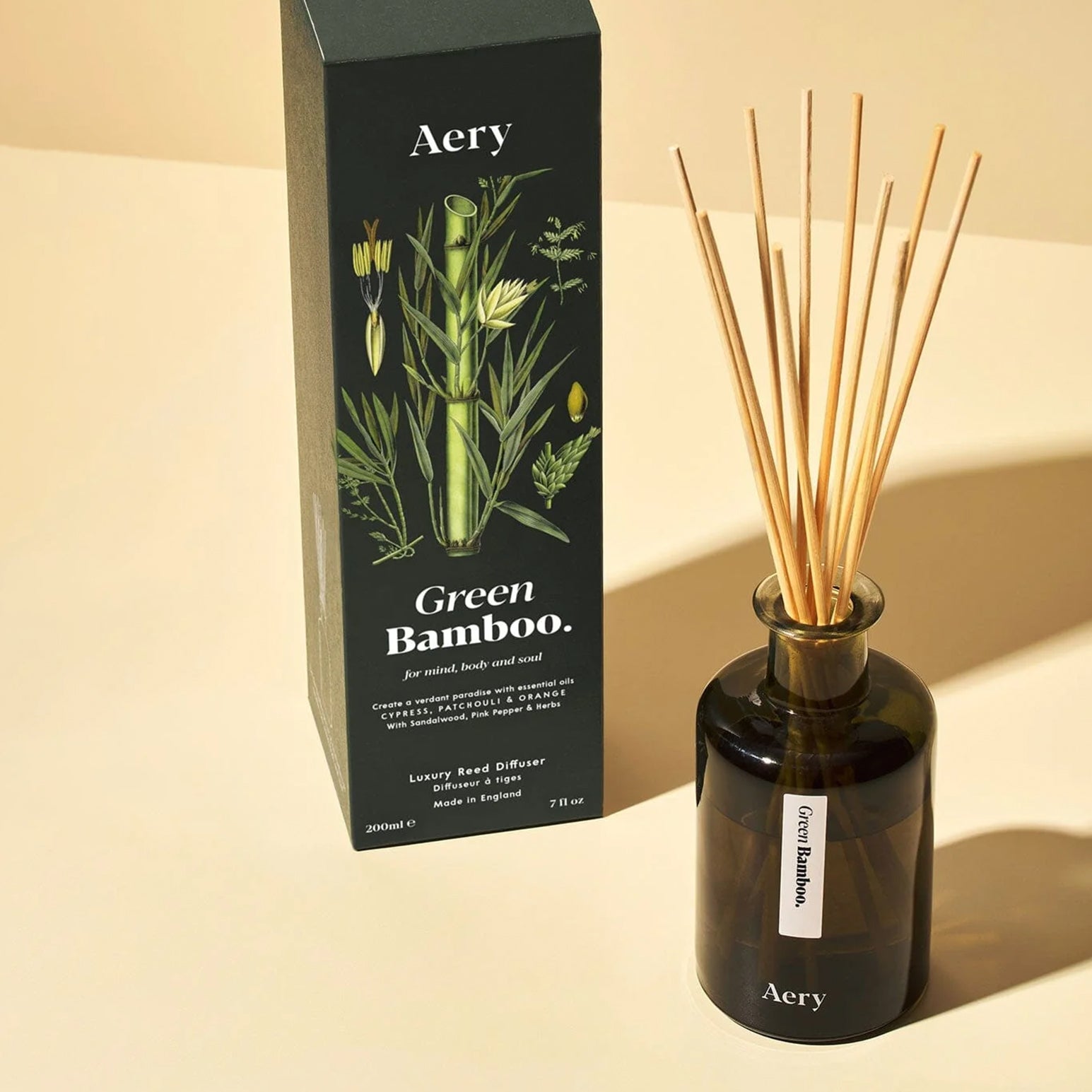 An aromatically rich diffuser. Green Bamboo is undoubtedly one of Aerys' most unique and fresh scents, where juicy and green notes of cypress and orange provide energy and lift the mood. An emerald green paradise filled with fresh and vibrant scents and essential oils. The calming properties of cypress meet the refreshing and positive power of orange - what more could you want? Positively zen.