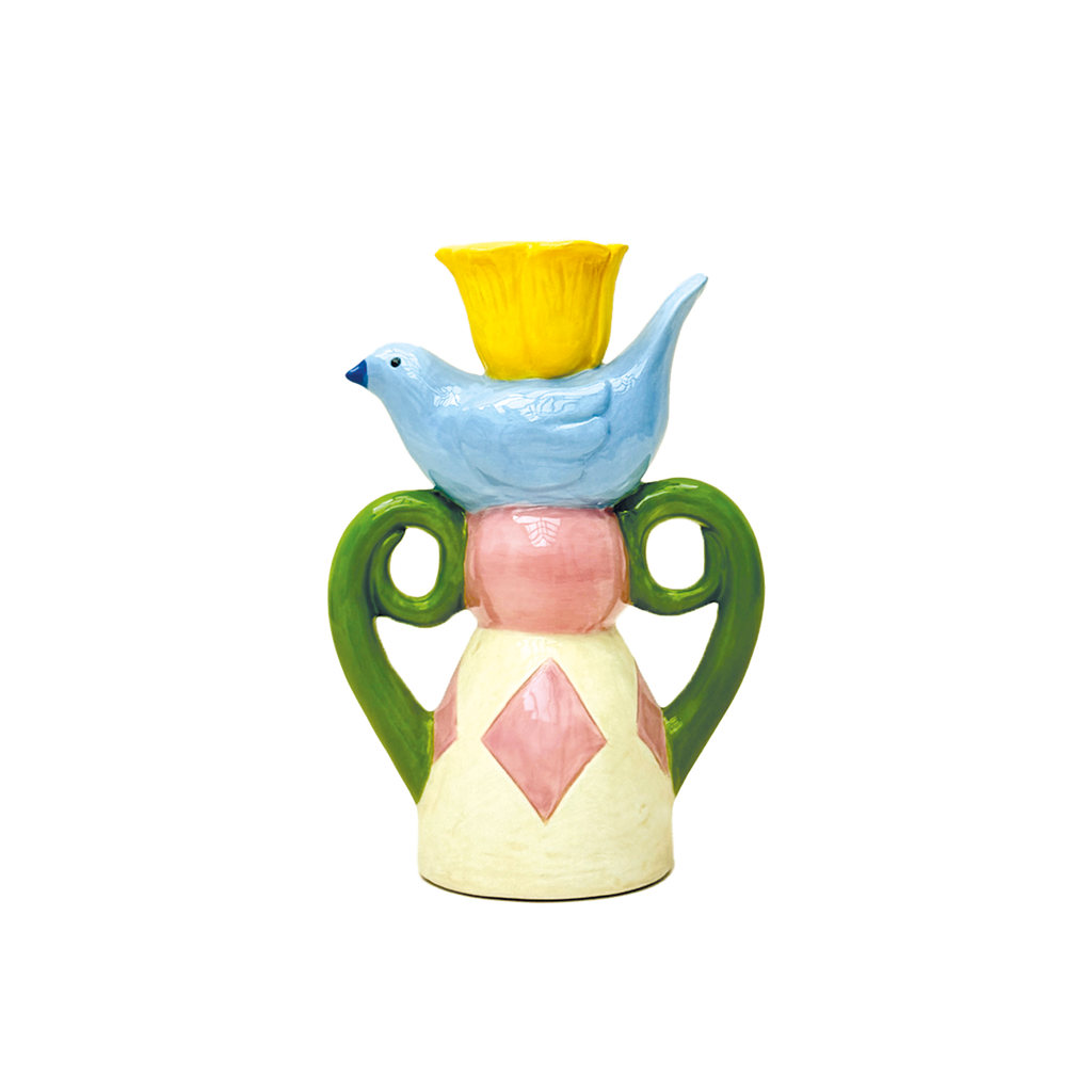 Ceramic candlestick with a colorful little bird. The decorative and playful design adds a personal touch to your home and is just as beautiful as a decoration on its own or combined with other candlesticks.