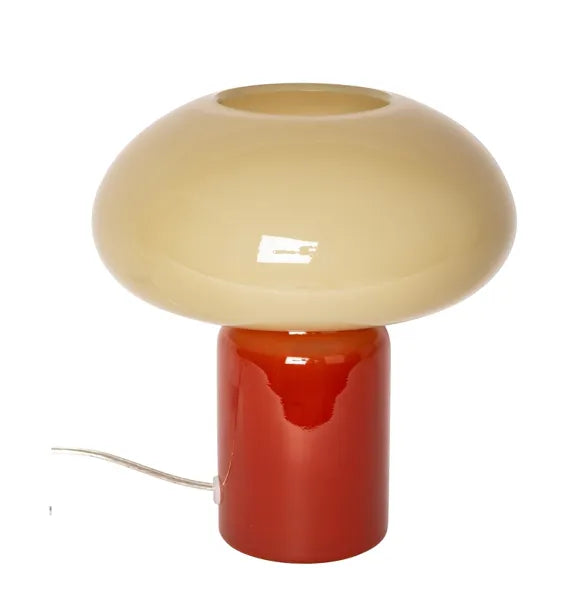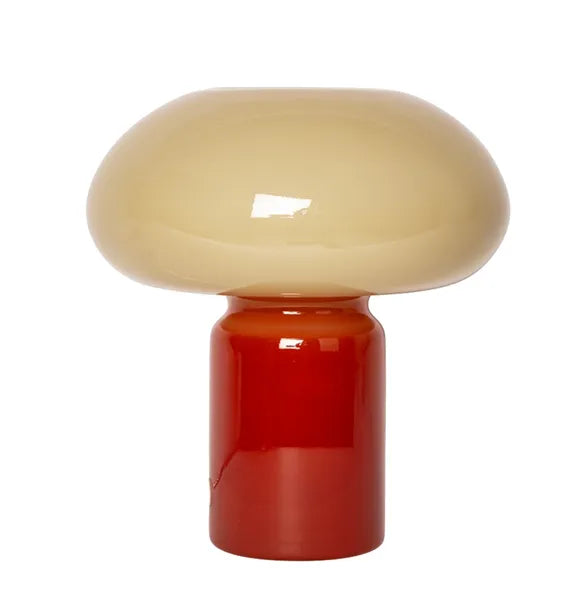 Decorative mushroom-shaped table lamp in red and sage beige.