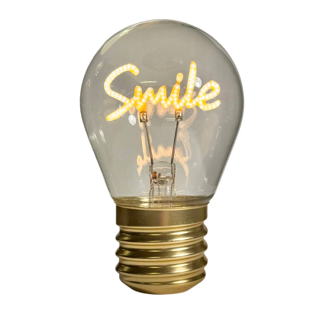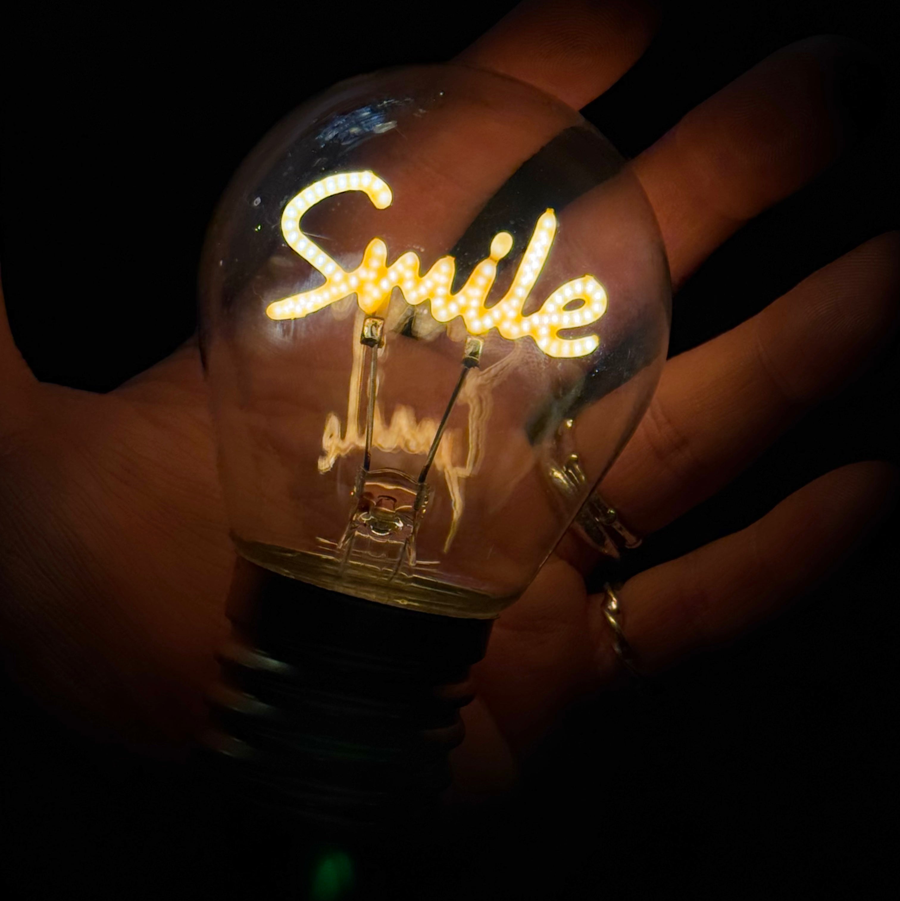 Portable lamp in the shape of a light bulb with a glowing "Smile" in the middle. Perfect mood lighting to place wherever you want.