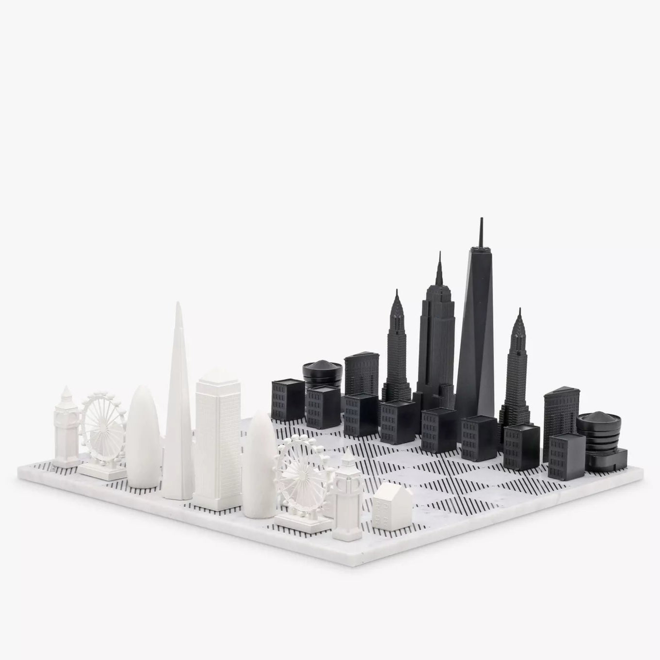 London's most prominent architecture is pitted against the New York City skyline in this special edition chess game. Big Ben, the London Eye, St Mary Axe, The Shard and Canary Wharf meet the Brownstone House, Guggenheim, Flatiron, Chrysler, Empire State Building and One World Trade Tower.