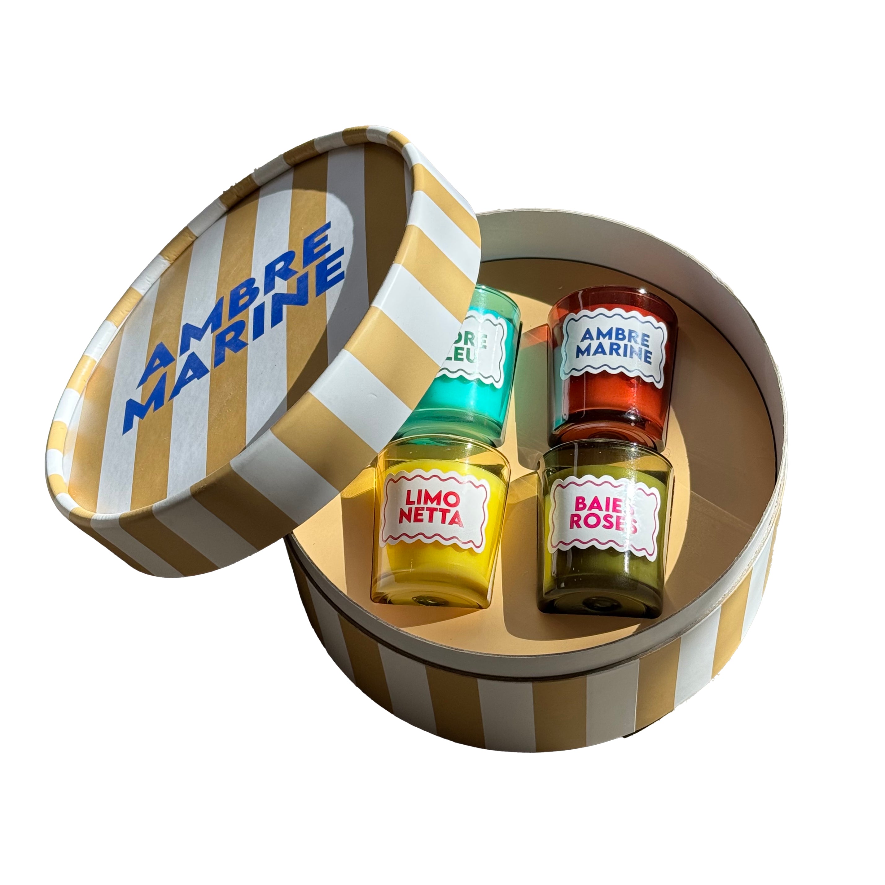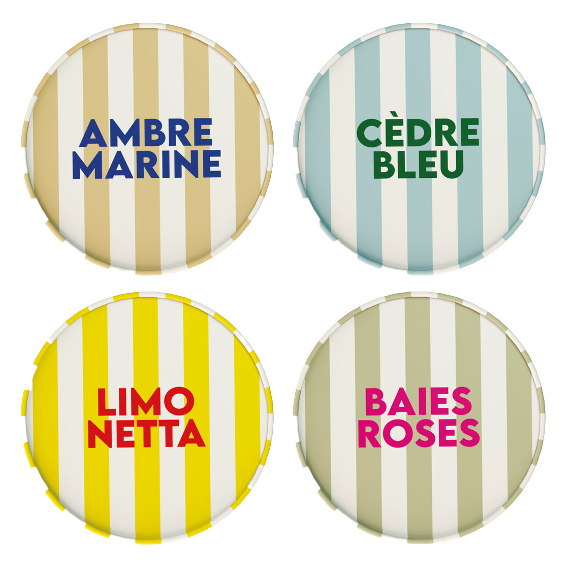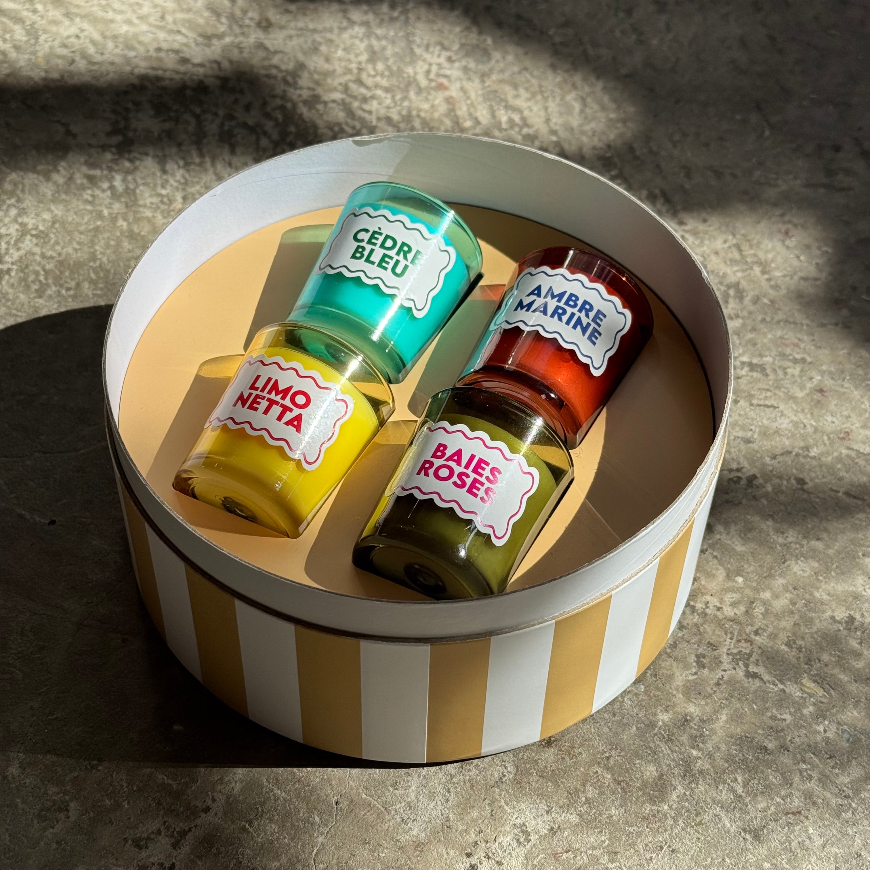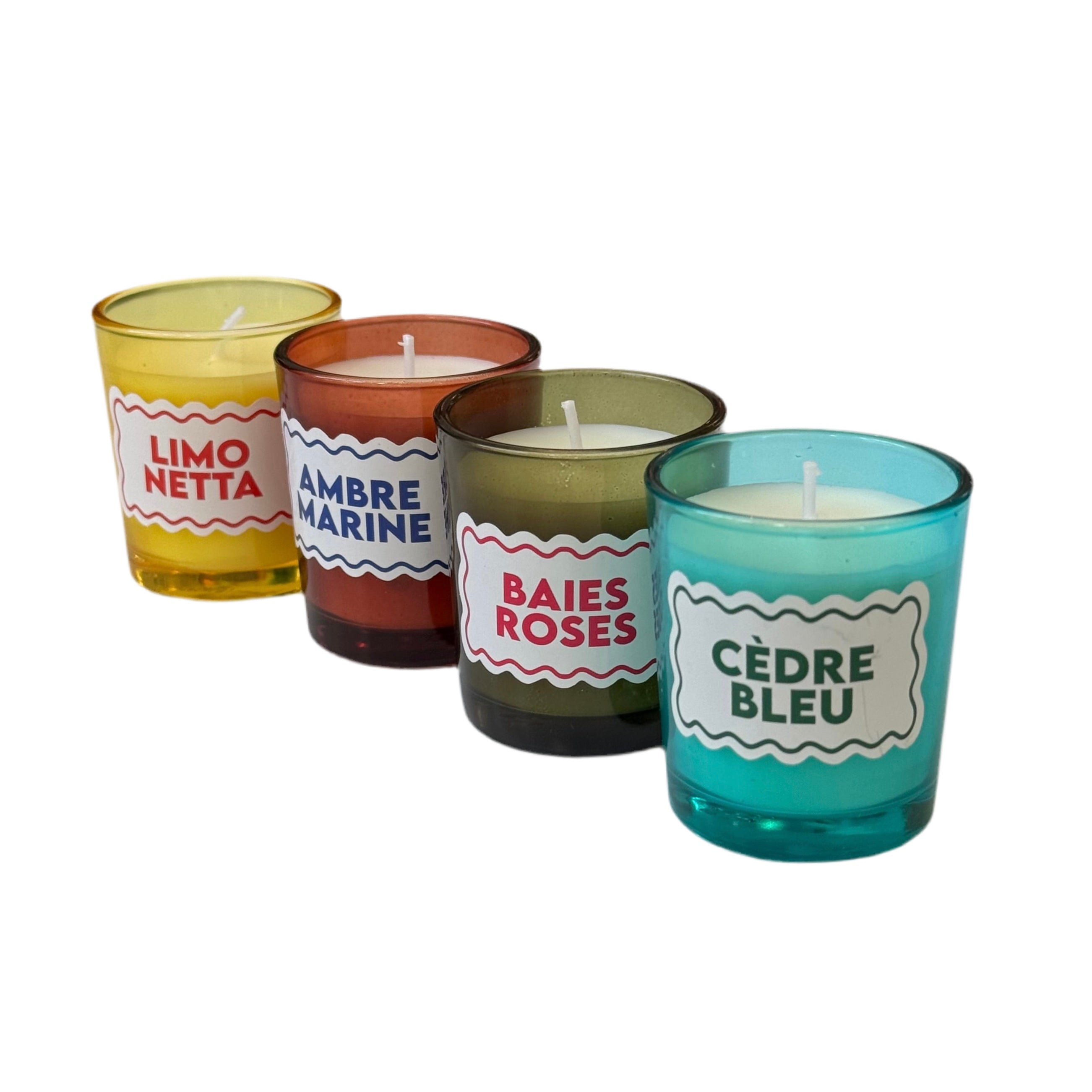 Nice set of four small scented candles in different scents Limonetta / Cédre Bleu / Ambre Marine / Baies Roses. Ideal gift when you want to surprise, but don't know which scent will be most appreciated.