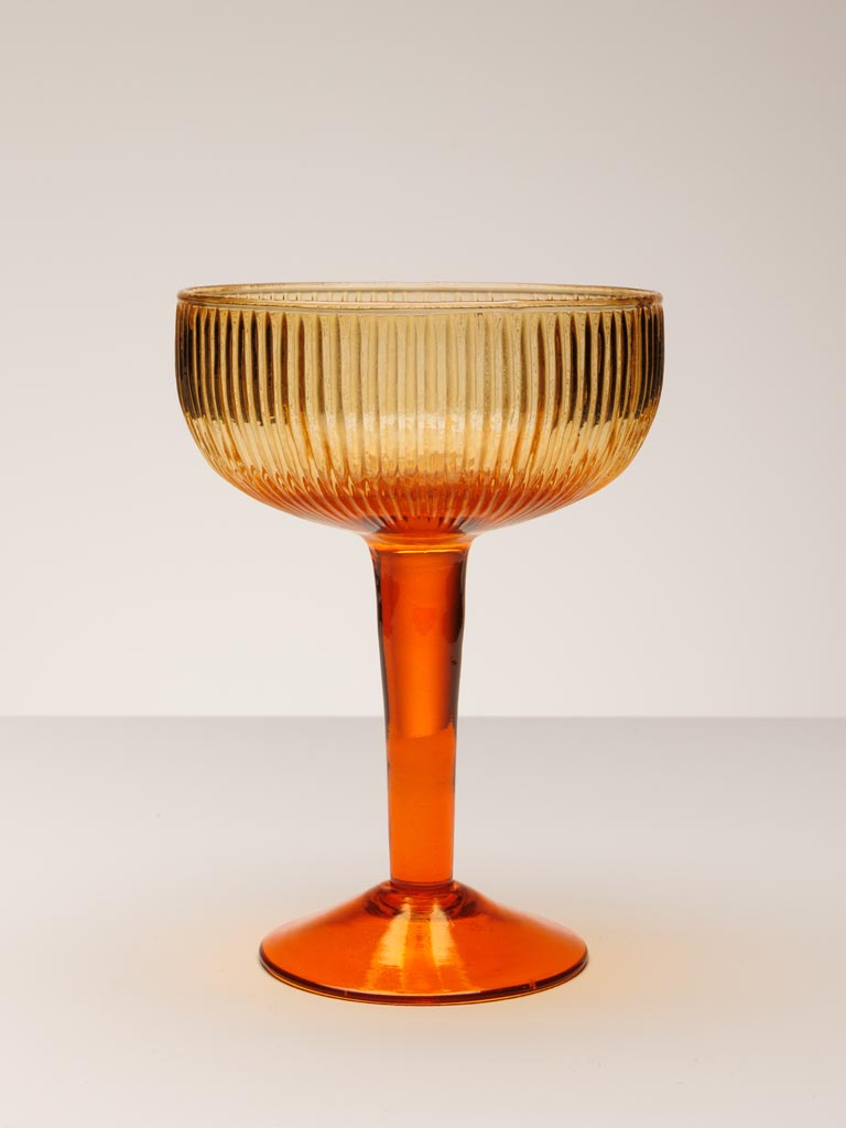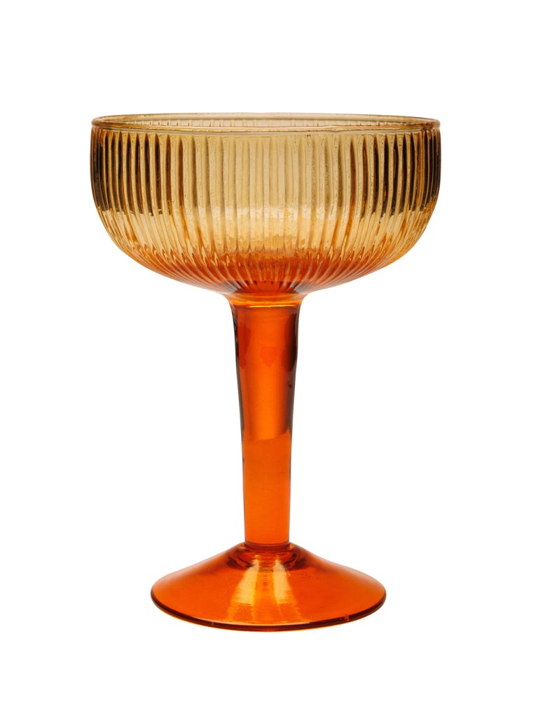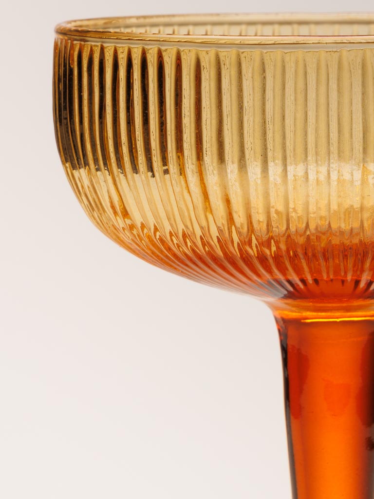 Bicolor Cocktail Glass Orange is an elegant glass with a beautiful color combination of yellow bowl and green base. The ribbed surface of the bowl gives the glass a vibrant shimmer and a tactile feel, while the sturdy base in deep green creates a harmonious contrast.