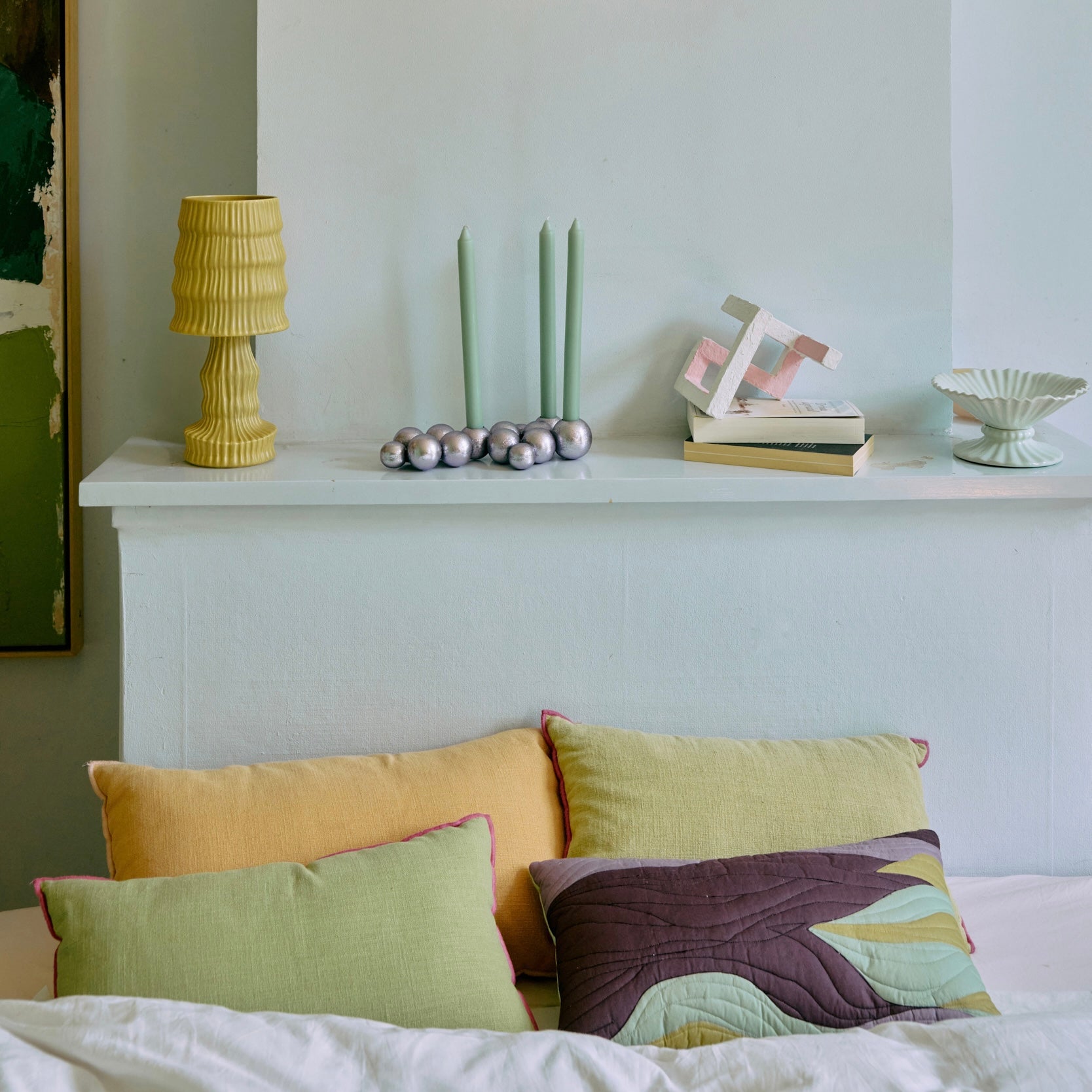 Med sitt mjuka trädstamsliknande mönster och skulpturala siluett leker denna bordslampa med rytm och upprepning. Glasyrens ljusa “ockra”-ton tillför värme och karaktär, medan lampans ton-i-ton-form ger en sammanhängande, nästan monolitisk känsla.