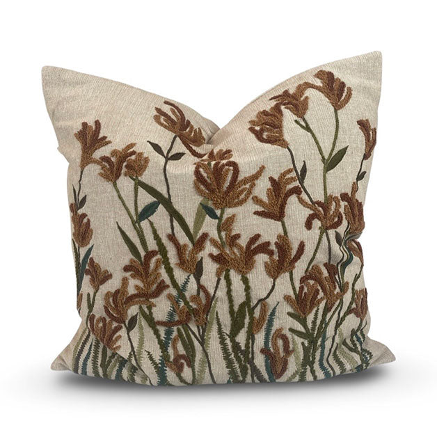 Beautiful cushion cover that brings to mind the peace and charm of nature. The embroidered pattern with flowers creates a playful but peaceful feeling - perfect for giving the sofa, armchair or bed a cozy and natural touch. A nice element in both rustic and modern interior design.