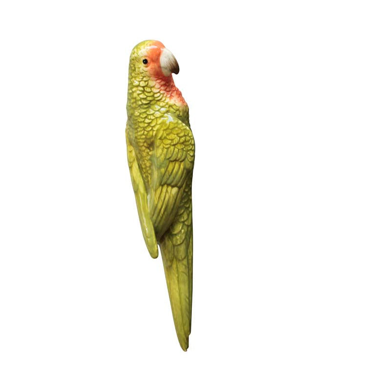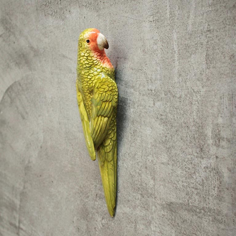 Denna dekorativa väggpapegoja i keramik är en färgstark och lekfull inredningsdetalj som tillför karaktär till väggen. Den detaljerade utformningen med relief i fjäderdräkten och de levande färgskiftningarna i grönt och orange ger figuren ett naturtroget och dekorativt uttryck. Papegojan är utformad för att monteras direkt på väggen och fungerar både som ett humoristiskt blickfång och som en exotisk accent i inredningen. Passar perfekt i vardagsrum, uterum, barnrum eller i miljöer där man vill skapa en personlig och livfull atmosfär.
