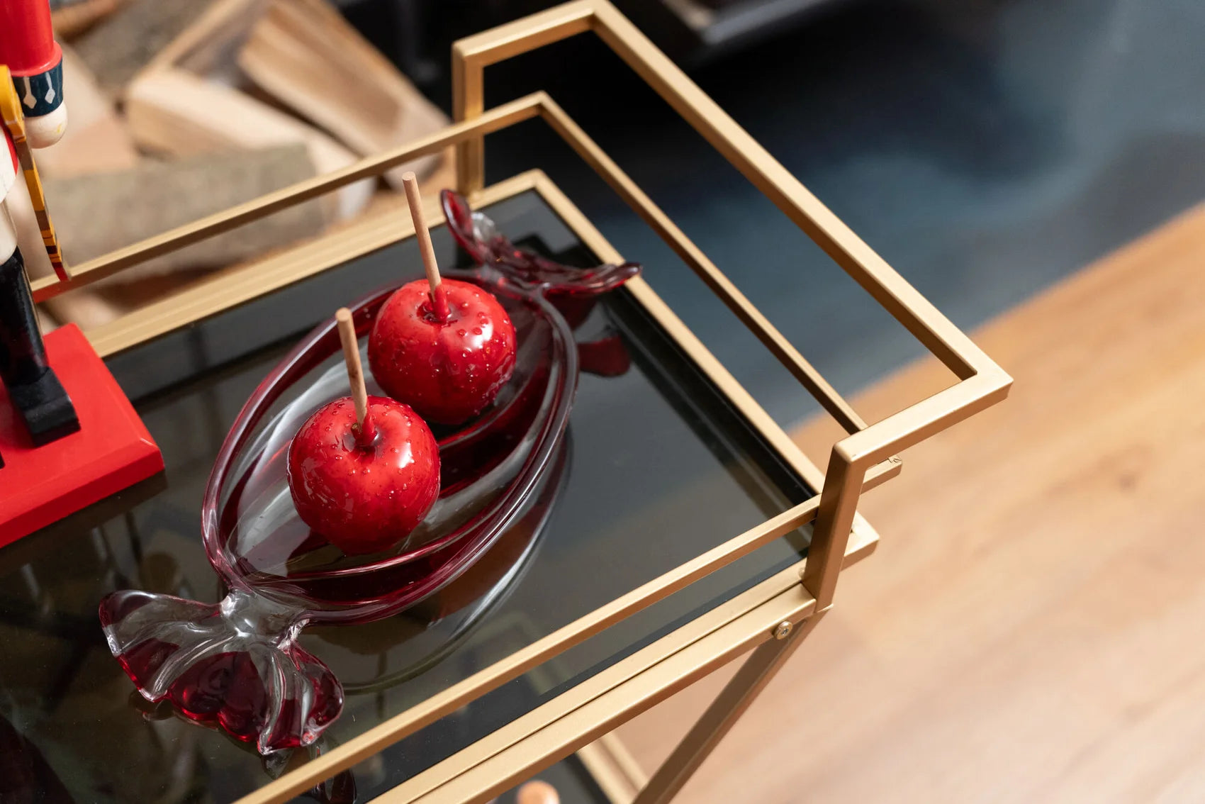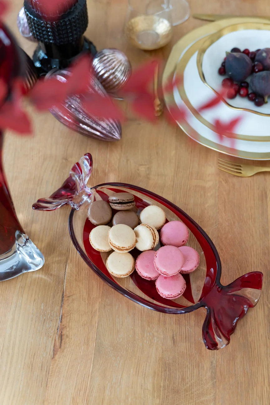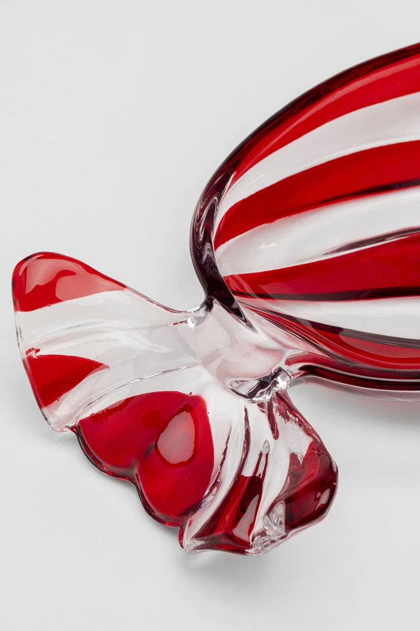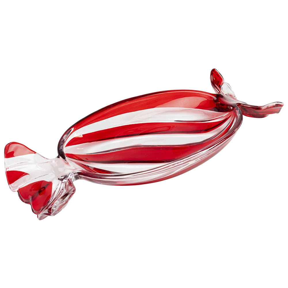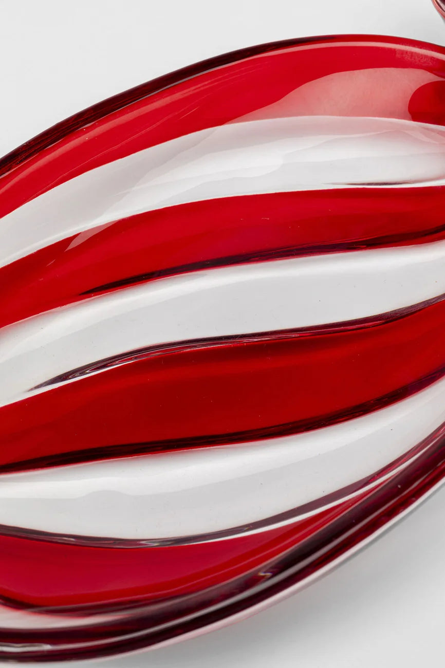 En skål som ser ut som en godisbit – bokstavligt talat. Denna rödrandiga skål i klart glas är formgiven som en inslagen karamell, vilket gör den till en oemotståndlig detalj för både festdukningar, juldekoration eller som lekfull kontrast i modern inredning. Med sin glänsande yta och skulpturala form är den lika delar funktion och humor.