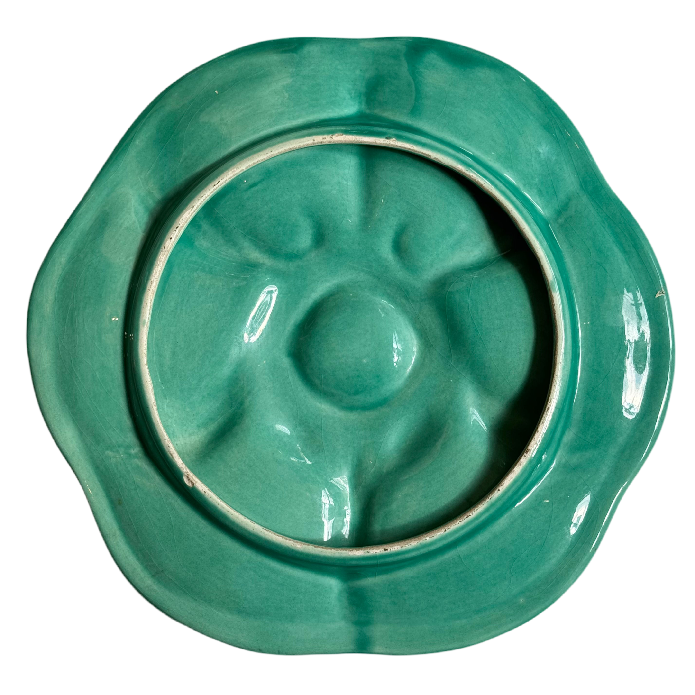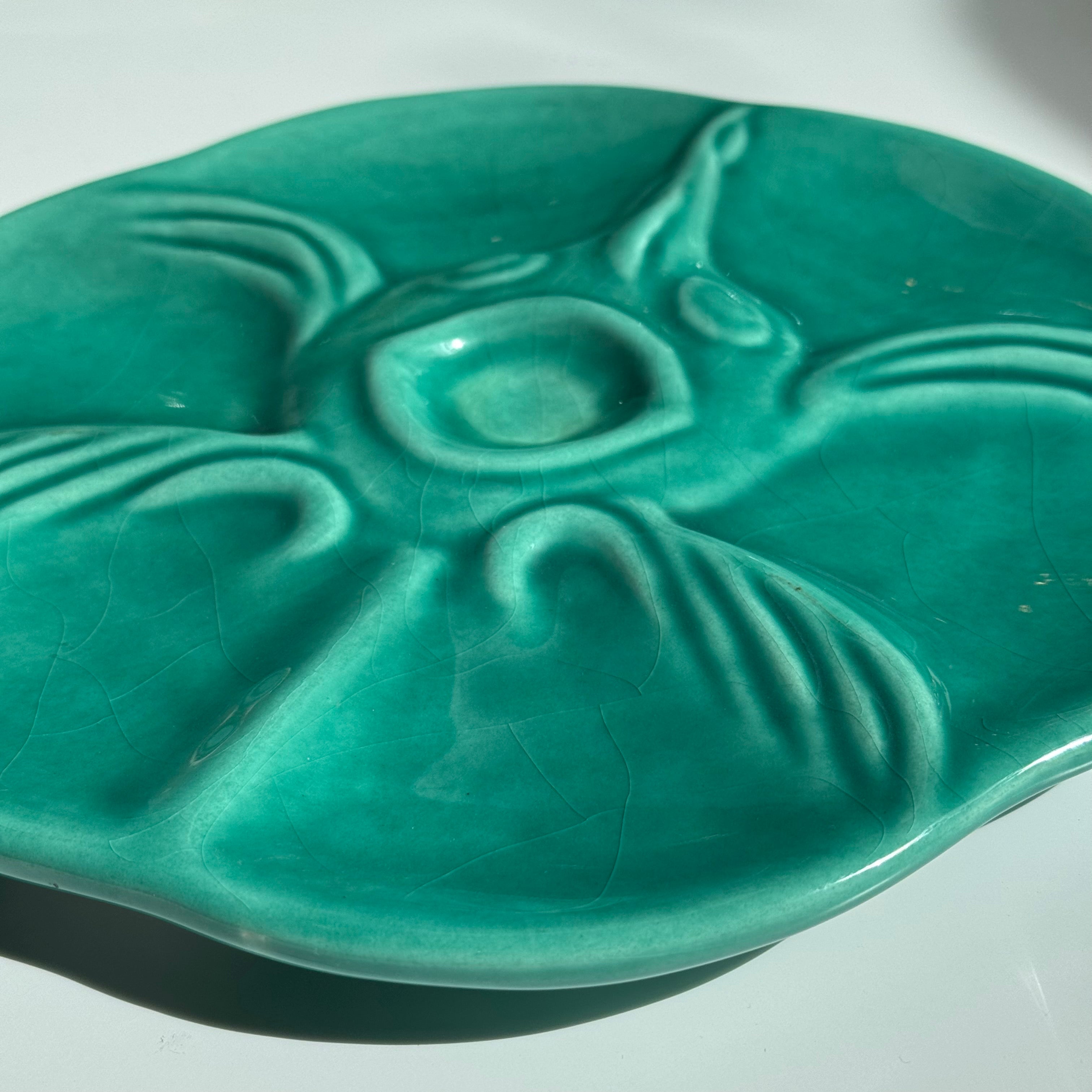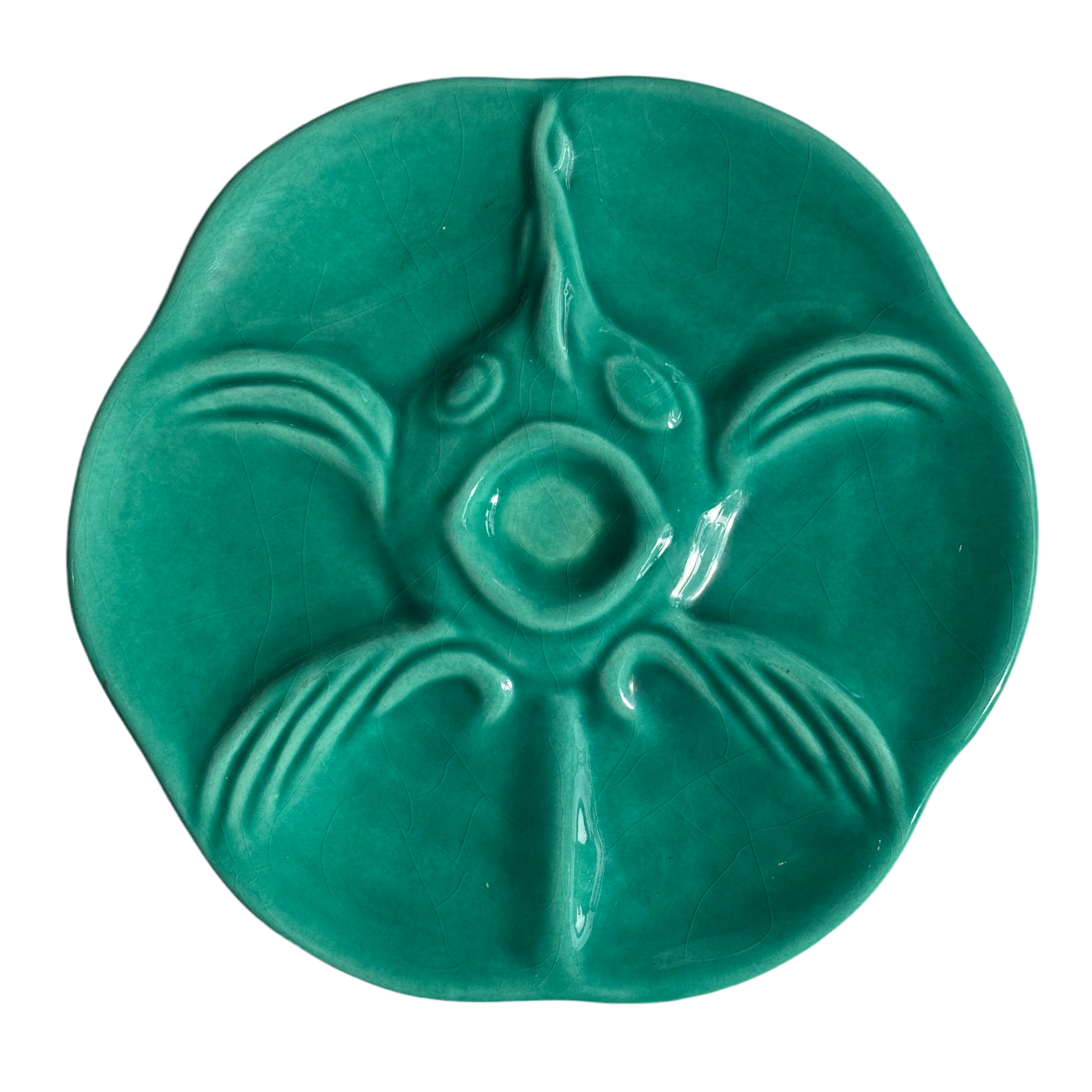 A stunning turquoise-coloured serving plate in glazed ceramic, decorated with a stylised fish – perfect for oysters, shellfish or small bites. The characteristic design and deep glaze give the plate an artistic and playful expression. The fine crackling of the glaze testifies to its age and charm.