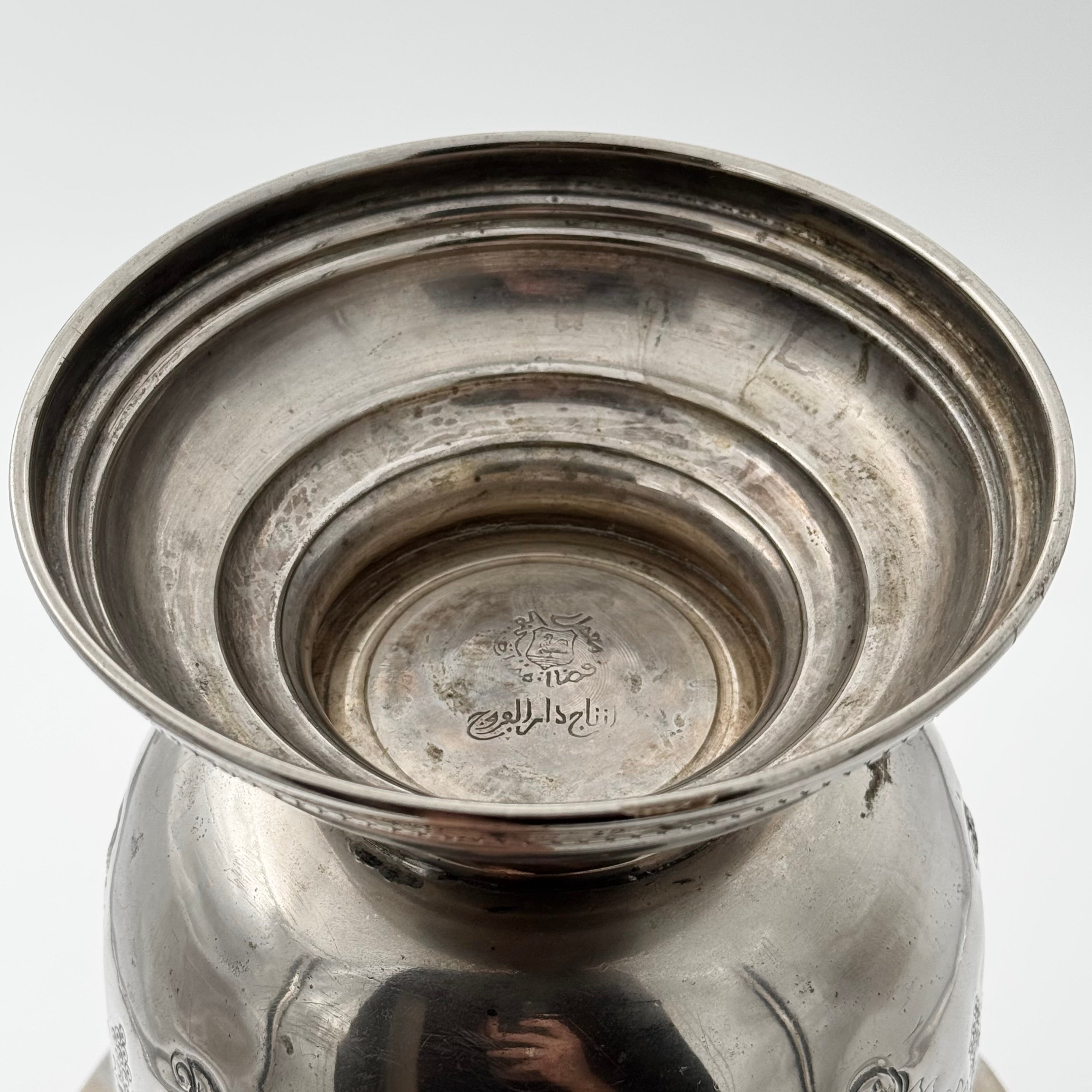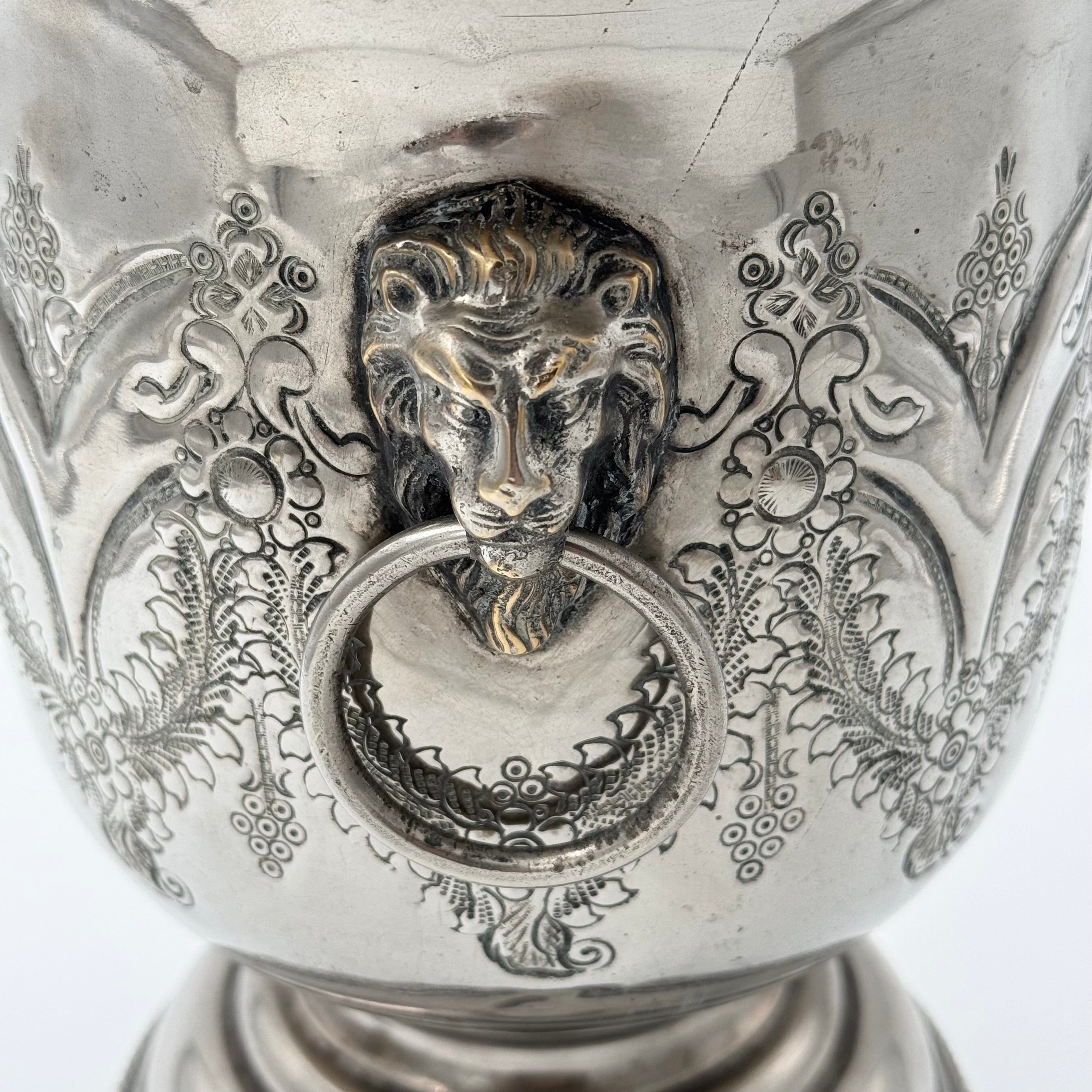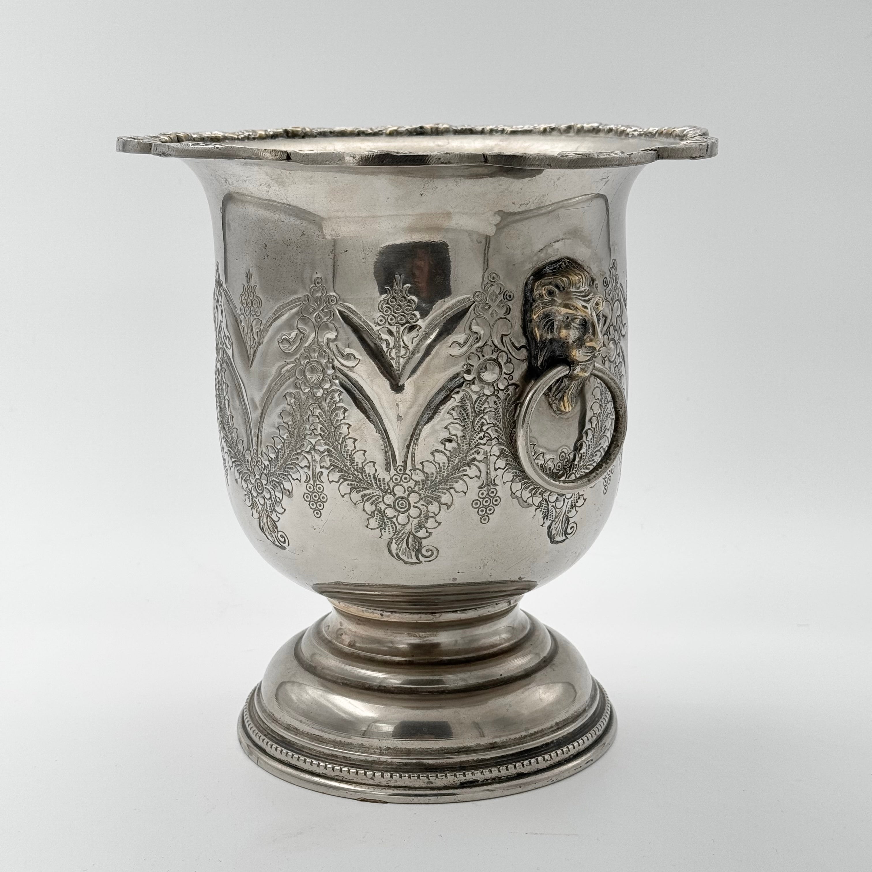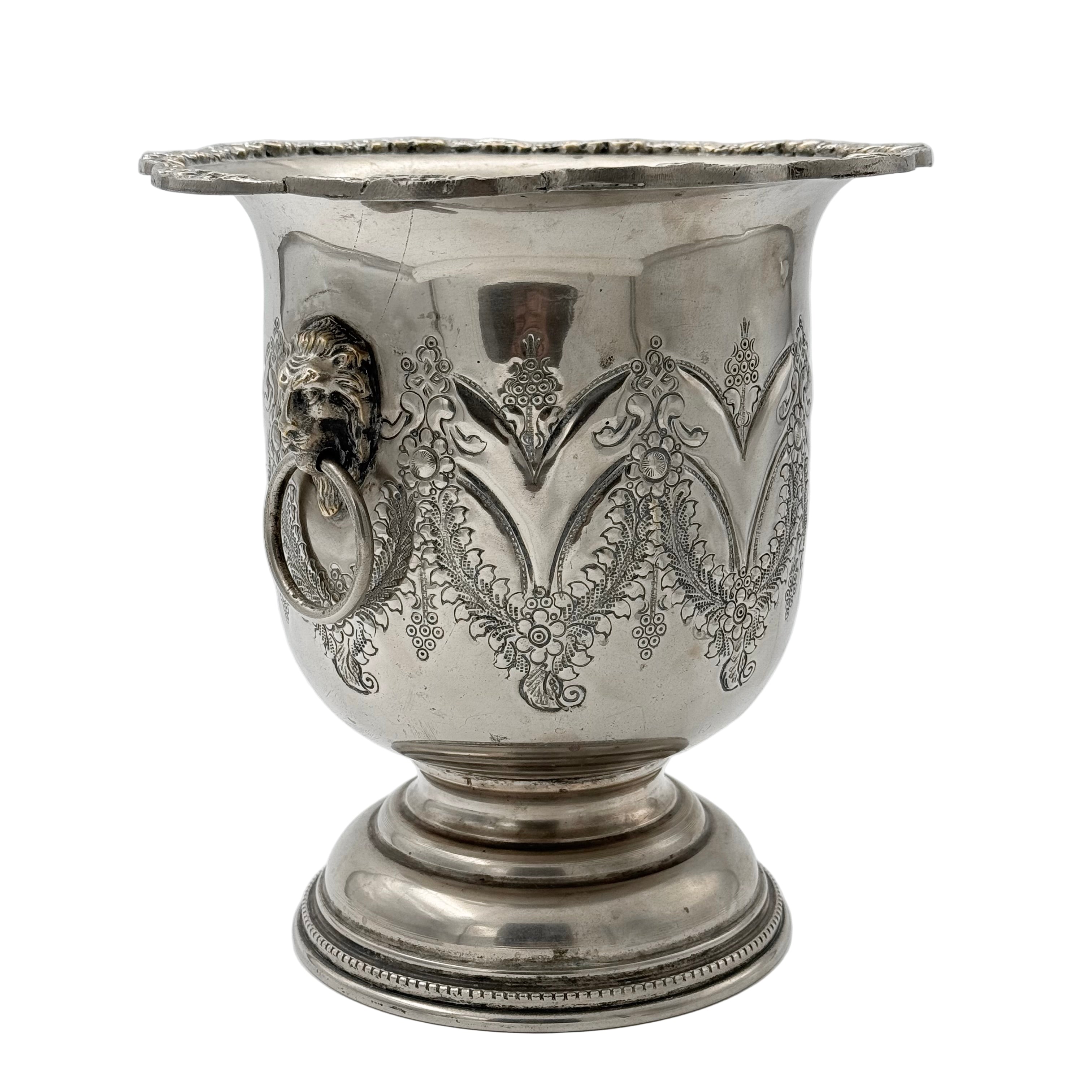 Elegant champagne bucket with a beautifully embossed relief pattern and decorative handles in the form of classic lion motifs. The bucket also bears an Arabic/Persian stamp, which suggests an origin with a craft touch and cultural character. A decorative object that combines function with timeless elegance - perfect for serving or as a stylish interior detail.