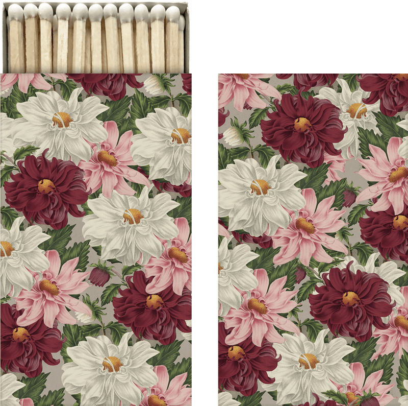 An elegant and decorative matchbox filled with long matches. With its beautiful motifs, the box is not only practical but also a small interior detail to leave out in front.