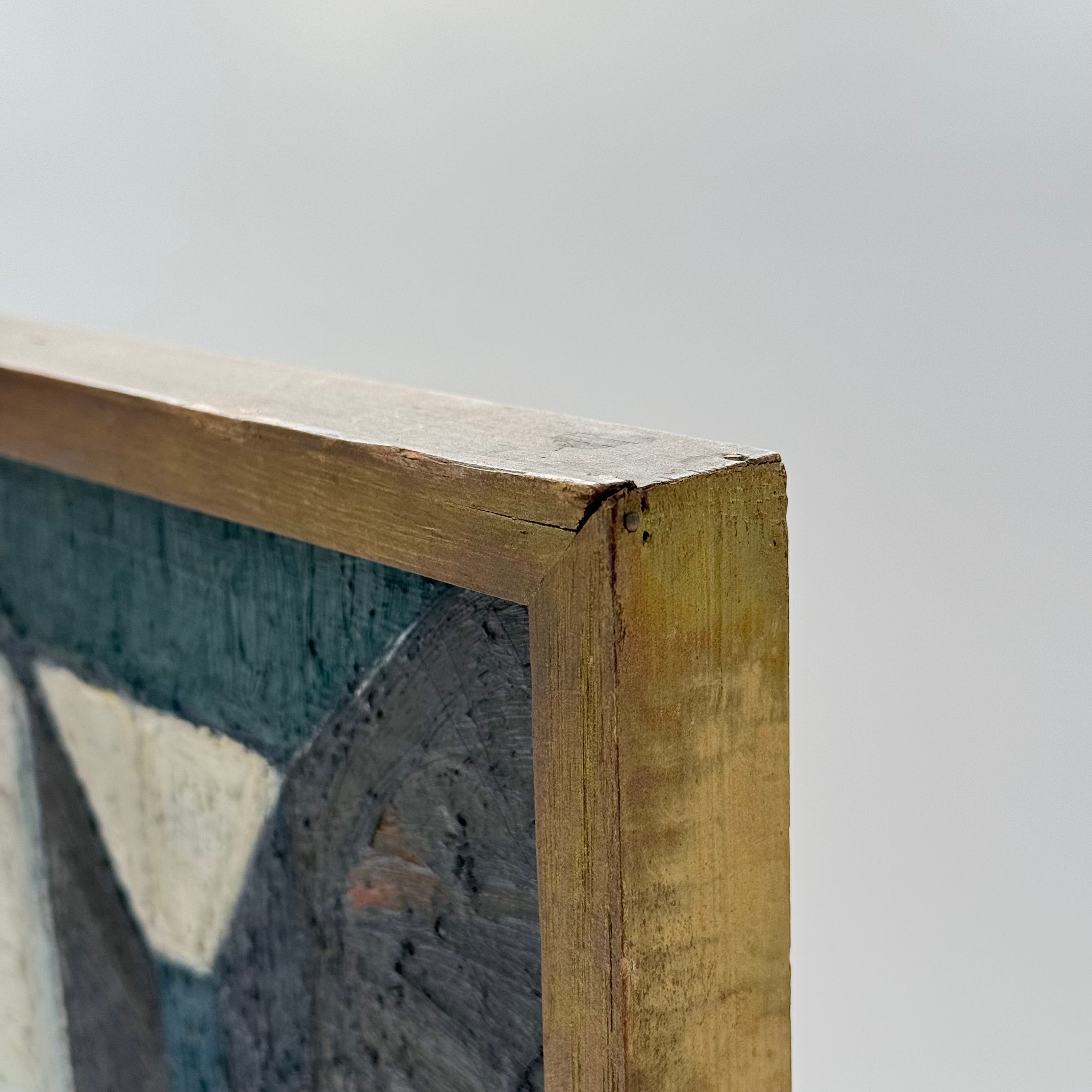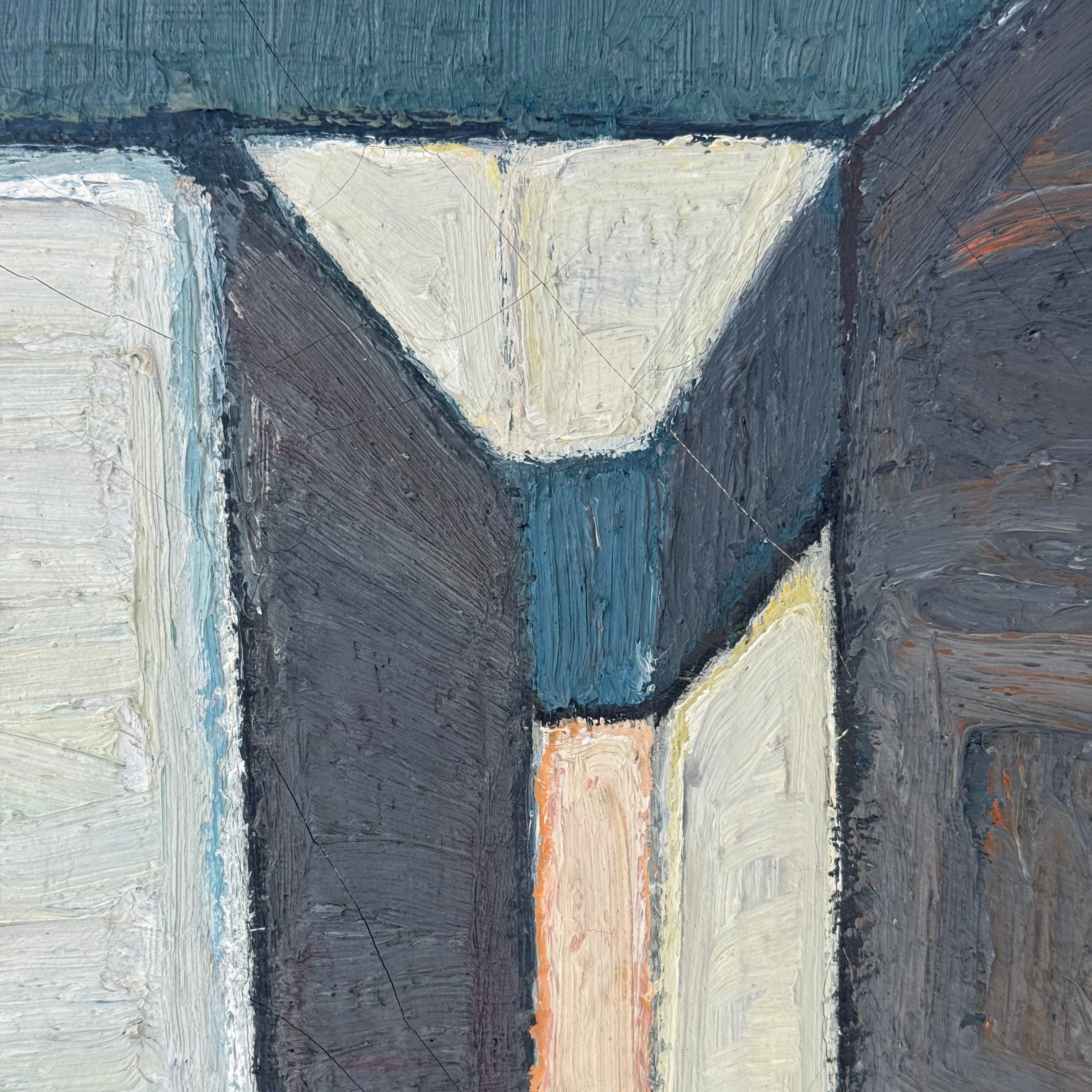 An oil painting by Max Gregor Carlsson (1914–1996) with an abstract composition that is characterized by a fantastic depth and balance in the structure. The brushwork and the toned-down blue tones interact in a way that creates a calm but at the same time dynamic whole, where the viewer is invited into the spatiality of the painting.