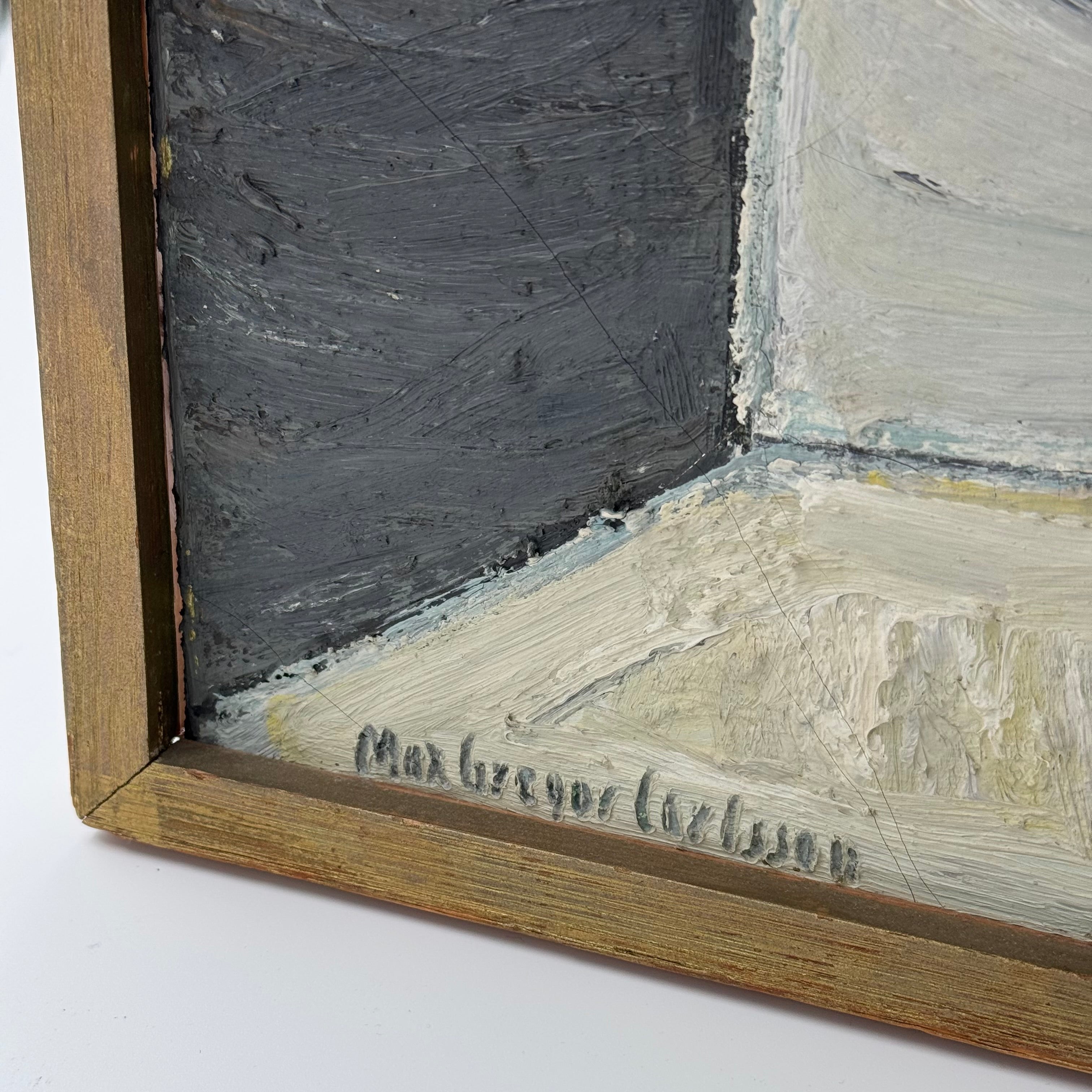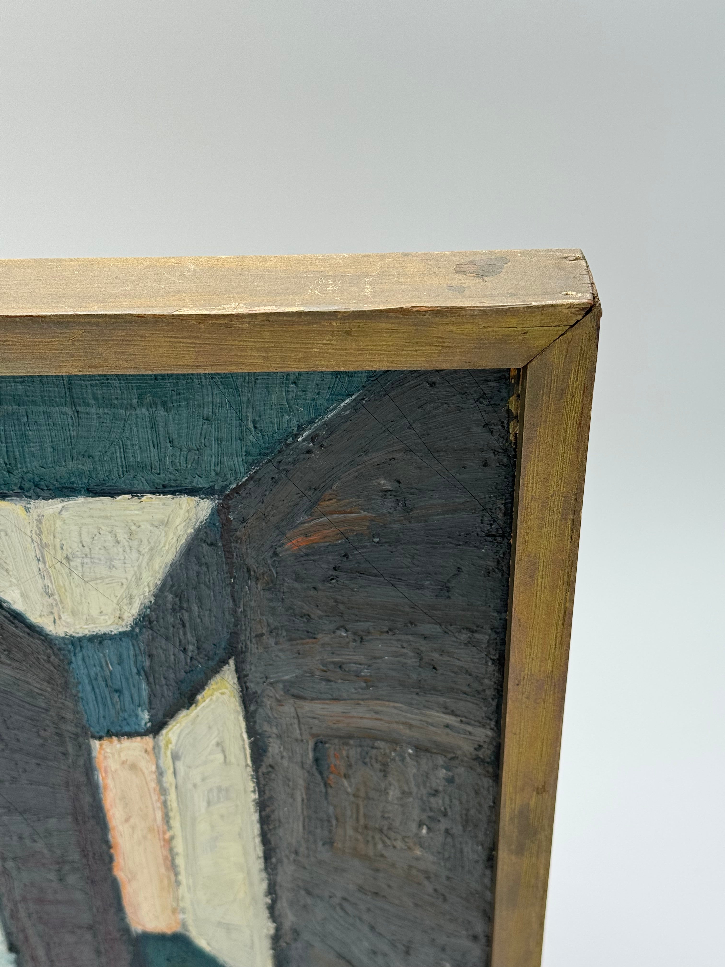 The work is signed by the artist and framed in a simple wooden frame. There is some cracking, but the painting is otherwise in good condition and appears to be a fine example of Carlsson's artistic expression during the 20th century.