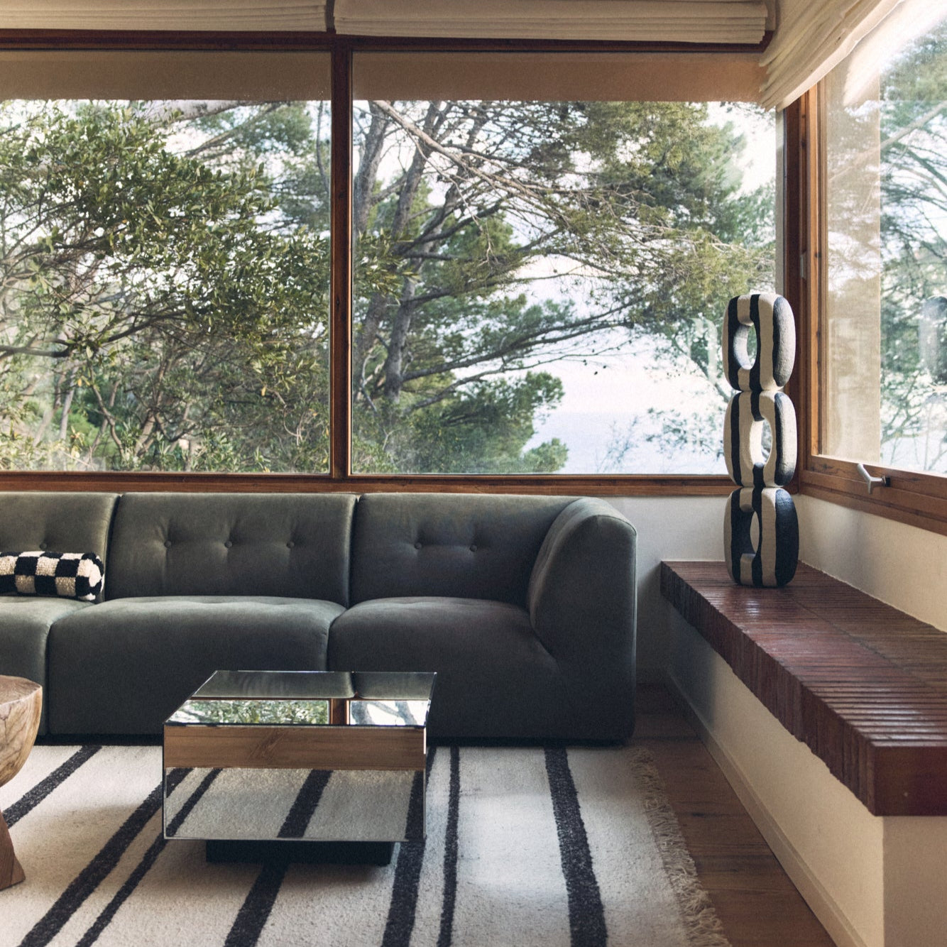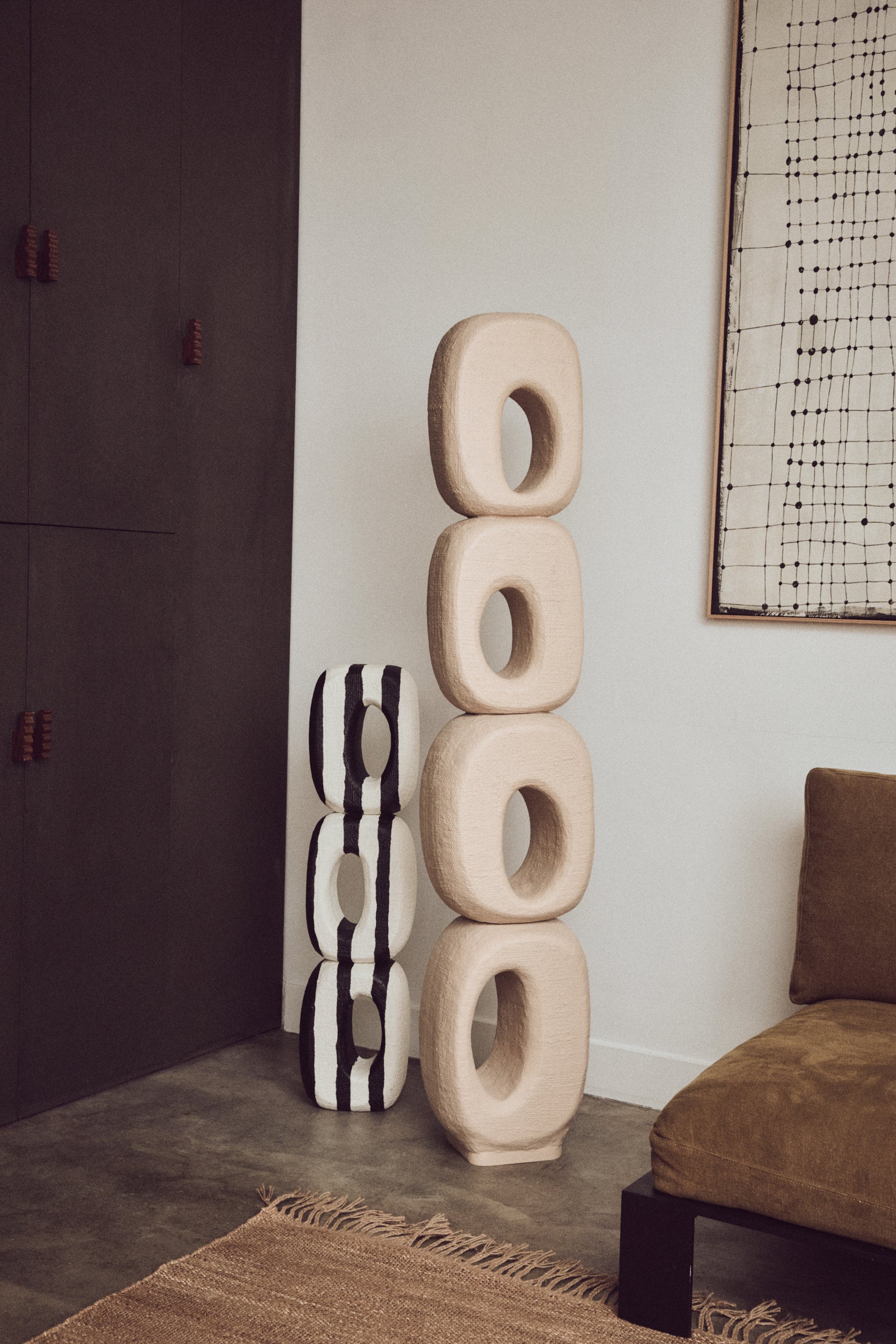 Monochrome sculpture in braided palm that combines the organic feel of natural materials with a modern expression in graphic, vertical stripes. A stylish and easy-to-place interior detail that adds character to smaller rooms and is suitable for those who want to balance timeless craftsmanship with contemporary aesthetics.