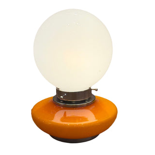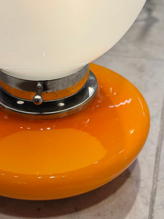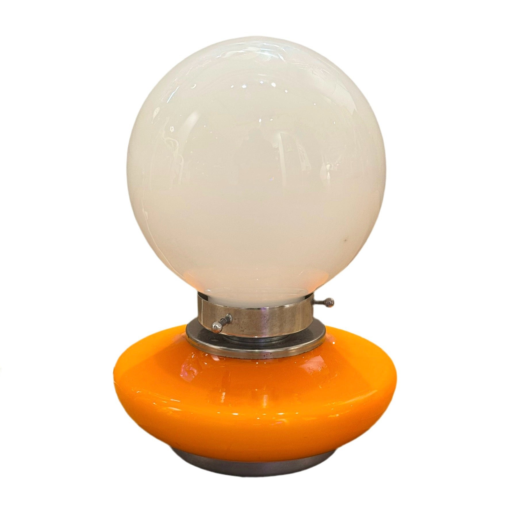 Den här karaktärsfulla bordslampan fångar essensen av 70-talets Space Age-design med sin futuristiska form och livfulla färgsättning. Den rundade kupan i mjölkigt vitt Muranoglas balanseras elegant på en klotformad fot i klarglänsande orange glas – en färgpalett och siluett typisk för den rymdinspirerade estetiken från denna epok.