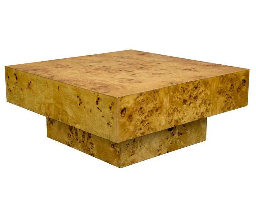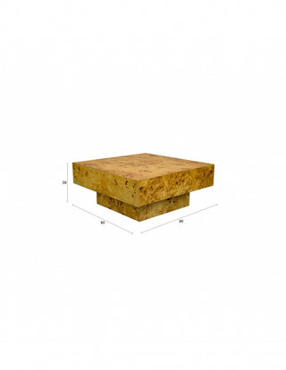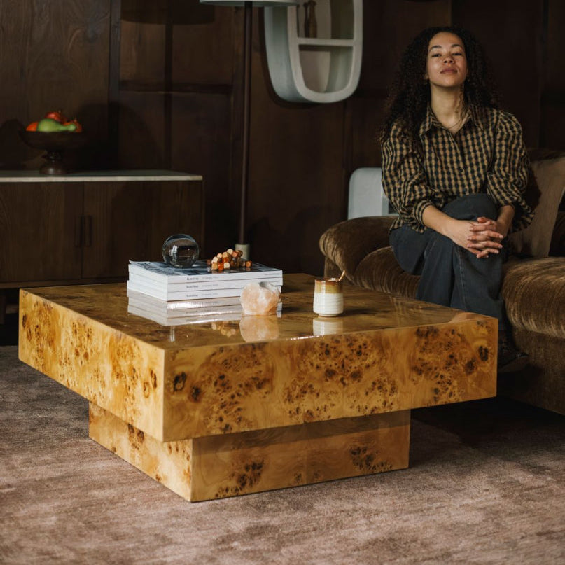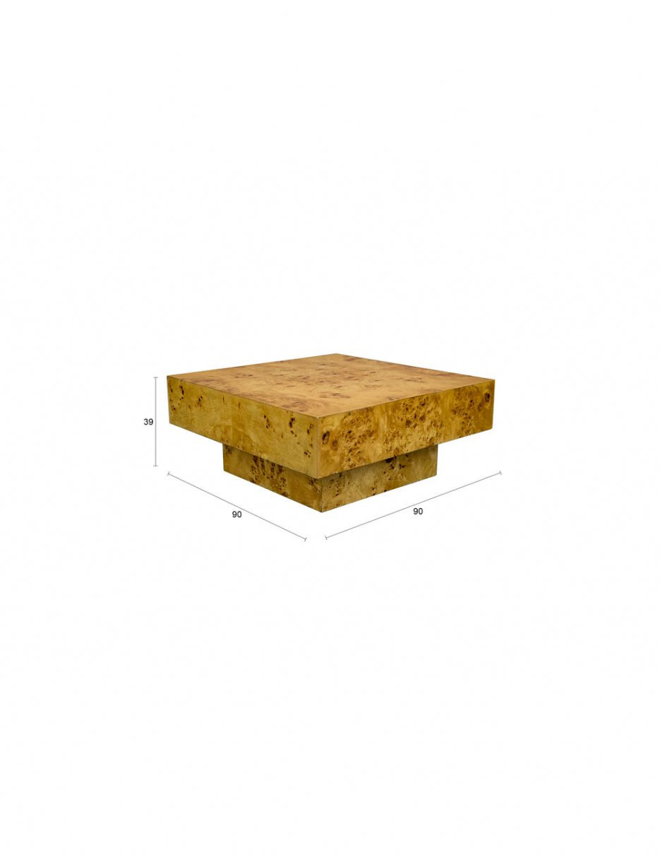 Ett stilrent soffbord i 70-talsanda som ger ditt hem en varm och inbjudande känsla. Den kvadratiska designen ger ett starkt uttryck, medan det dekorativa rotfanéret i kombination med en högblank finish tillför både elegans och personlighet.