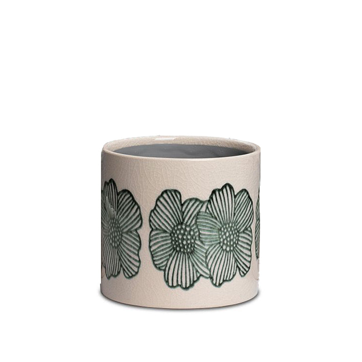 Cylinderkruka dekorerad med gröna blommor.