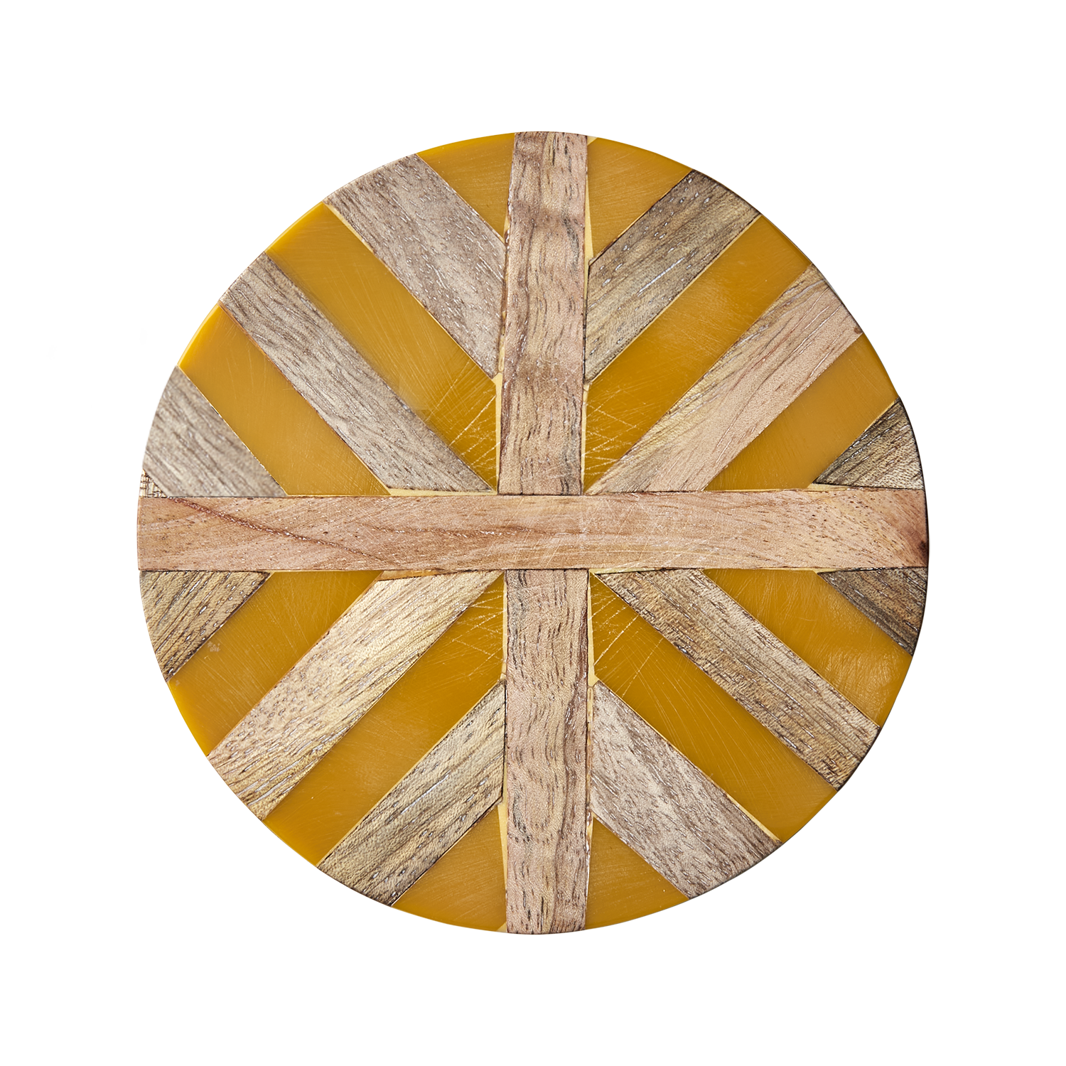 Glasunderlägget Nico är ett intarsia-inspirerat glasunderlägg där traditionellt hantverk möter modern lekfullhet. Det är tillverkat i trä och resin – två material som tillsammans skapar ett dekorativt mönsterspel där den solgula tonen kontrasterar vackert mot träets naturliga ådring. Det runda formatet och den släta ytan gör det både praktiskt och dekorativt, perfekt för allt från morgonkaffet till kvällsdrinken.