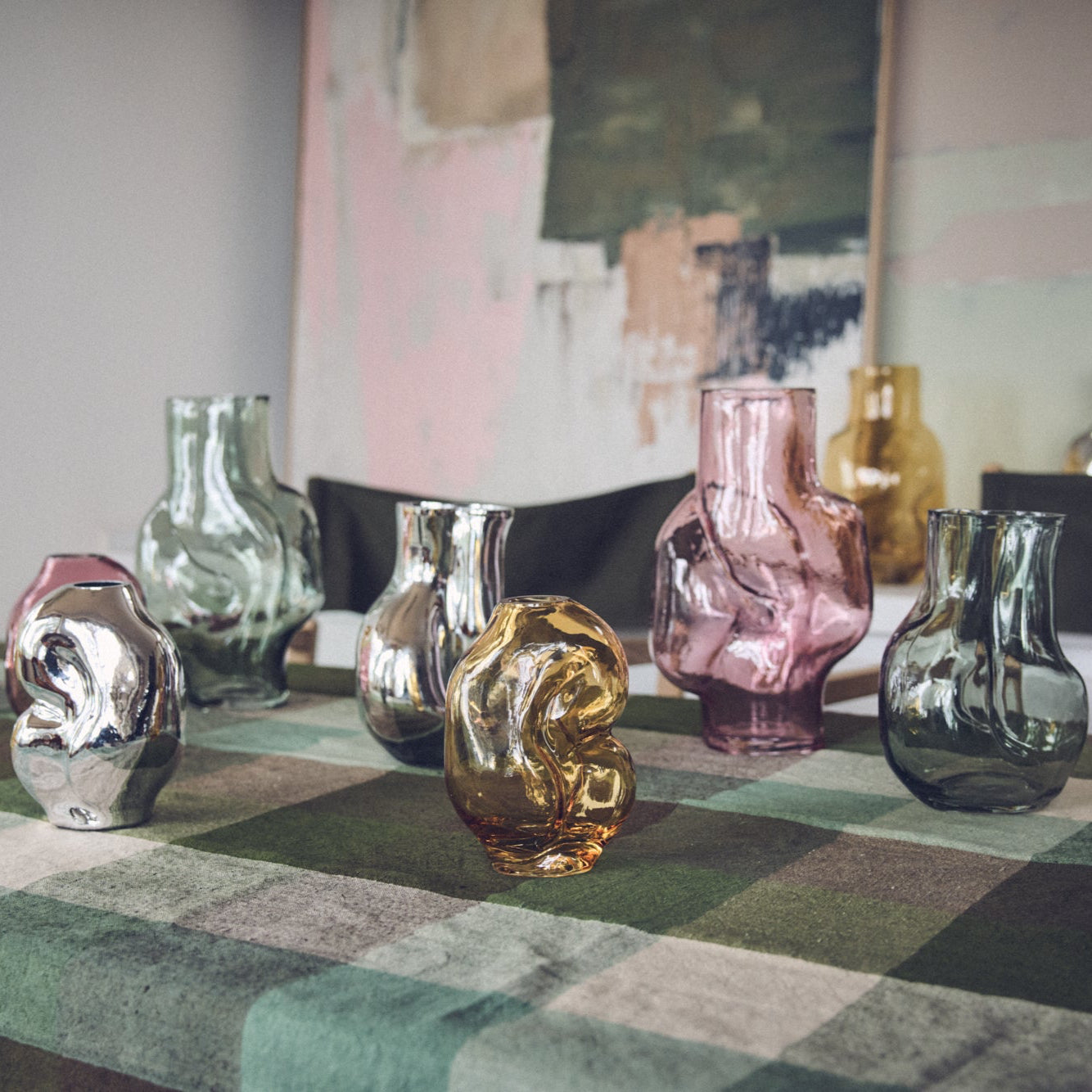Gör ett starkt intryck med denna glasvas. Dess spegelblanka yta och organiska form förenar naturens mjuka rörelser med en modern och stilren design. Använd den som ett iögonfallande blickfång på bordet eller kombinera med andra vaser för en spännande lager-på-lager-effekt. Perfekt för både färska blommor och som en skulptural inredningsdetalj.