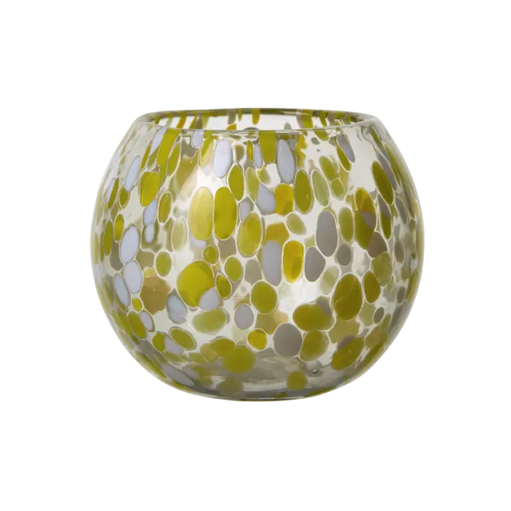 Ljuslykta i glas med ett lekfullt gulprickigt mönster.