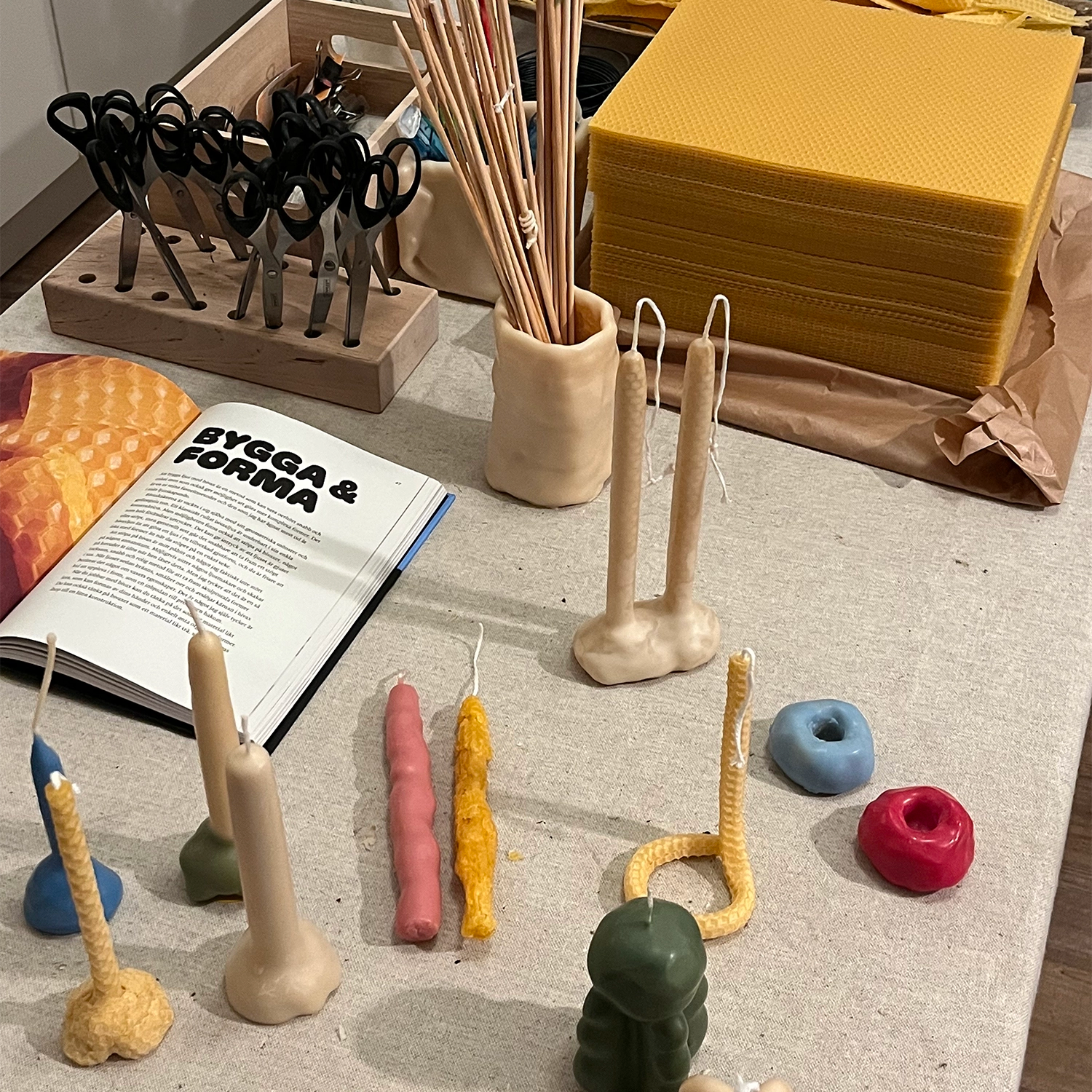 I sina workshops guidar Anna deltagarna med ett lugnt, tydligt och inspirerande förhållningssätt. Här får både nybörjare och erfarna kreatörer möjlighet att utforska bivaxets möjligheter, steg för steg, i en atmosfär som uppmuntrar lekfullhet, nyfikenhet och skaparlust.